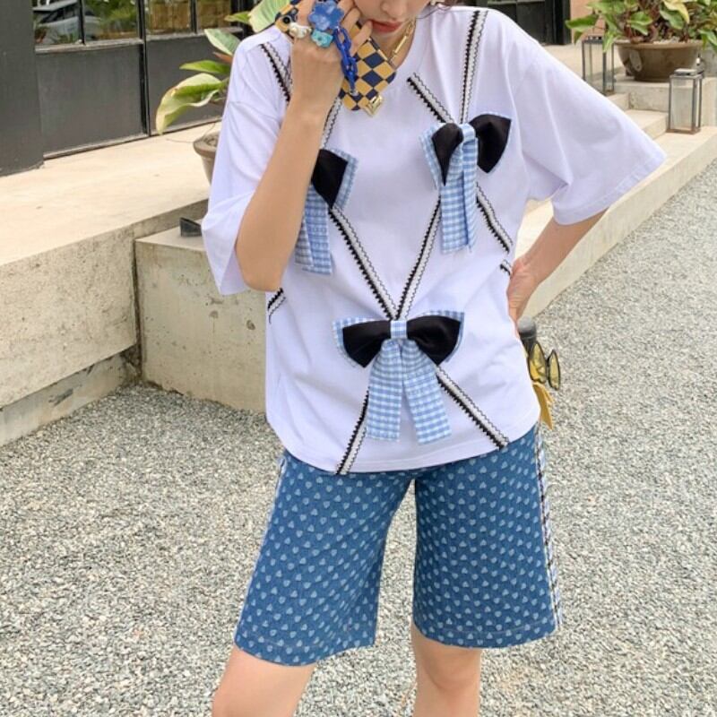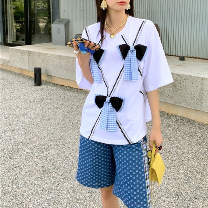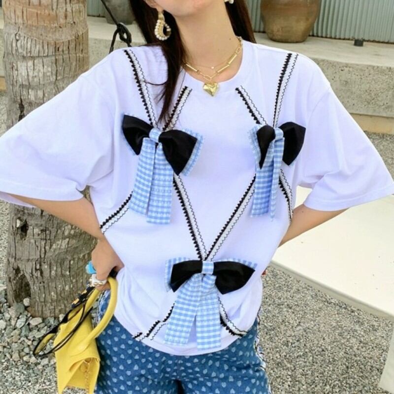 スイートで可愛らしいリボンがついた白Tシャツ✨