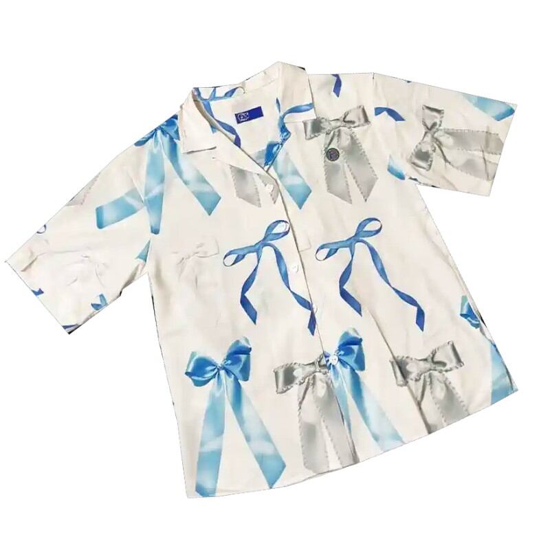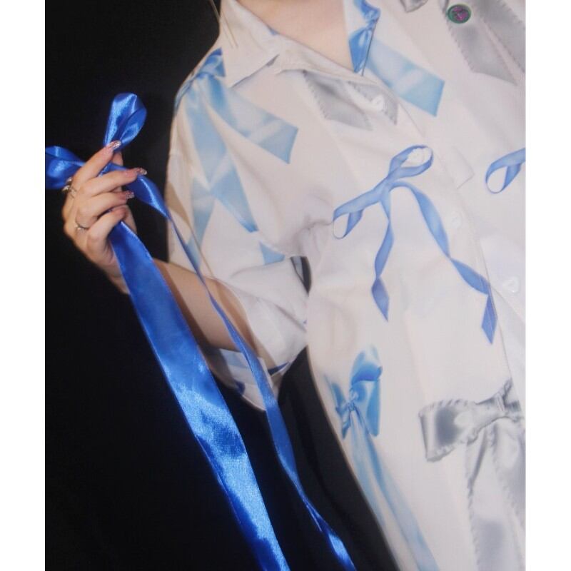 girly cute blue ribbon print milky white shirt 1023