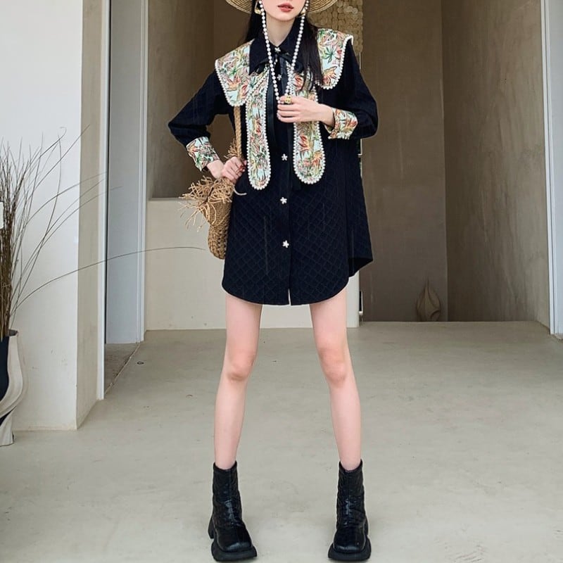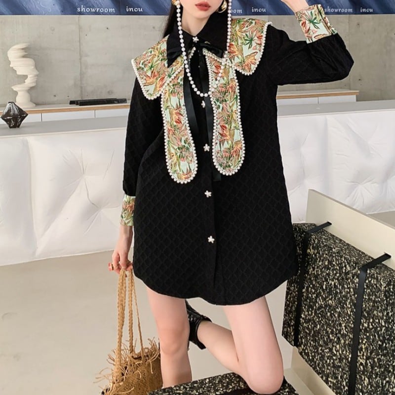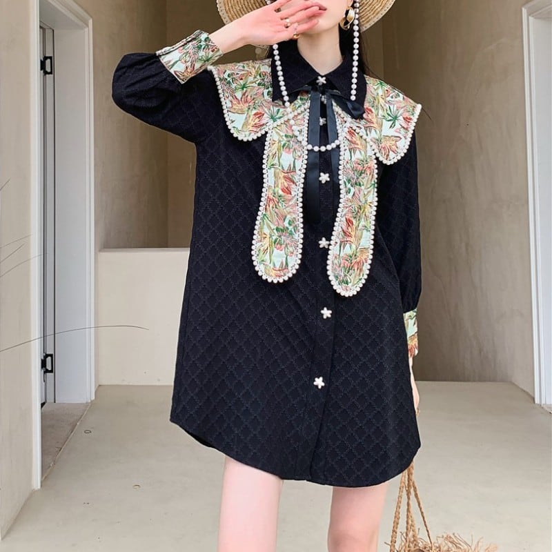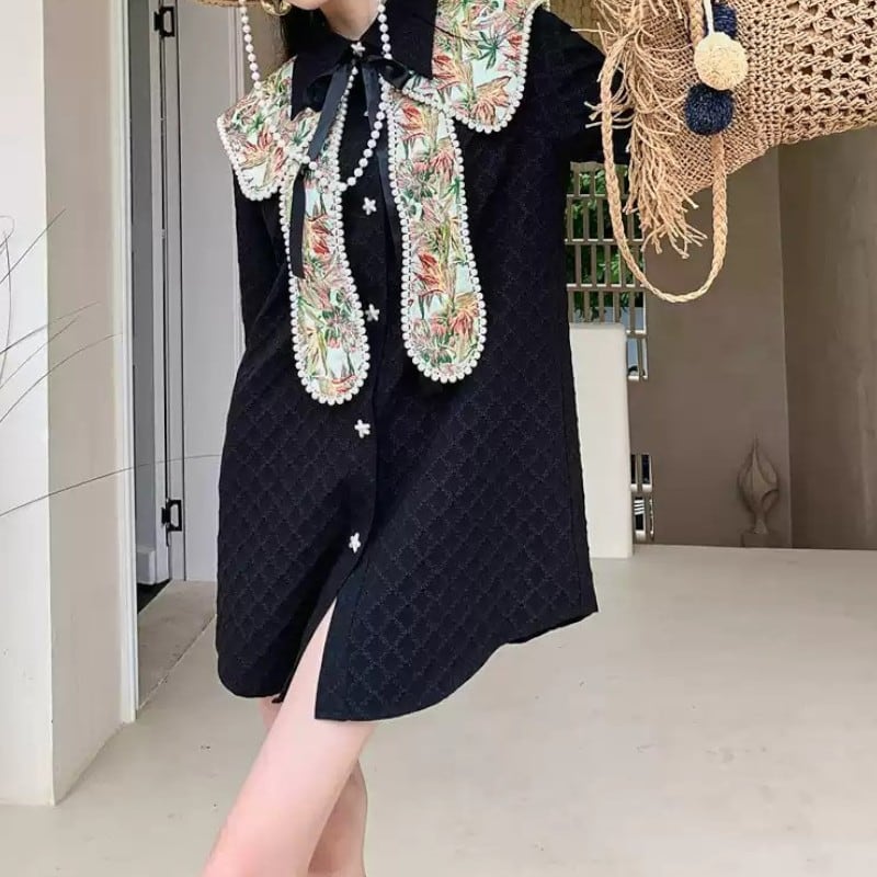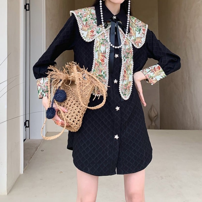 取り外しできるパール風ビーズがついた花柄襟がついたおしゃれなシャツワンピース✨