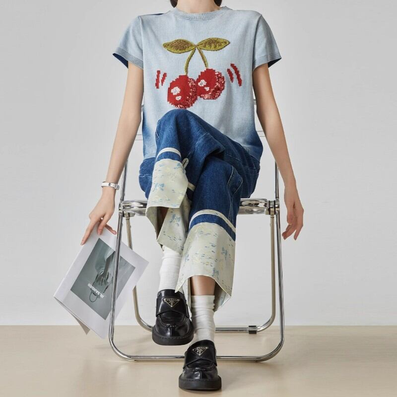 キュートなチェリーが描かれたサマーニットトップス✨