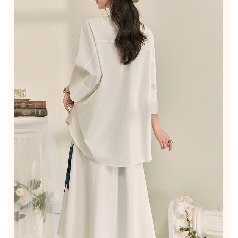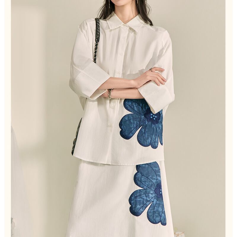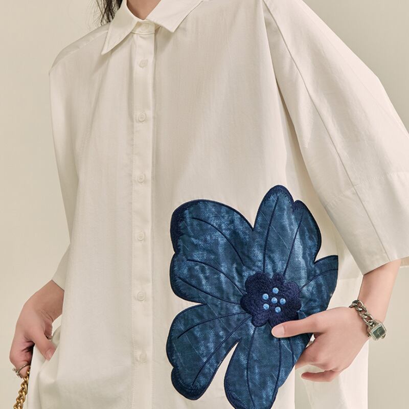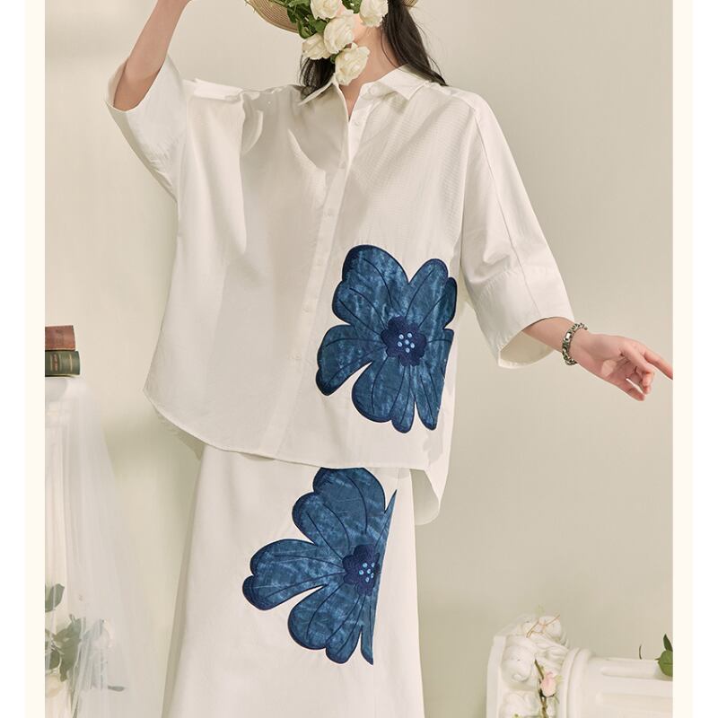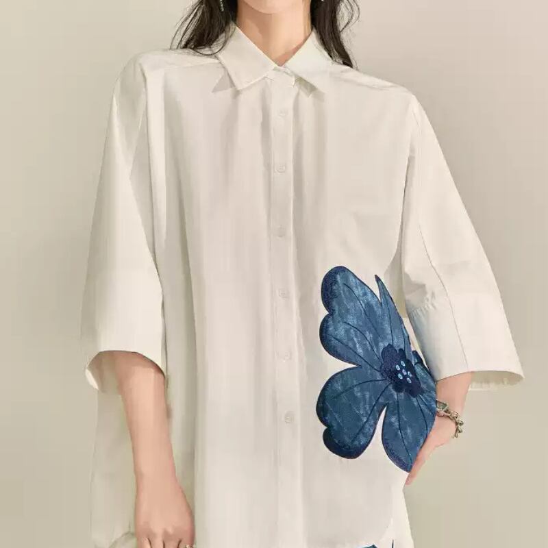 存在感抜群♪♪美しく大きな青い花が咲いている白ブラウス✨