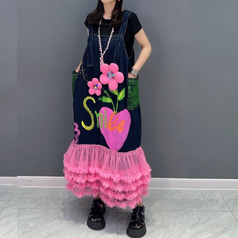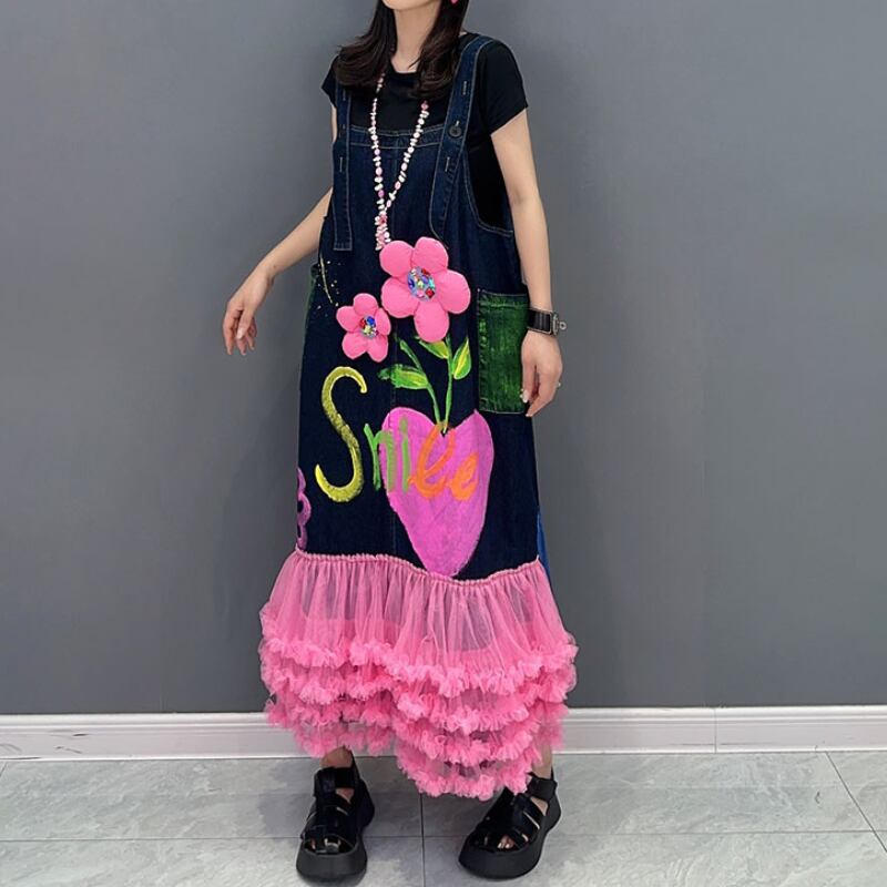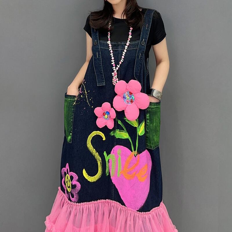 存在感抜群♪大きな大きなピンクのお花とメッシュの裾がキュート♡デニムサスペンダースカート✨