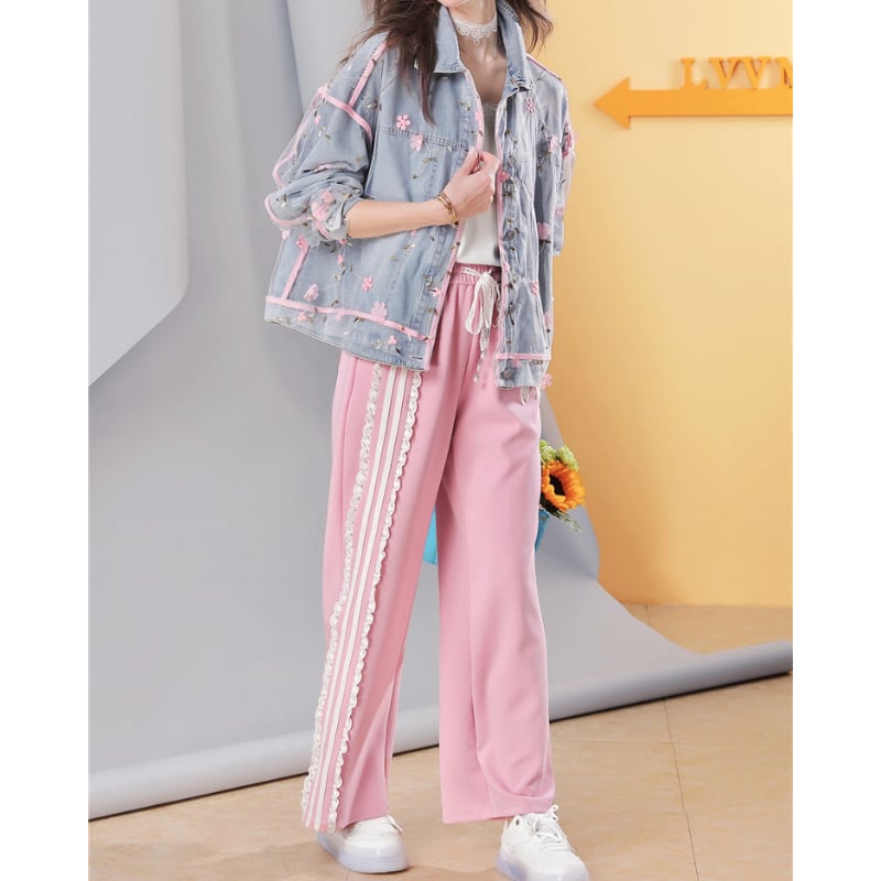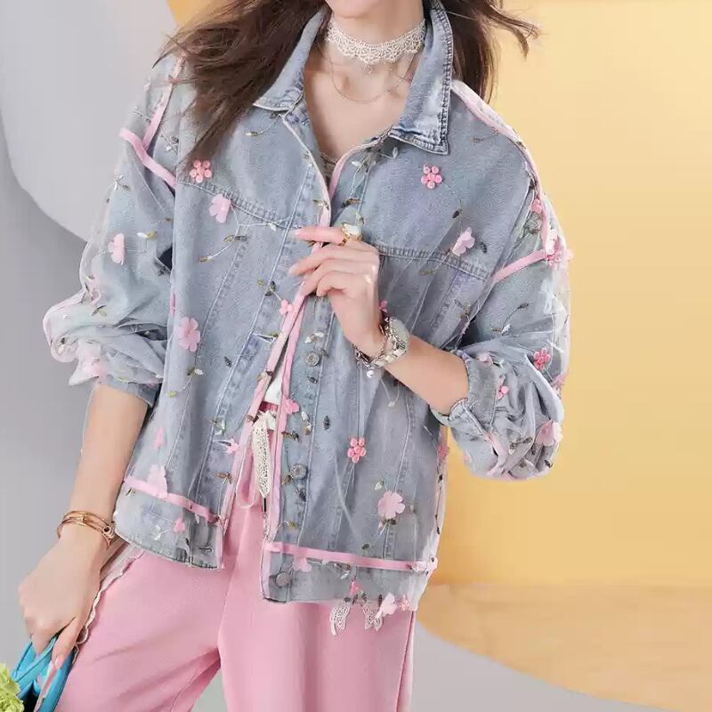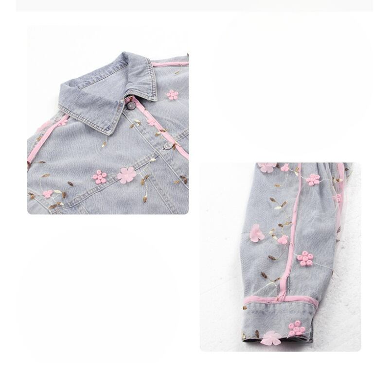 girly cute mesh embroidery pink flower denim jacket 0132