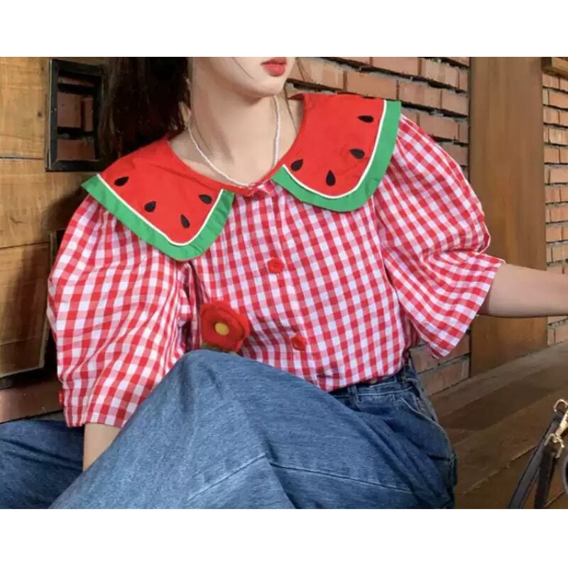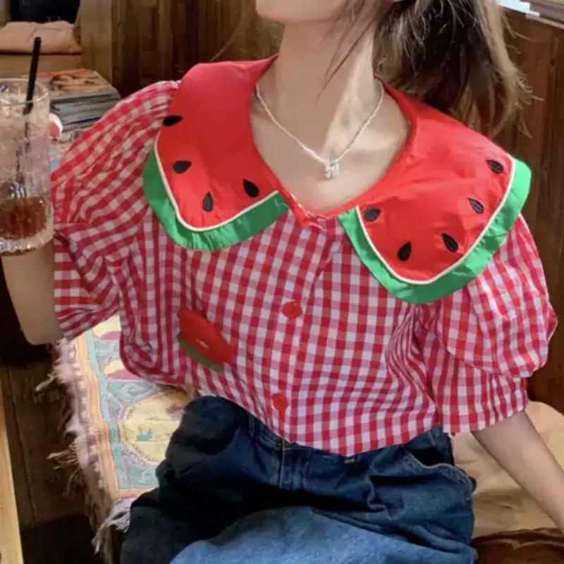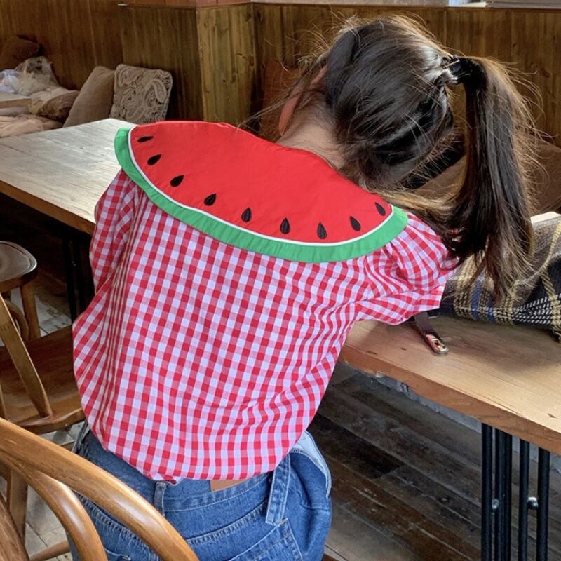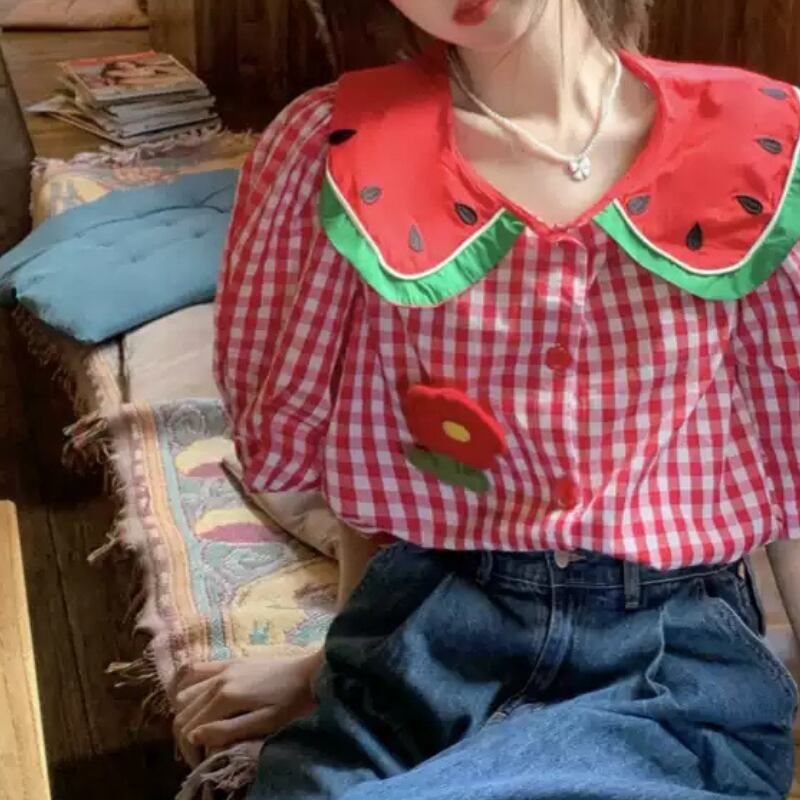 可愛らしいスイカの襟が素敵なチェック柄のブラウス✨
