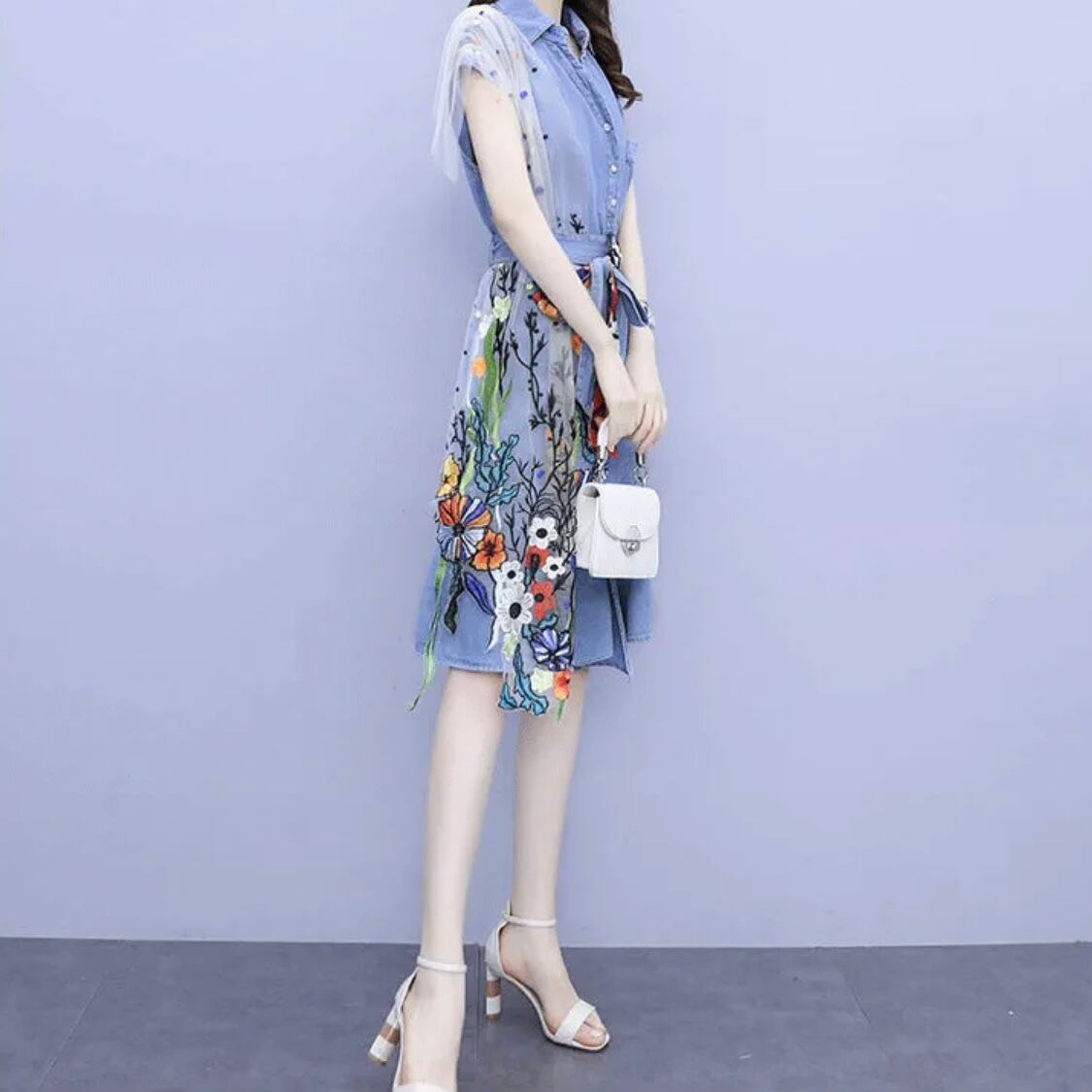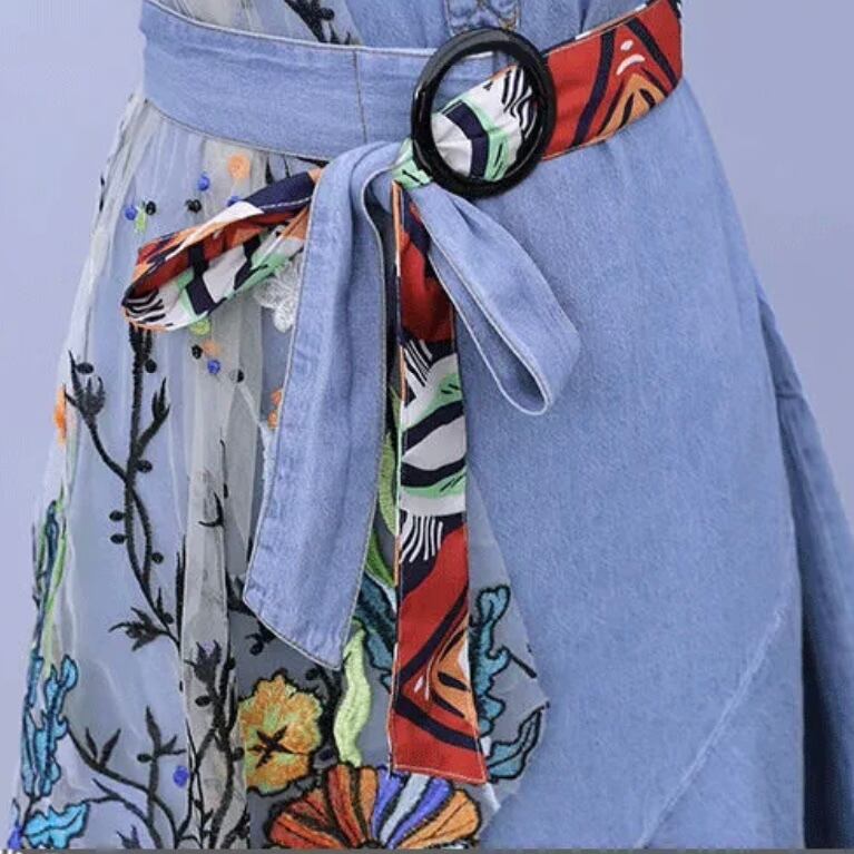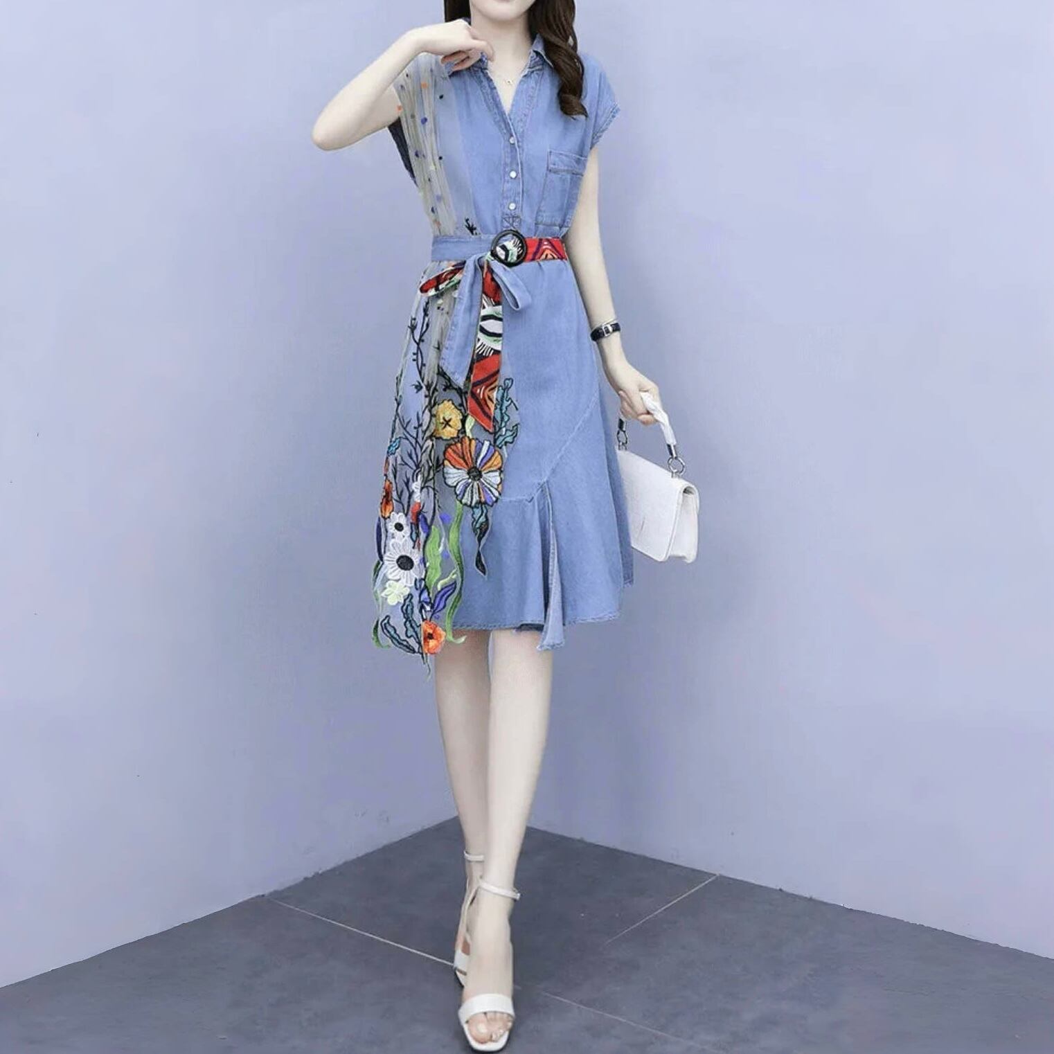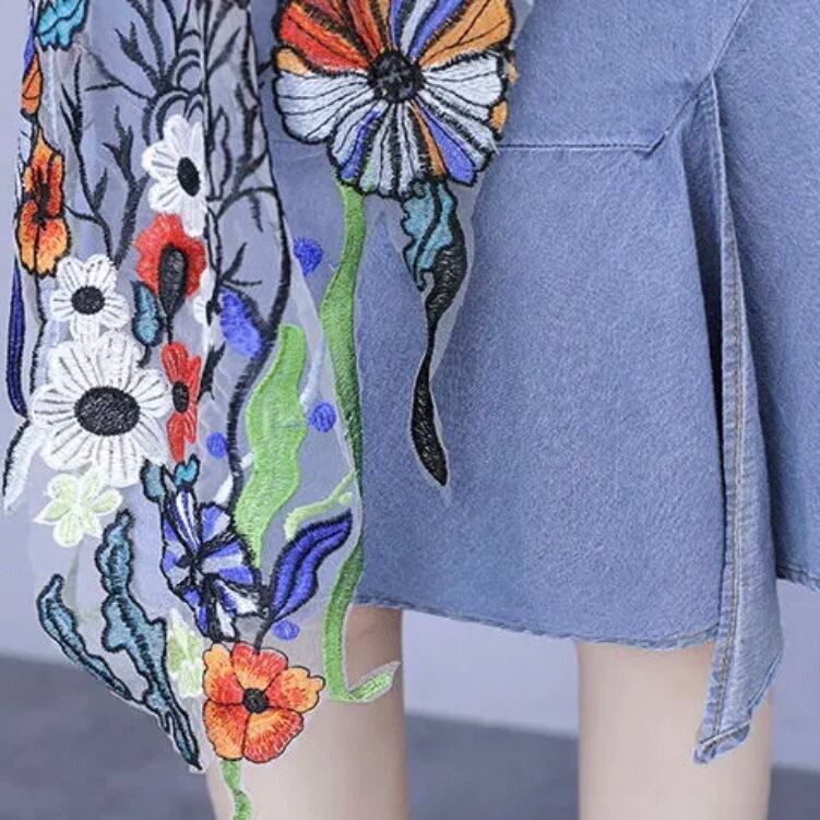 鮮やかな花のレースがアクセントになったおしゃれなデニムワンピ✨