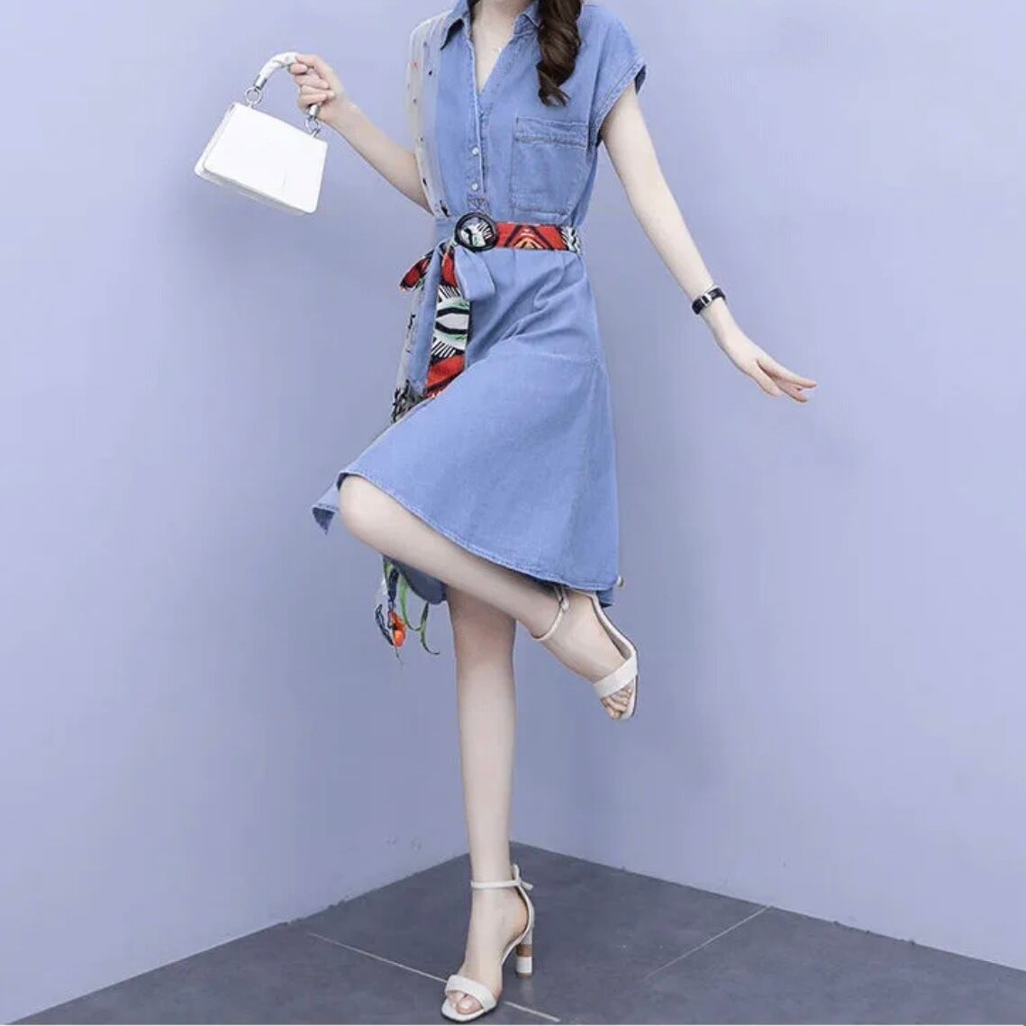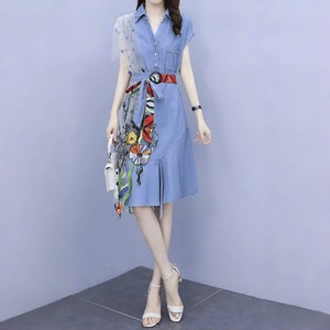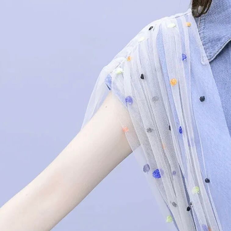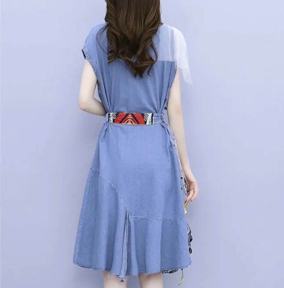 鮮やかな花のレースがアクセントになったおしゃれなデニムワンピ✨