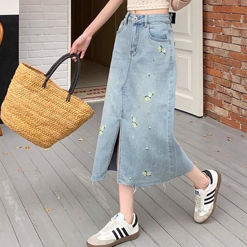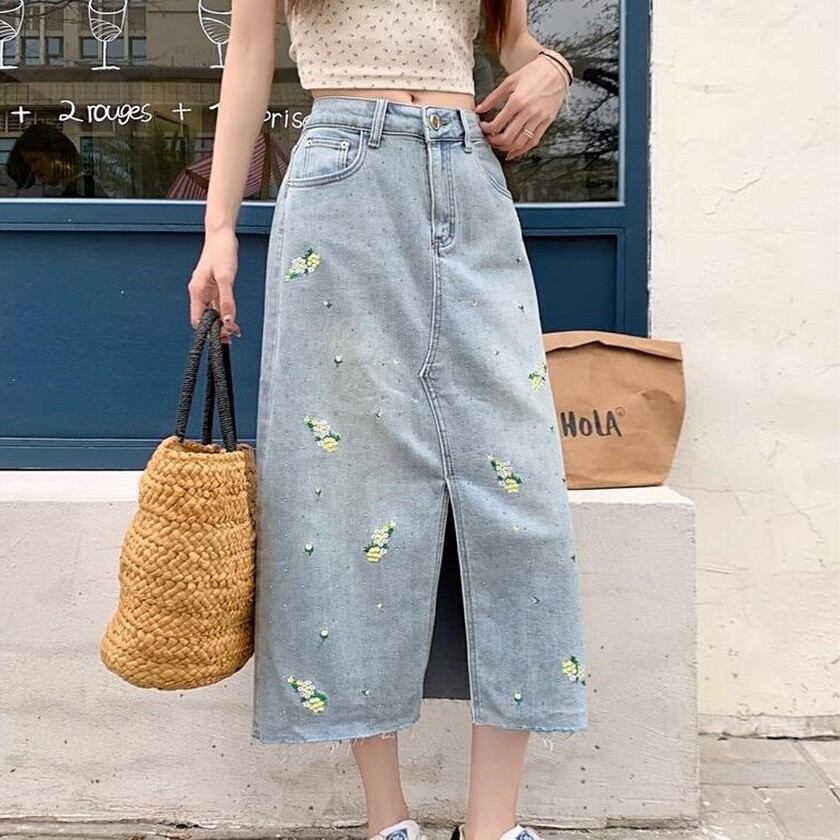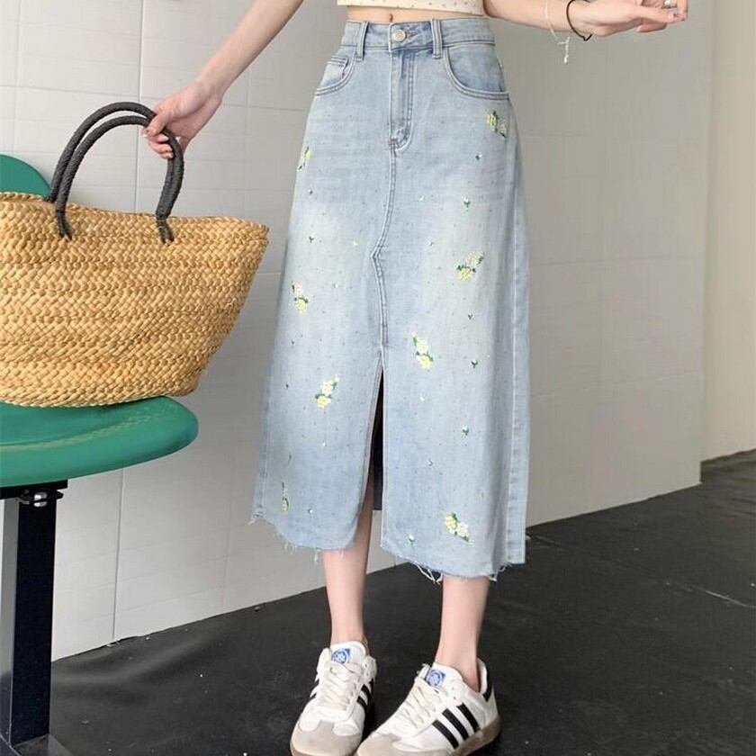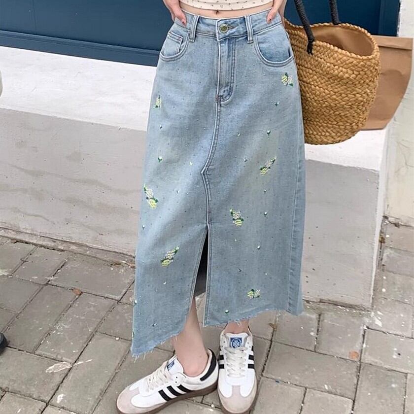 可愛らしい花柄刺繍が散りばめられたデニムスカート✨