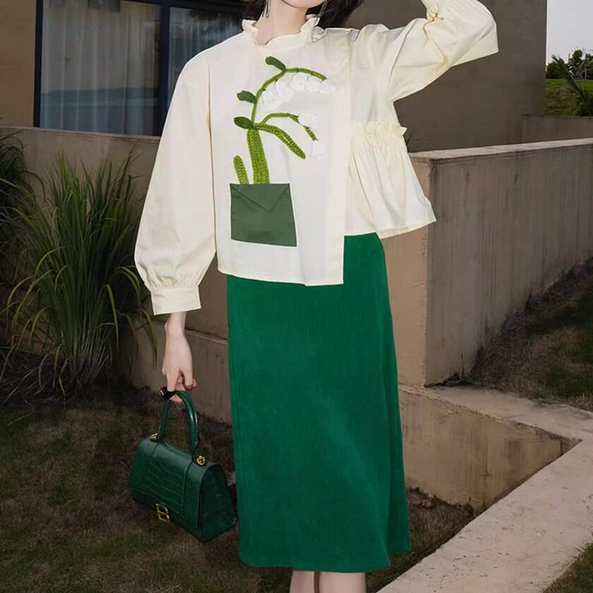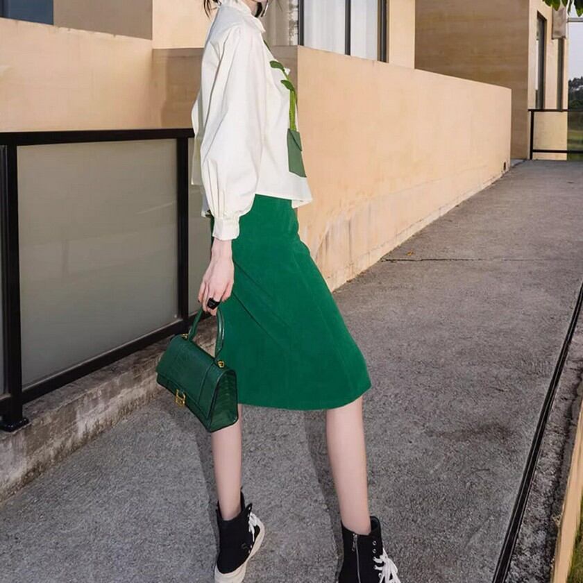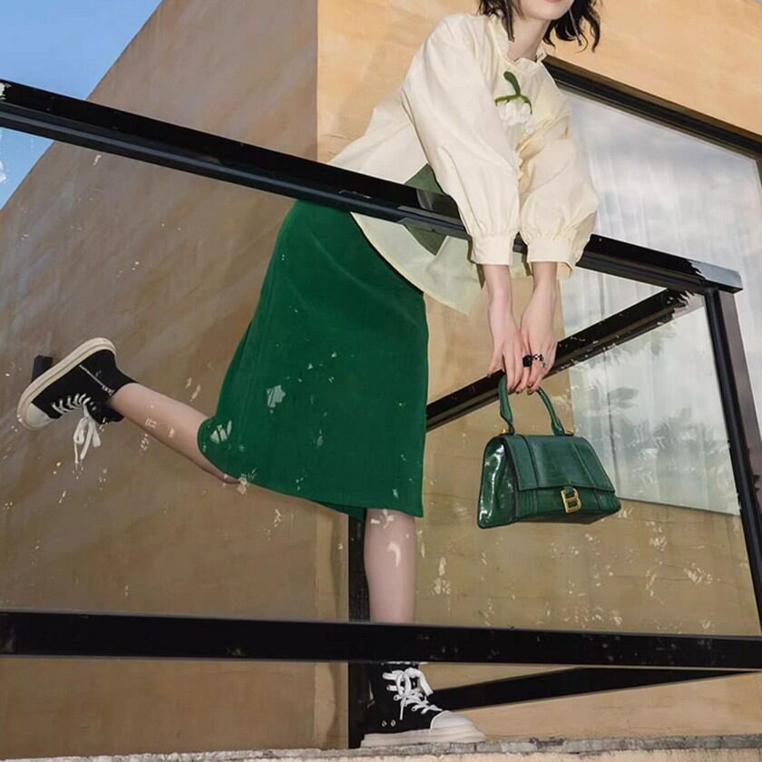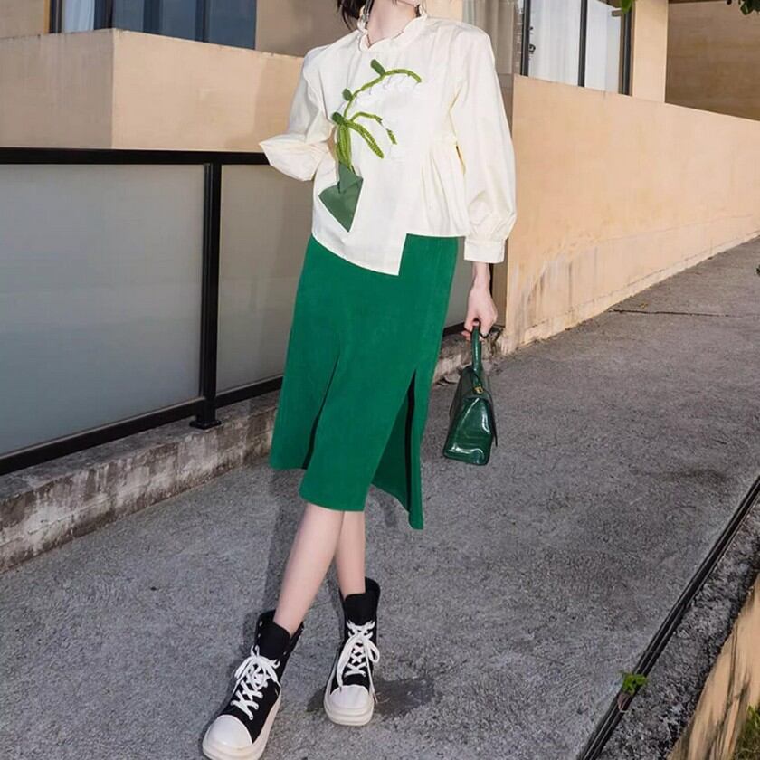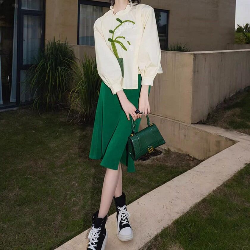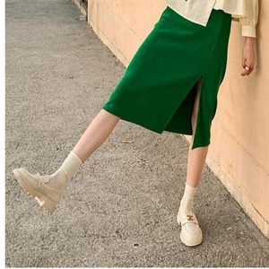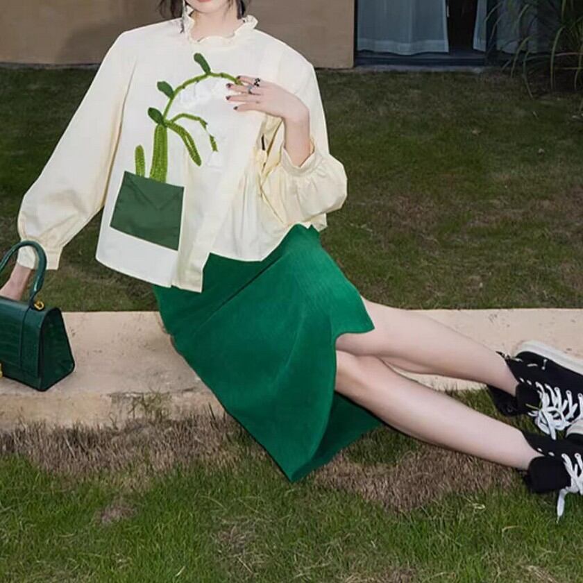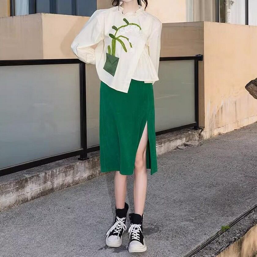 ガーリーな花柄ブラウスに合いそうなグリーンスリットスカート✨