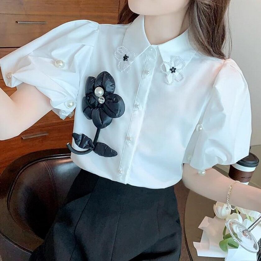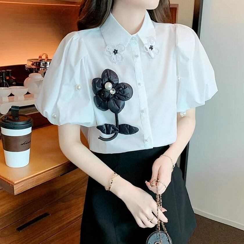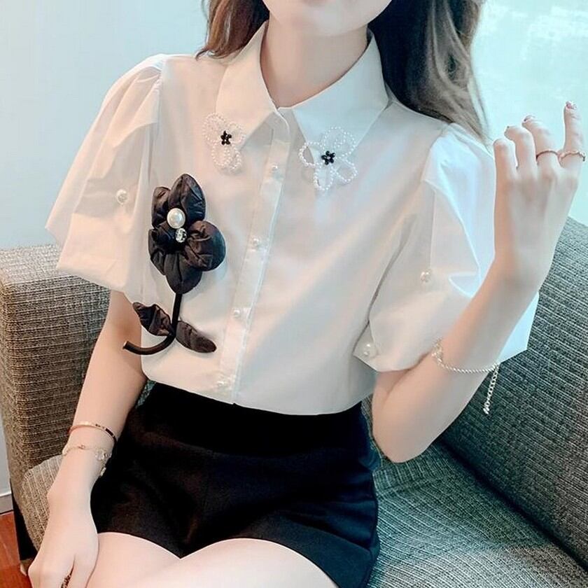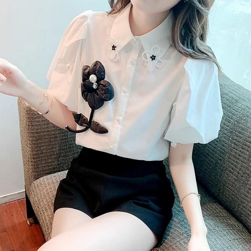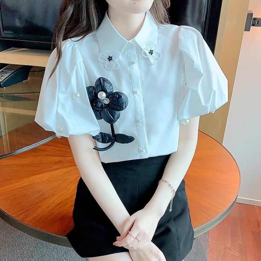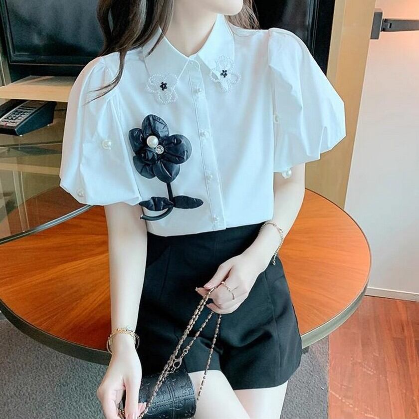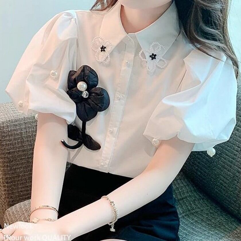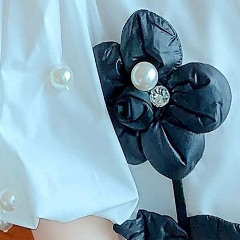 可愛いお花がついたぷっくり袖のブラウス✨