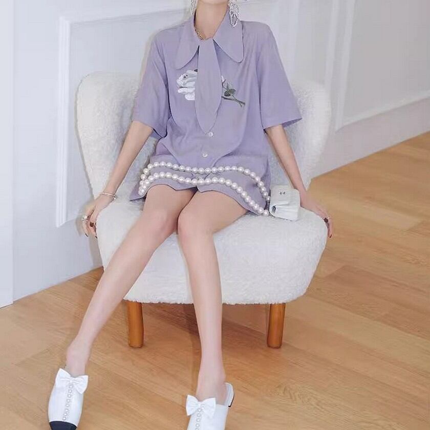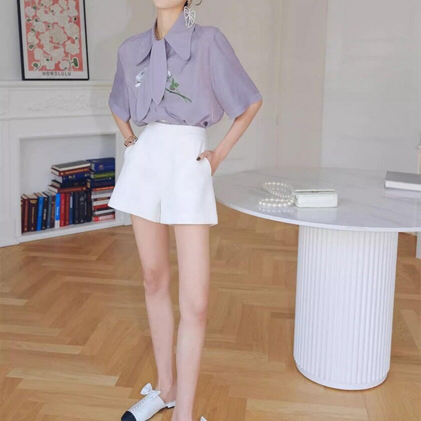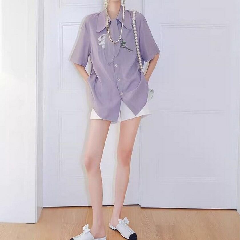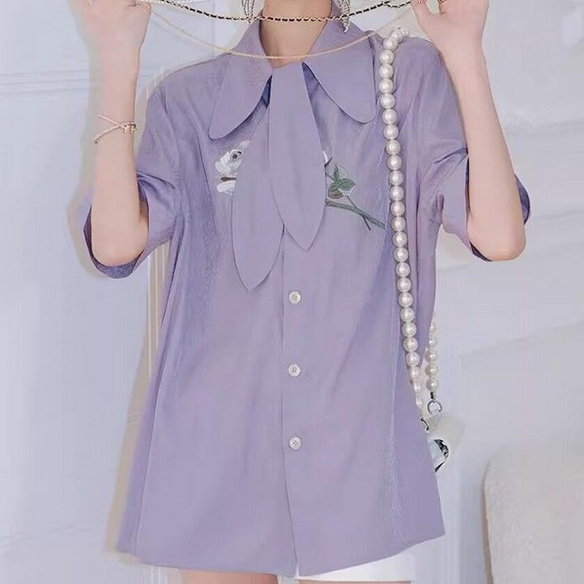 エレガントな花柄刺繍の入ったタイ付きブラウス✨