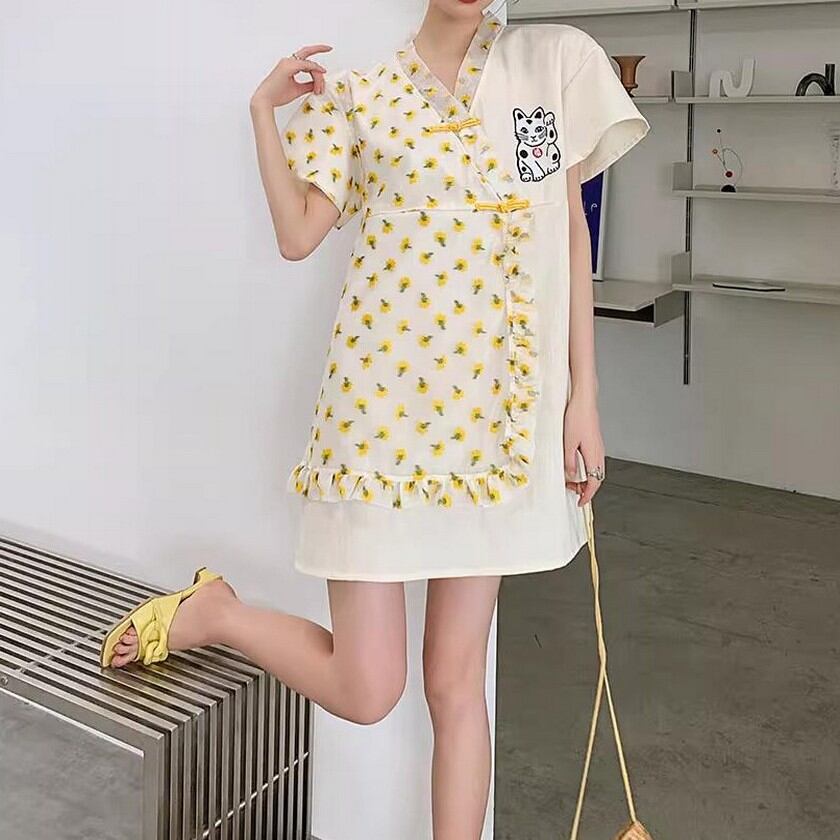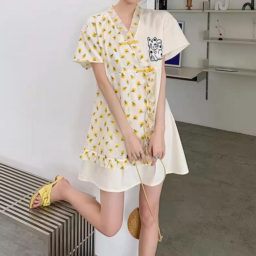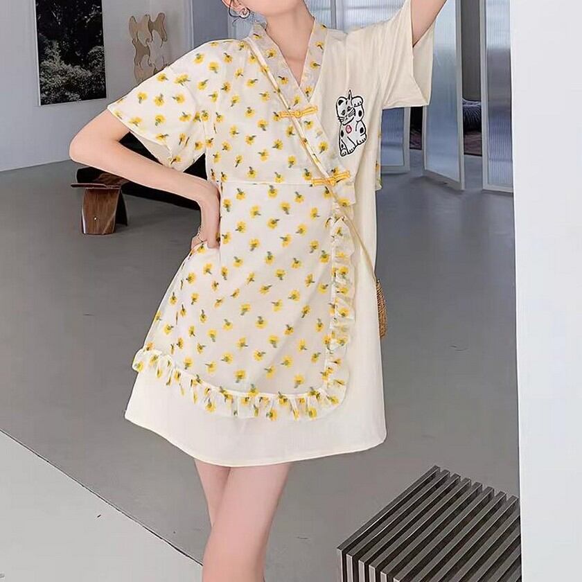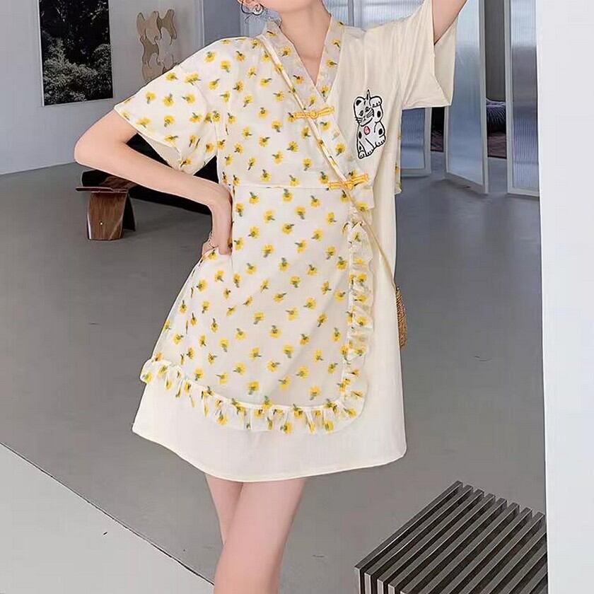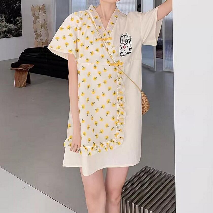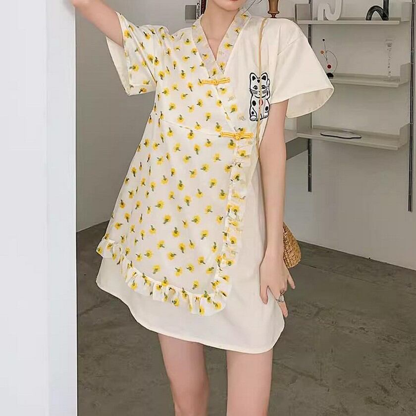 招き猫とレトロ花柄の組み合わせがユニークなブラウス✨