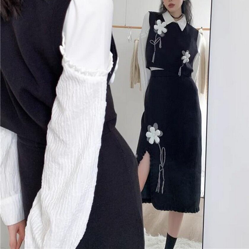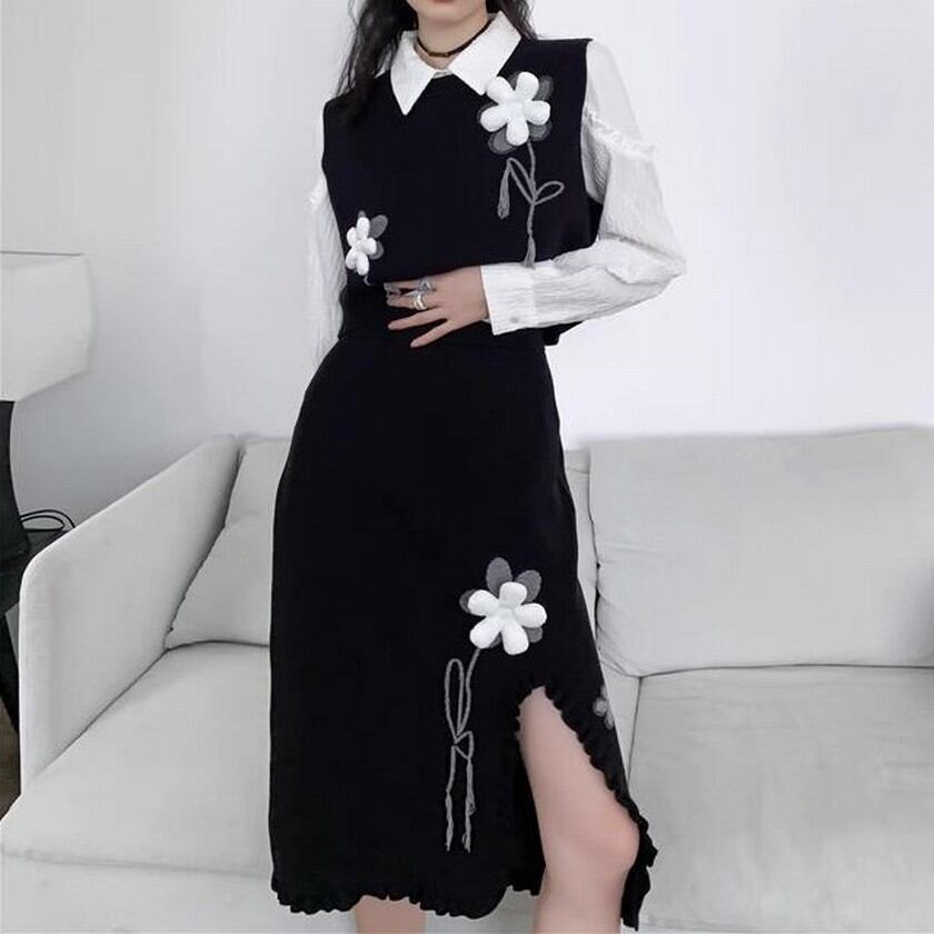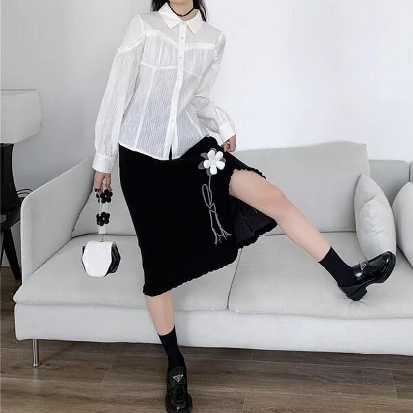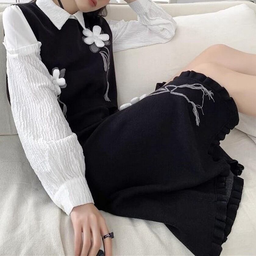 cute girly flower black knit skirt 0156