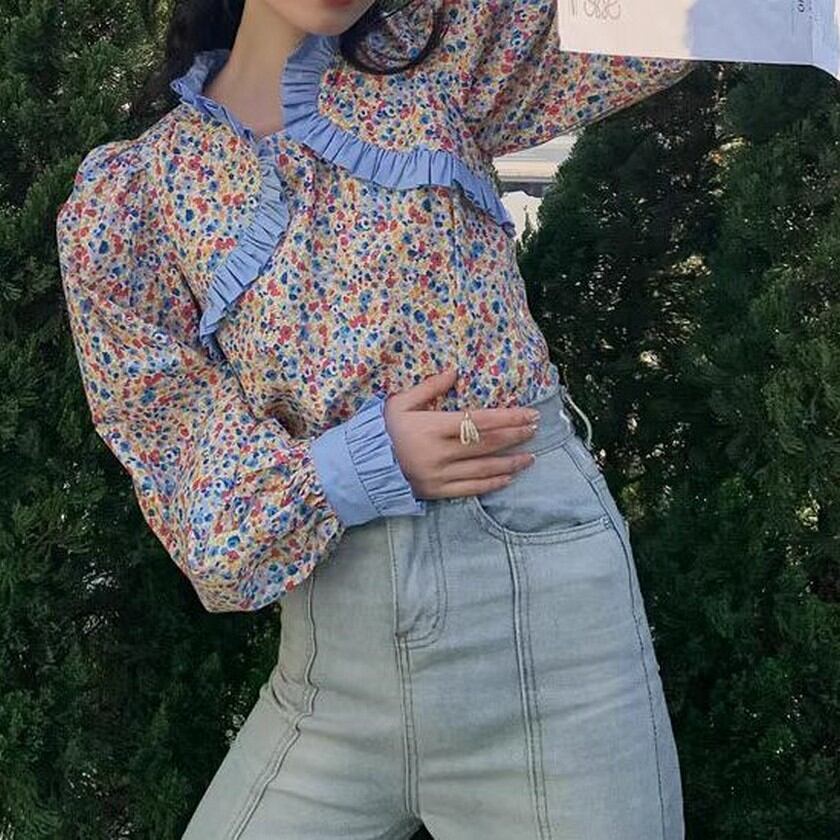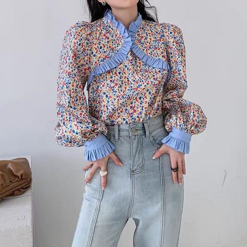フリルのスタンドカラーと華やかな小花柄がレトロでおしゃれ♡