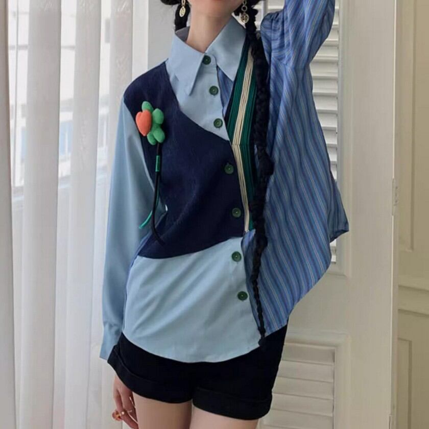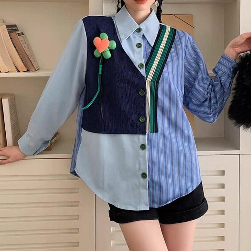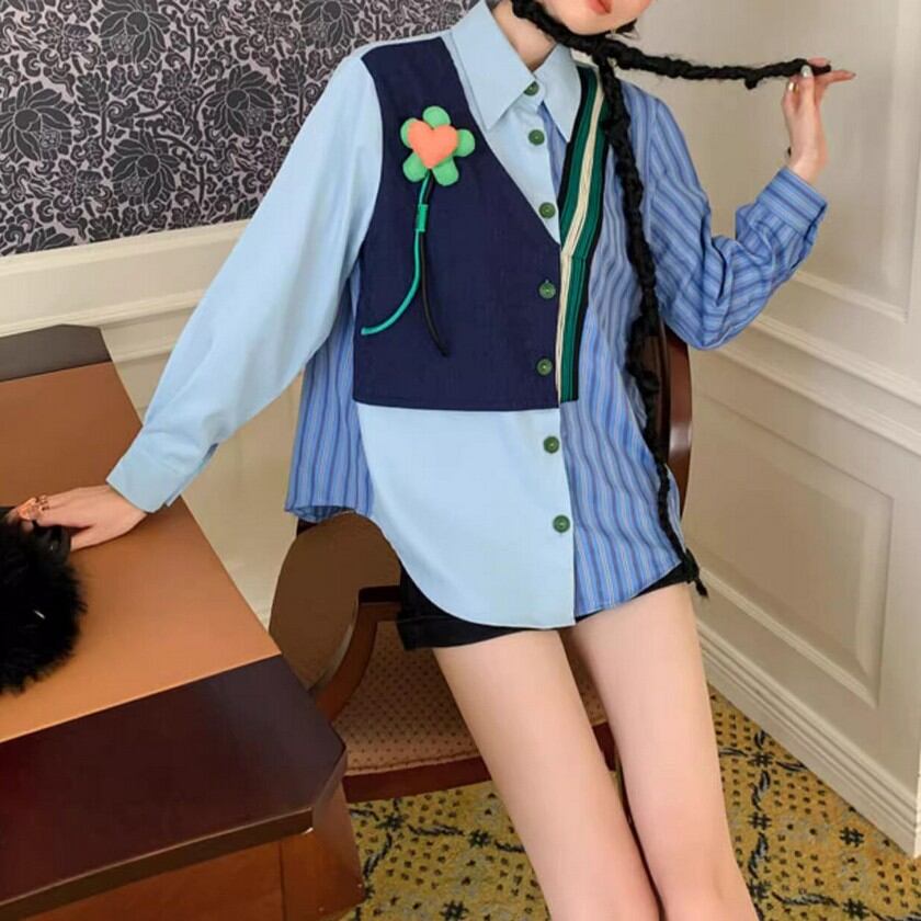 cute heart flower fake two piece striped shirt 0239