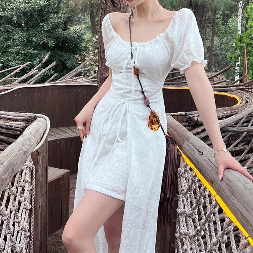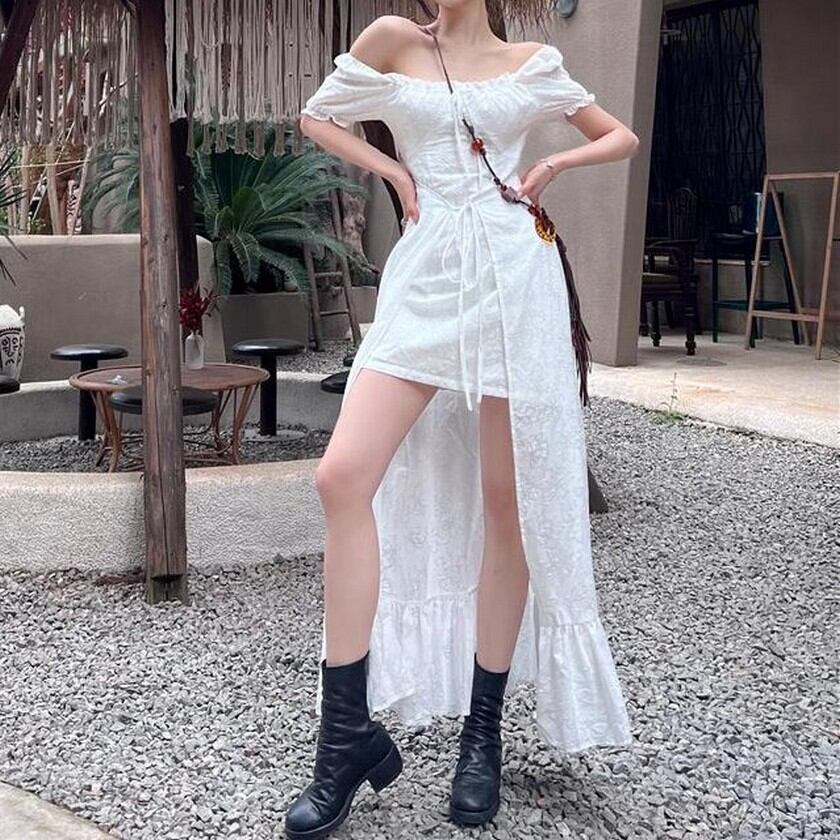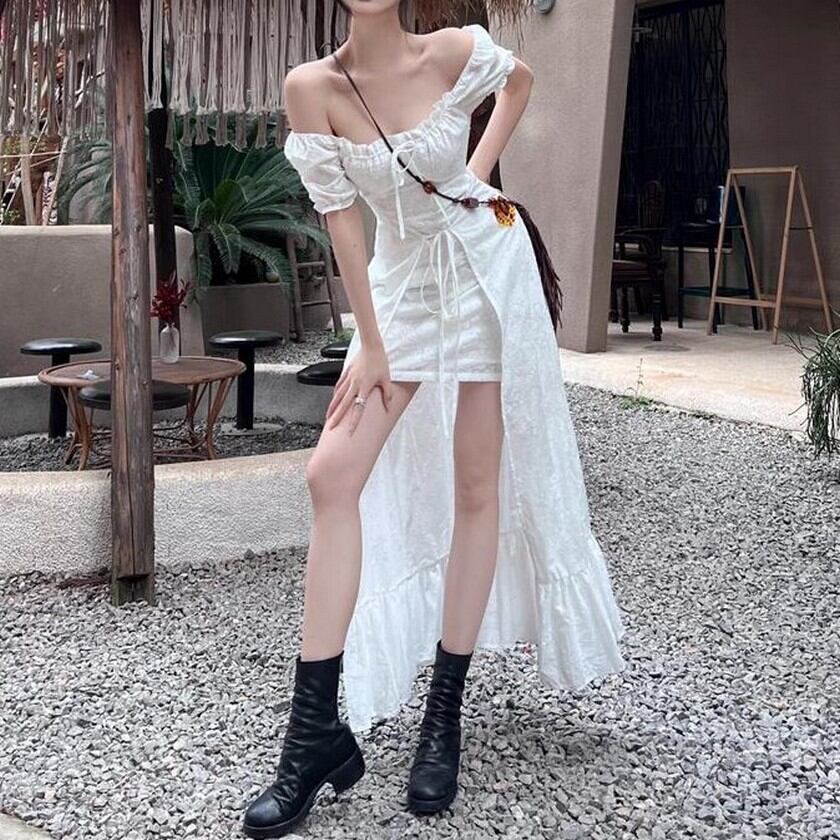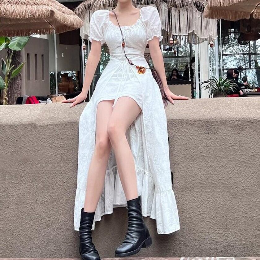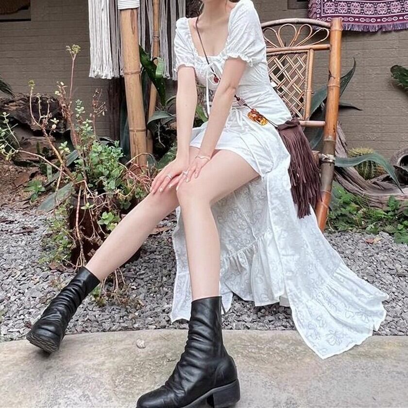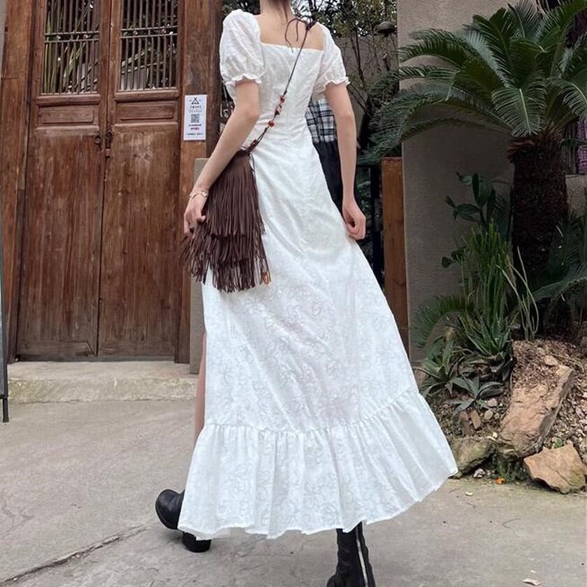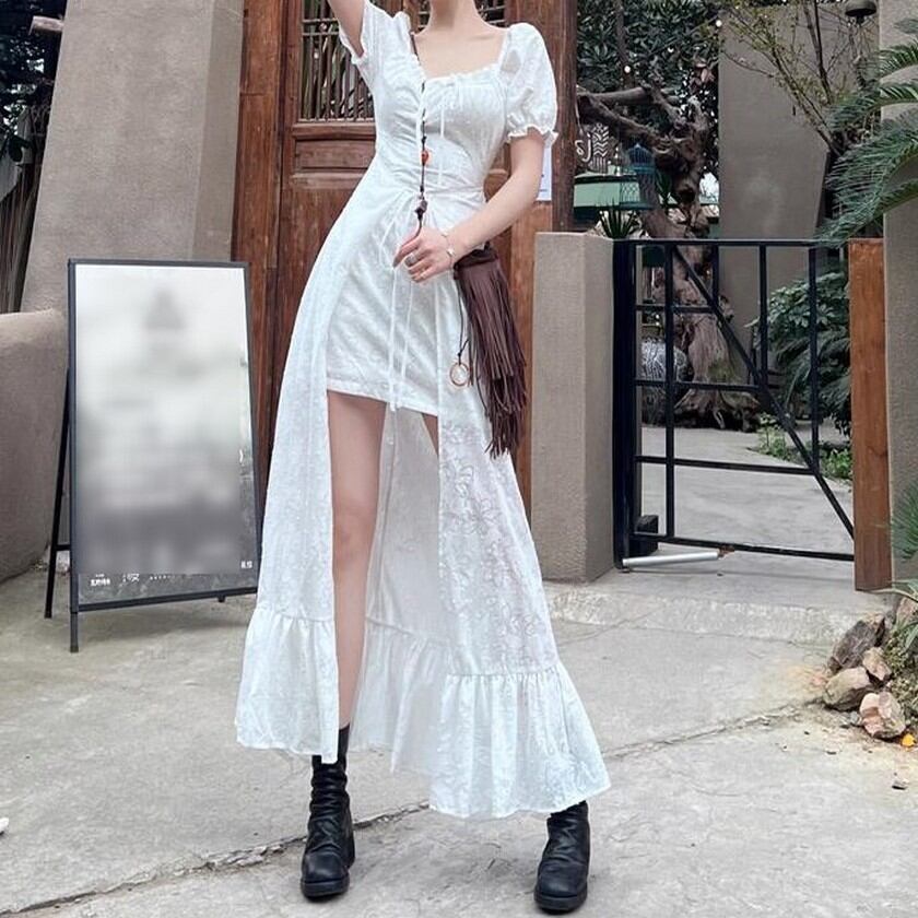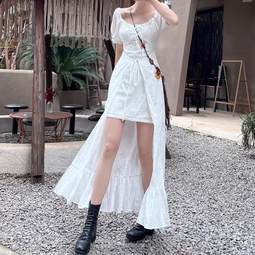 歩く姿が優美♡後ろの丈が長いエレガントガーリーの白ワンピース✨