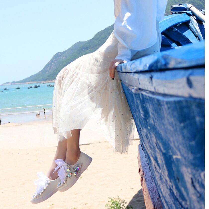 glitter butterfly lace-up white canvas shoes 0064