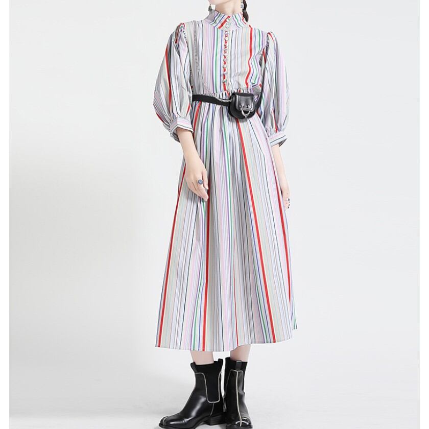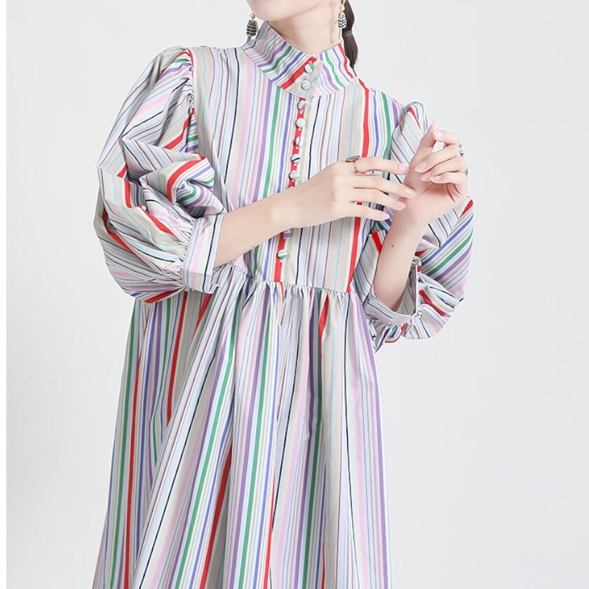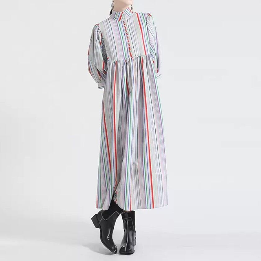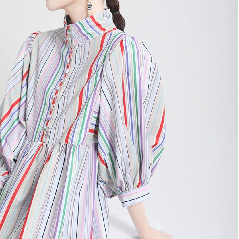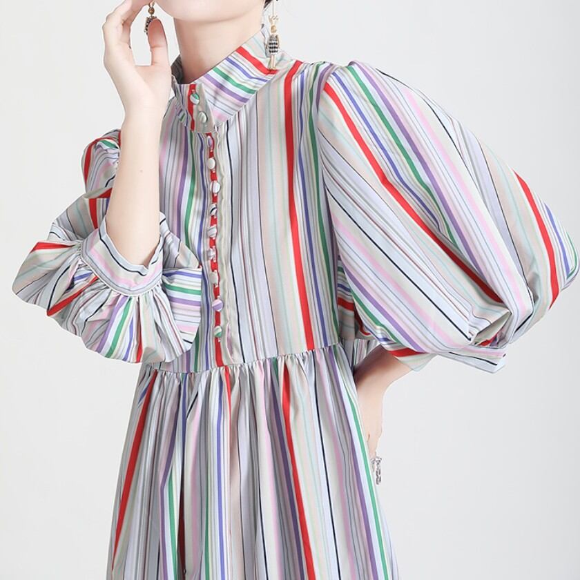 retro colorful happy rainbow striped puff sleeve dress 0073