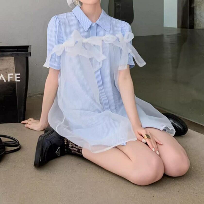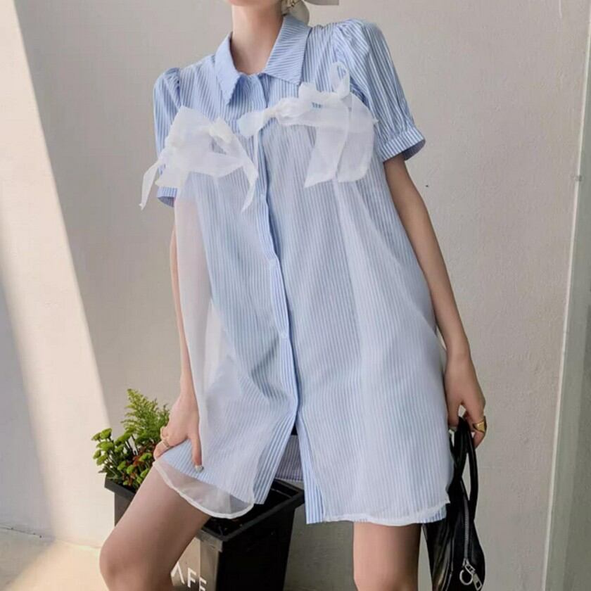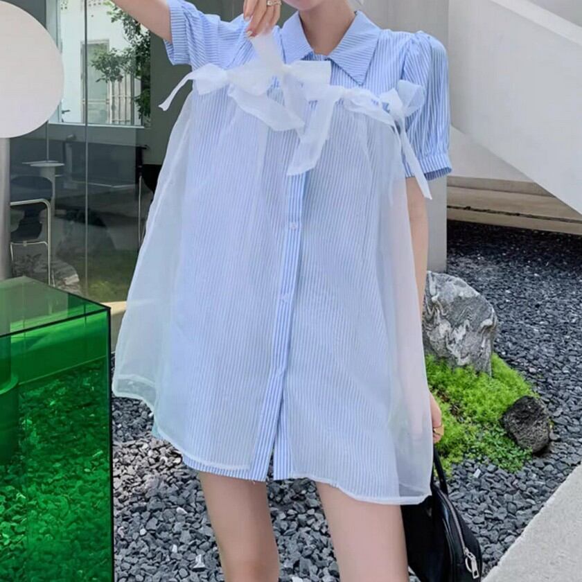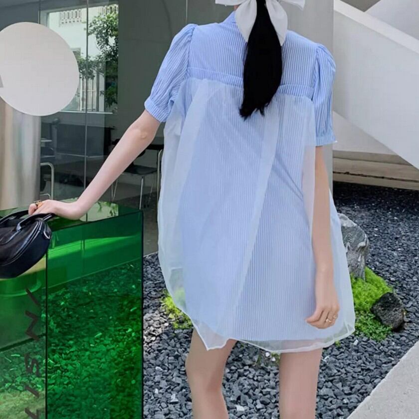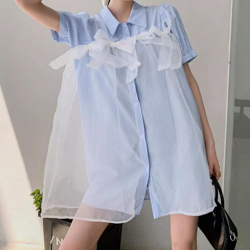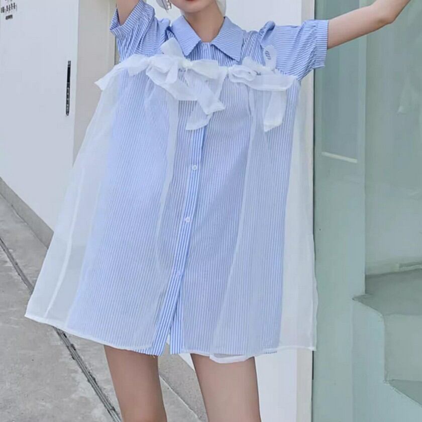 a lot of ribbon mesh striped shirt dress 0373