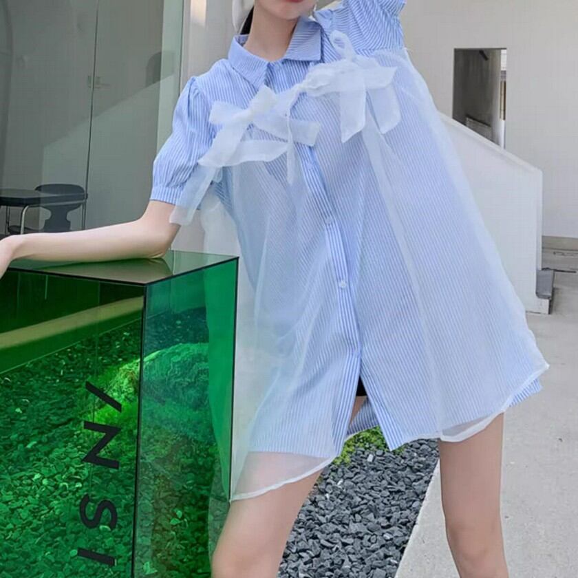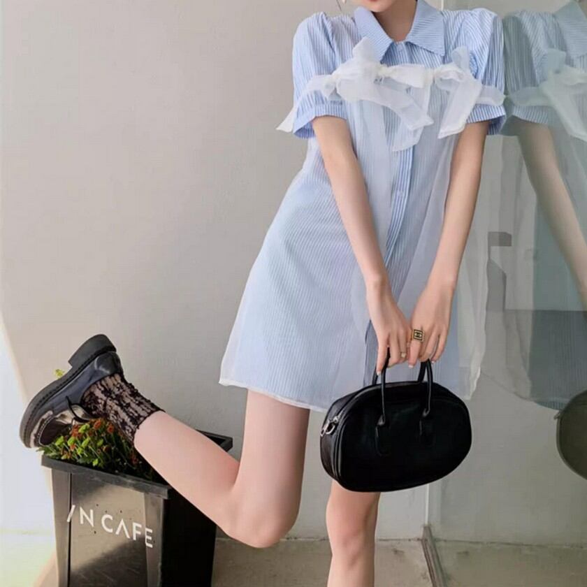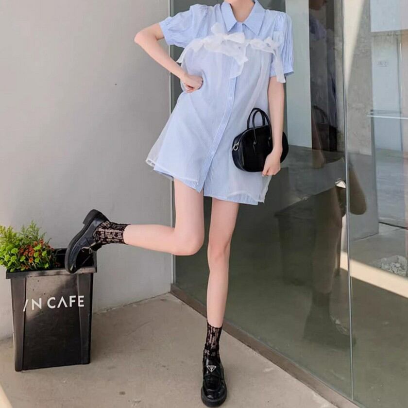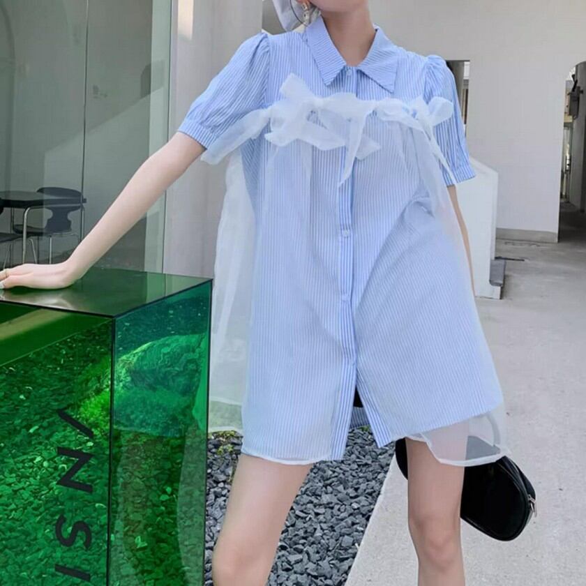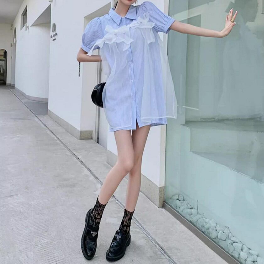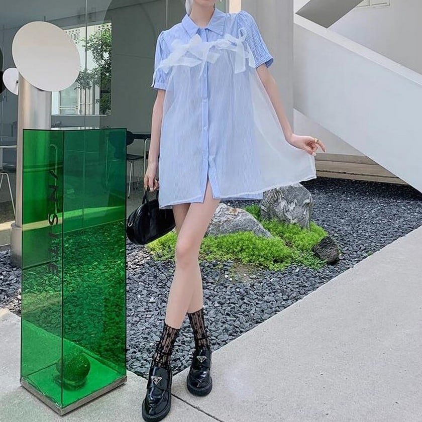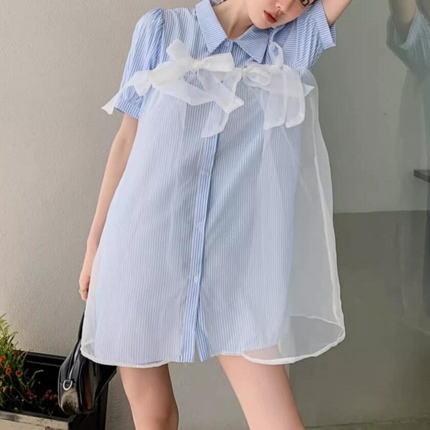 a lot of ribbon mesh striped shirt dress 0373