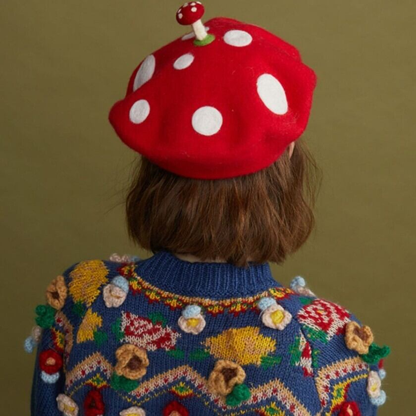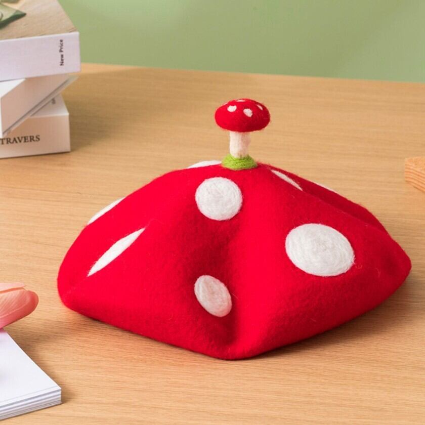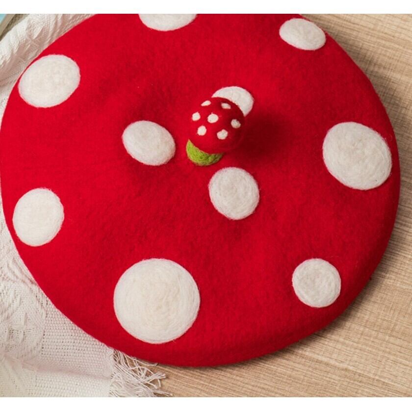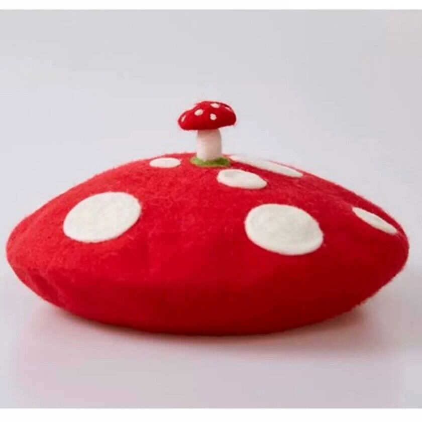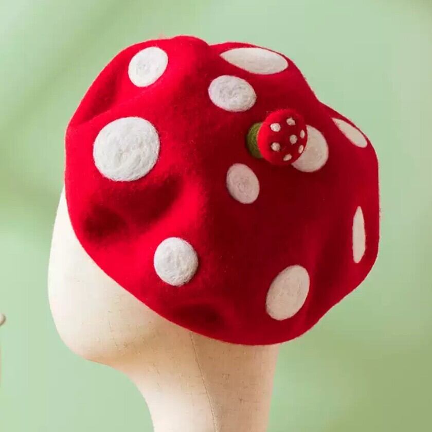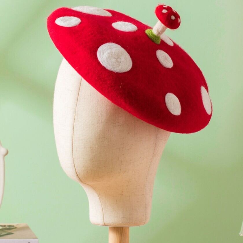 可愛らしい赤いキノコのベレー帽✨