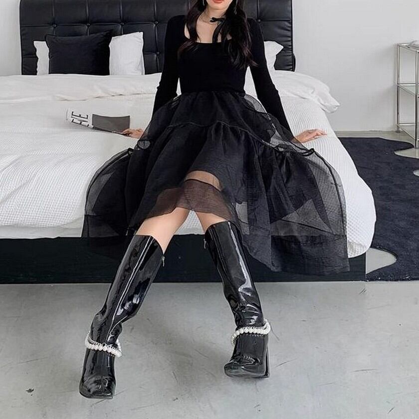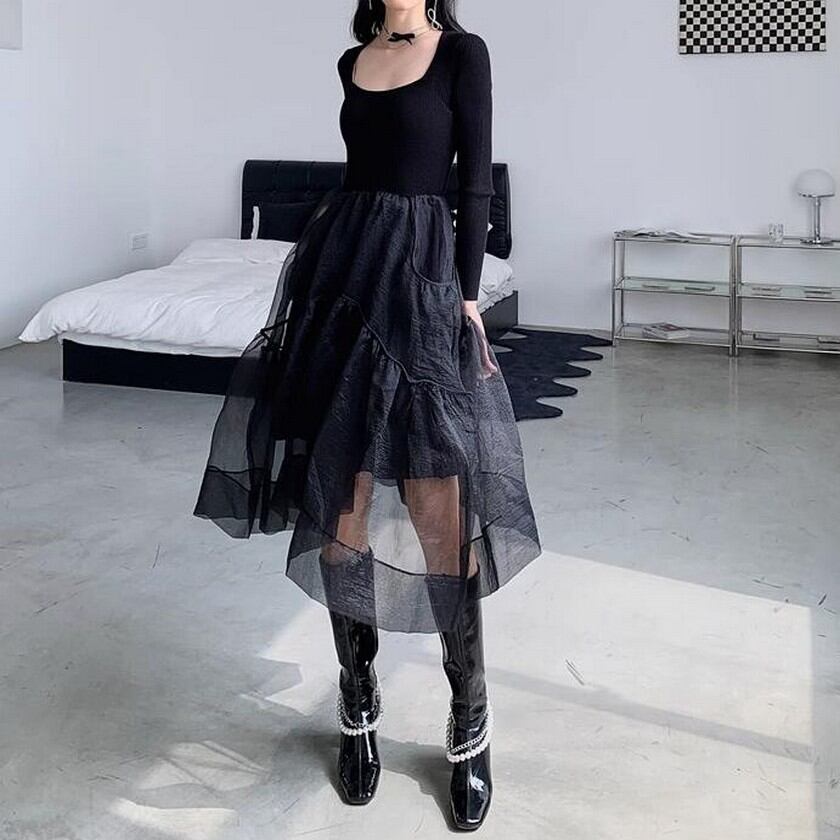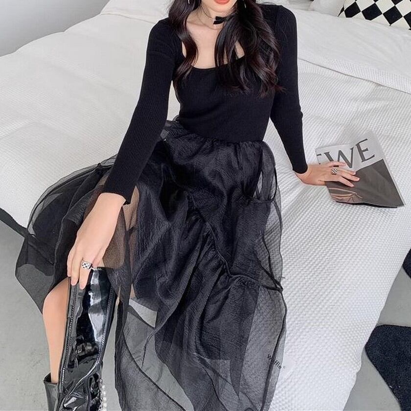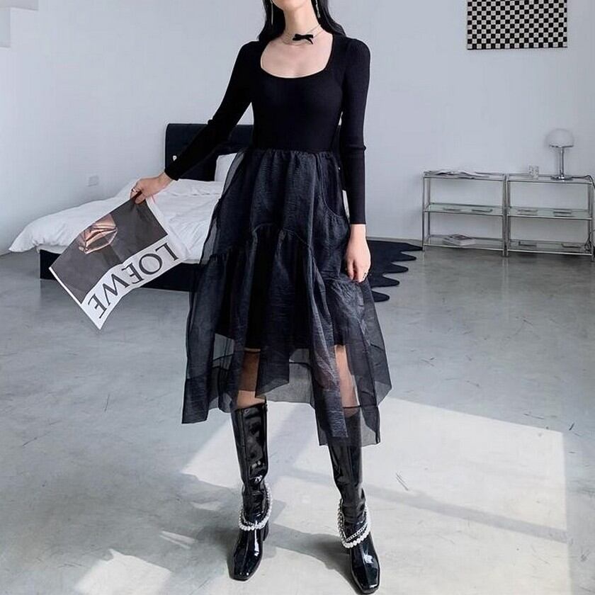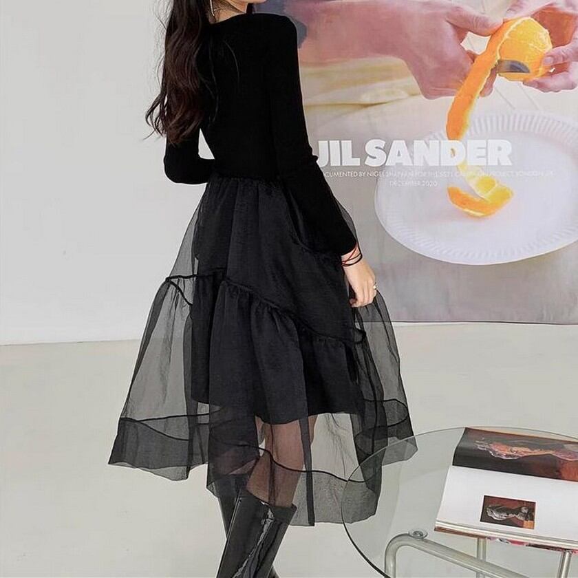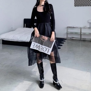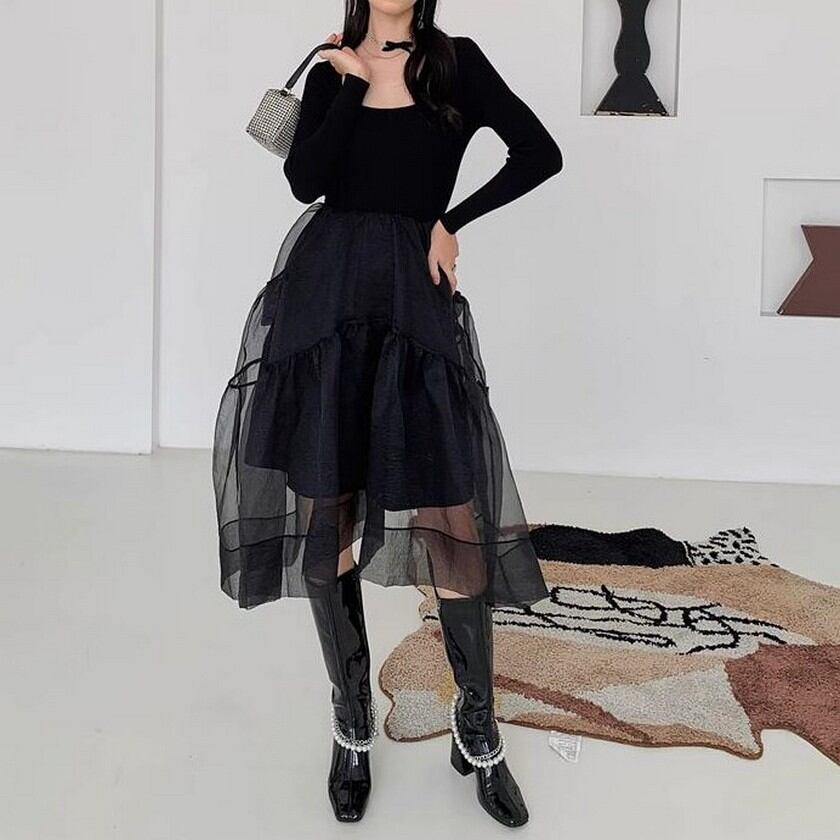 ニット&ふんわりメッシュの可愛らしい黒ワンピ✨