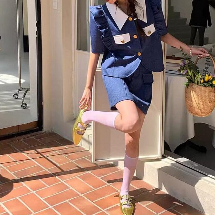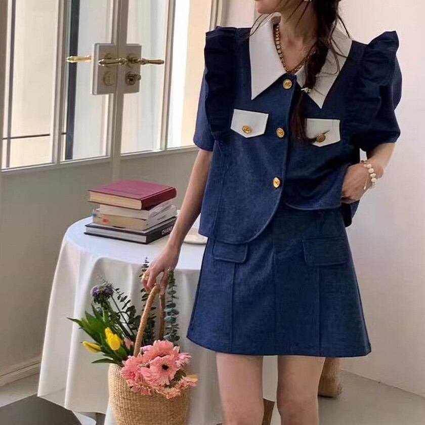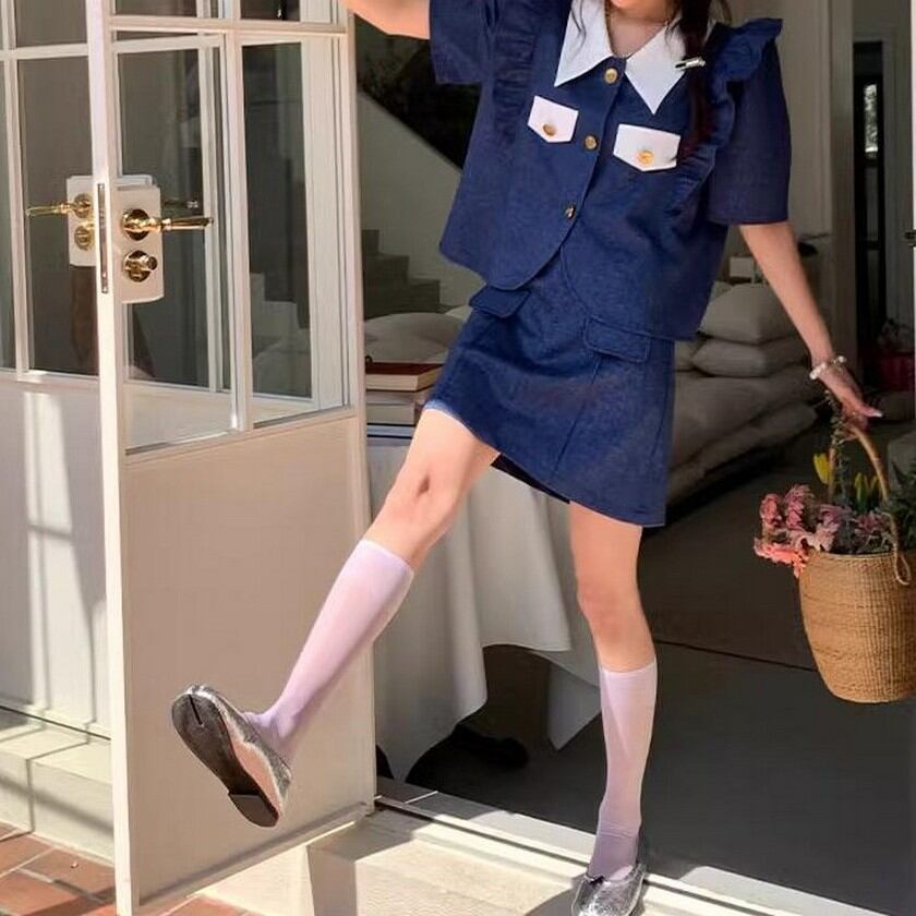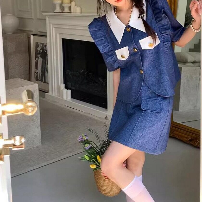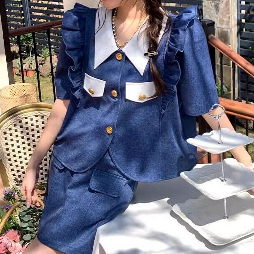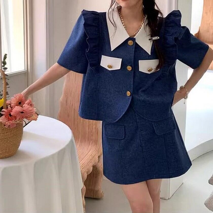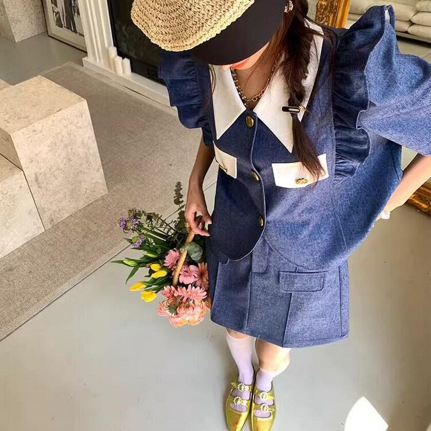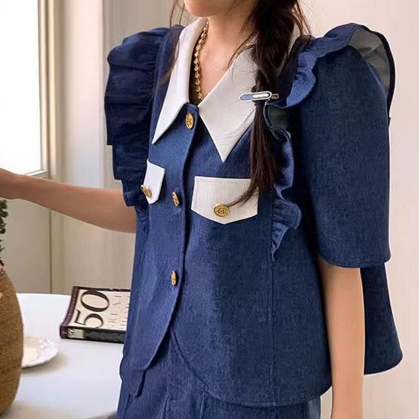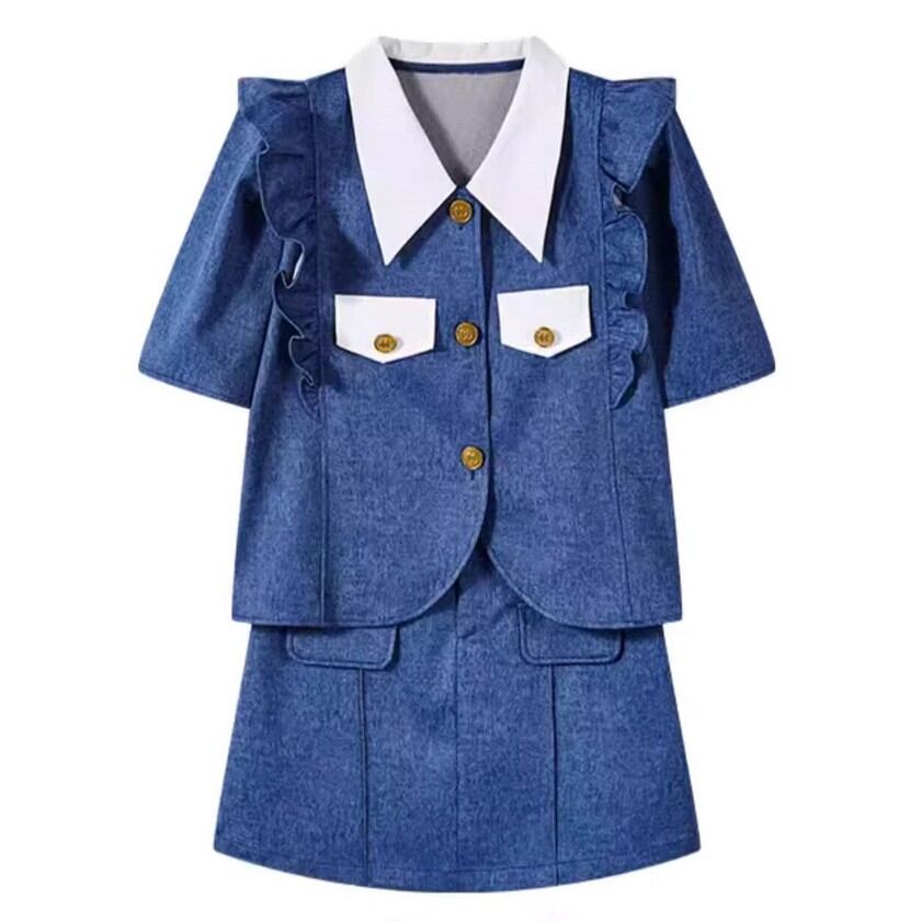 デニム生地なのにエレガント✨フリル付きブラウス&スカートのセットアップです✨
