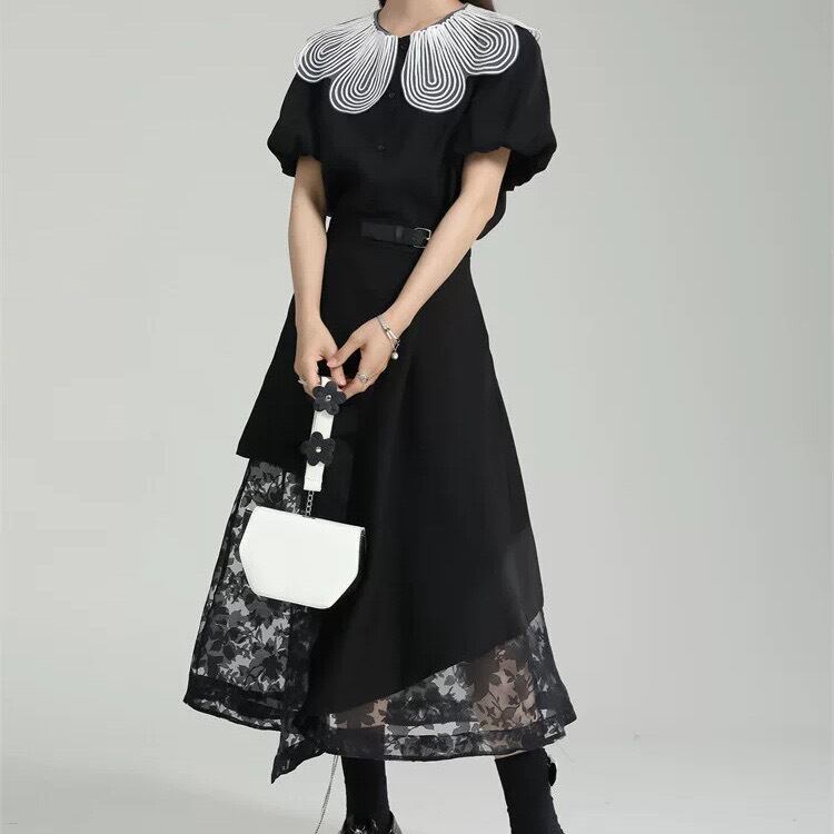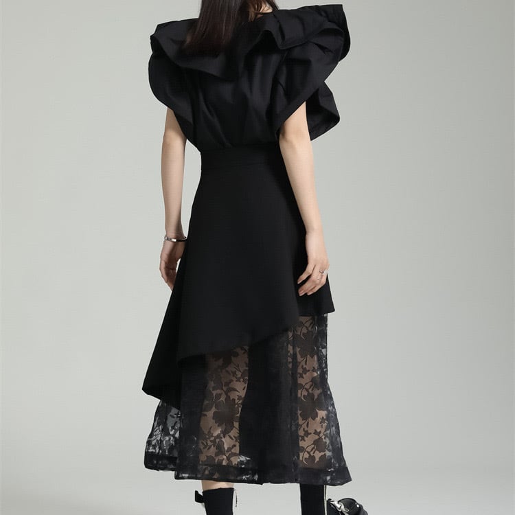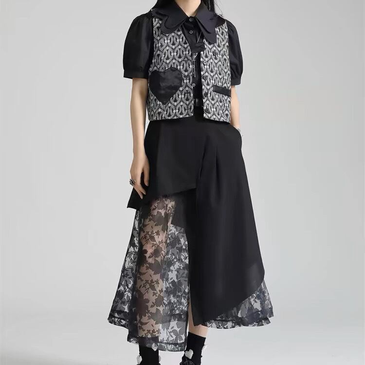 niche design hollow splicing yarn asymmetry black skirt 0413