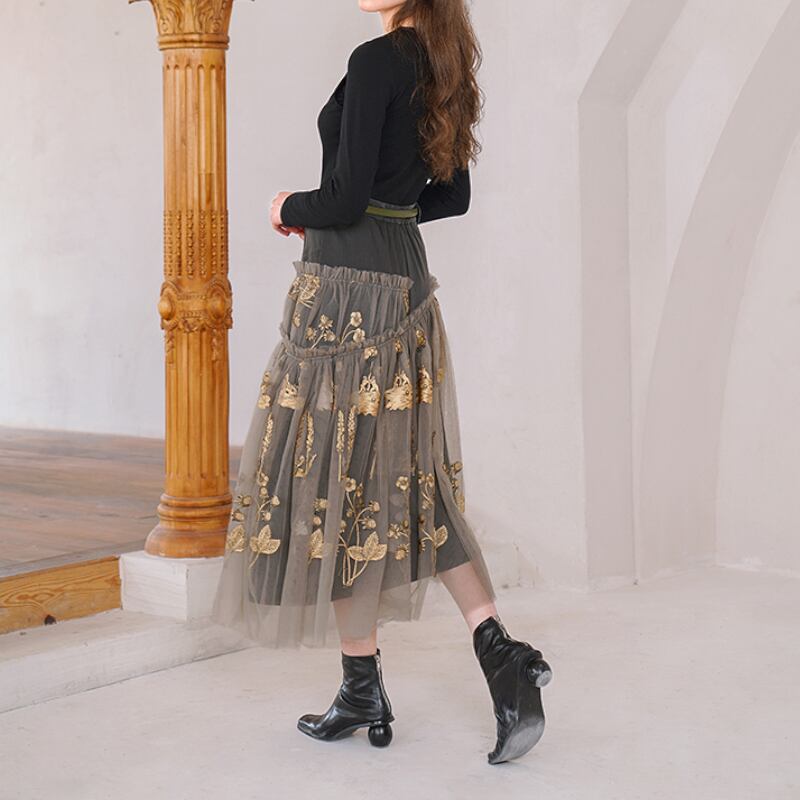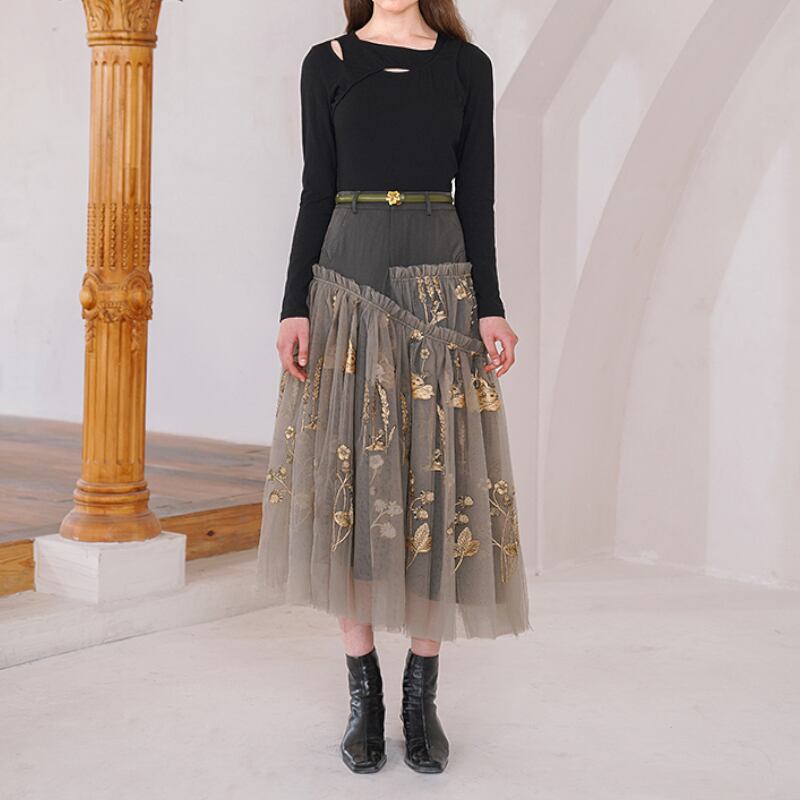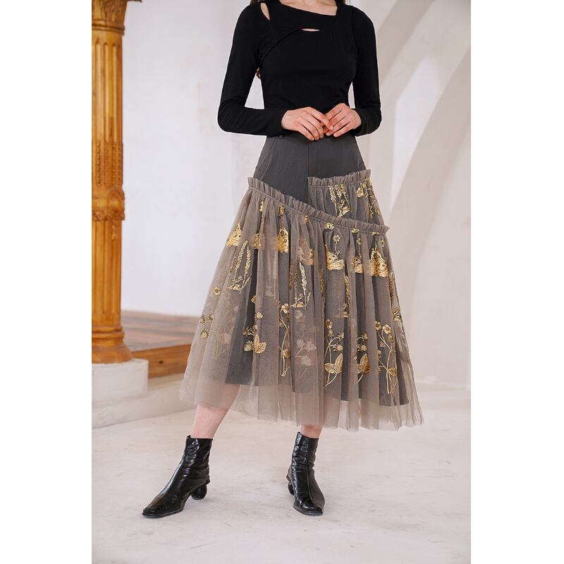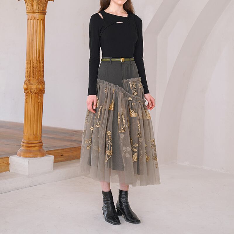 まるで夢に出てきそうな花植物の刺繍が施されたおしゃれなメッシュスカート✨