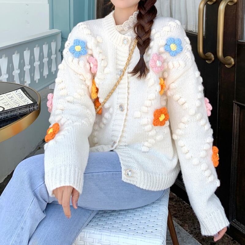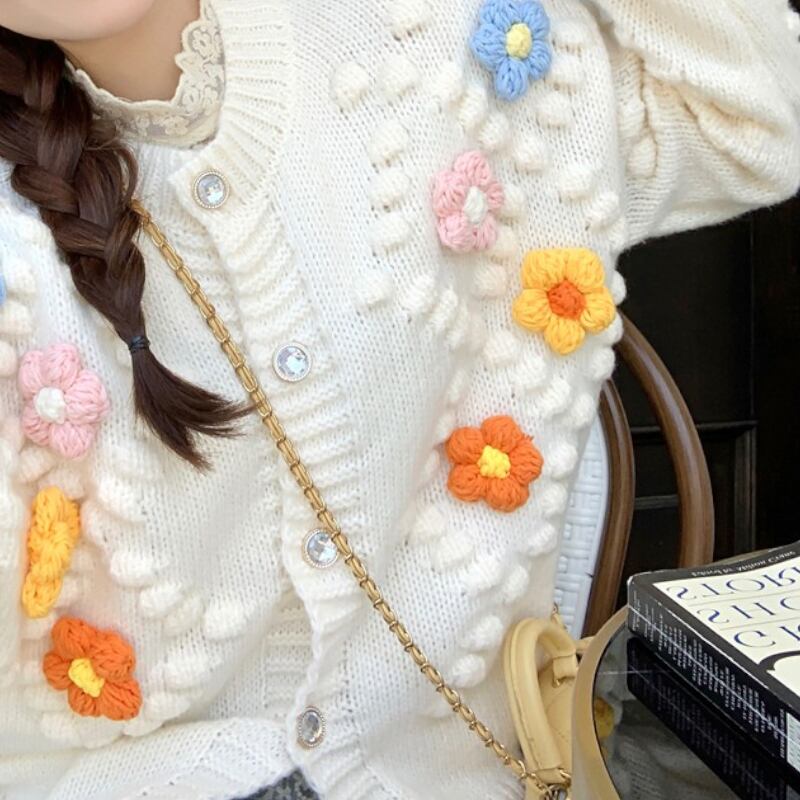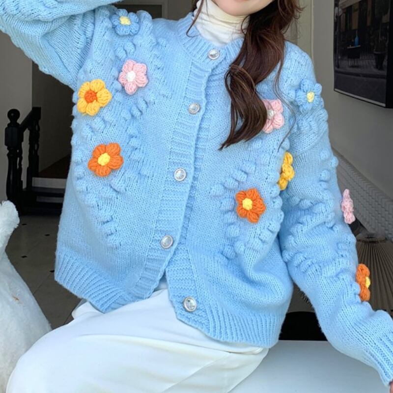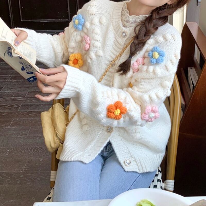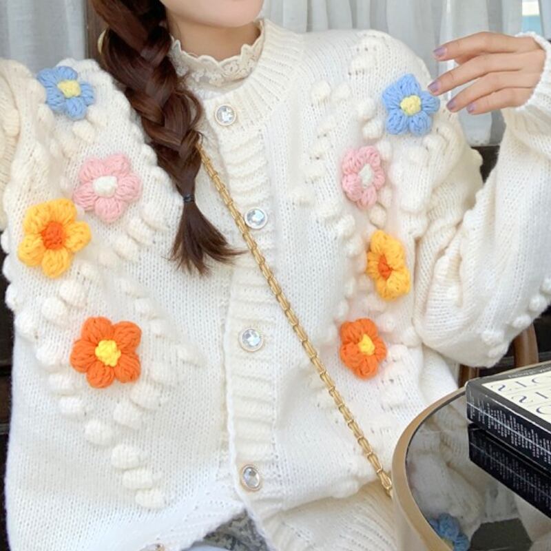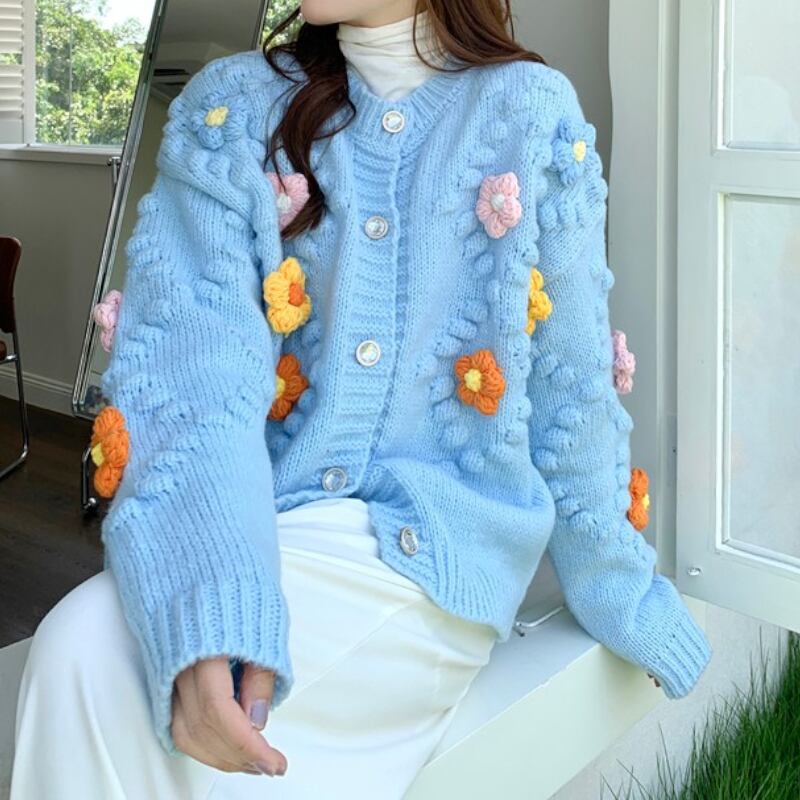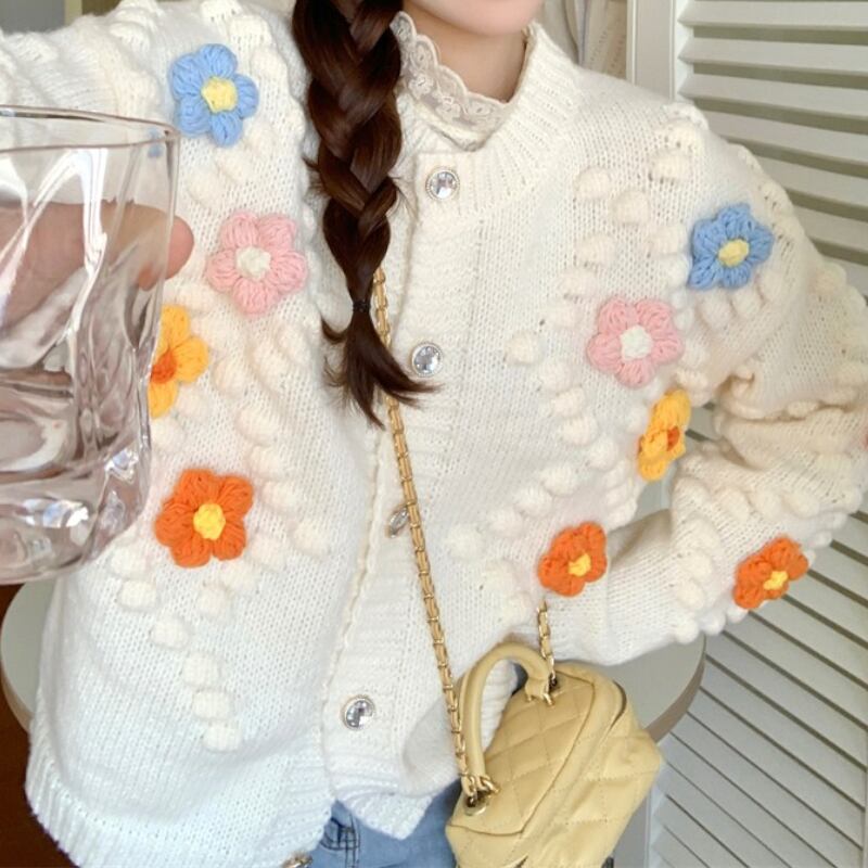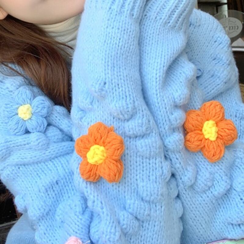 カラフルで可愛らしい花がついたニットカーディガン✨