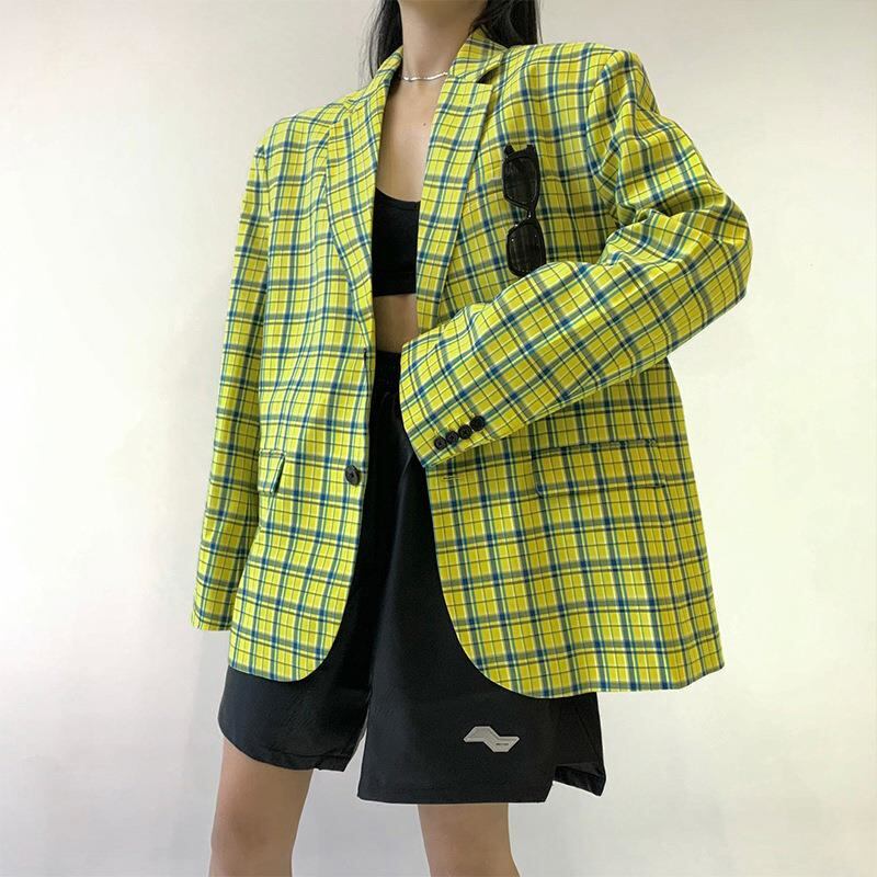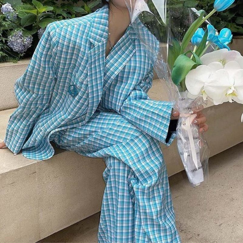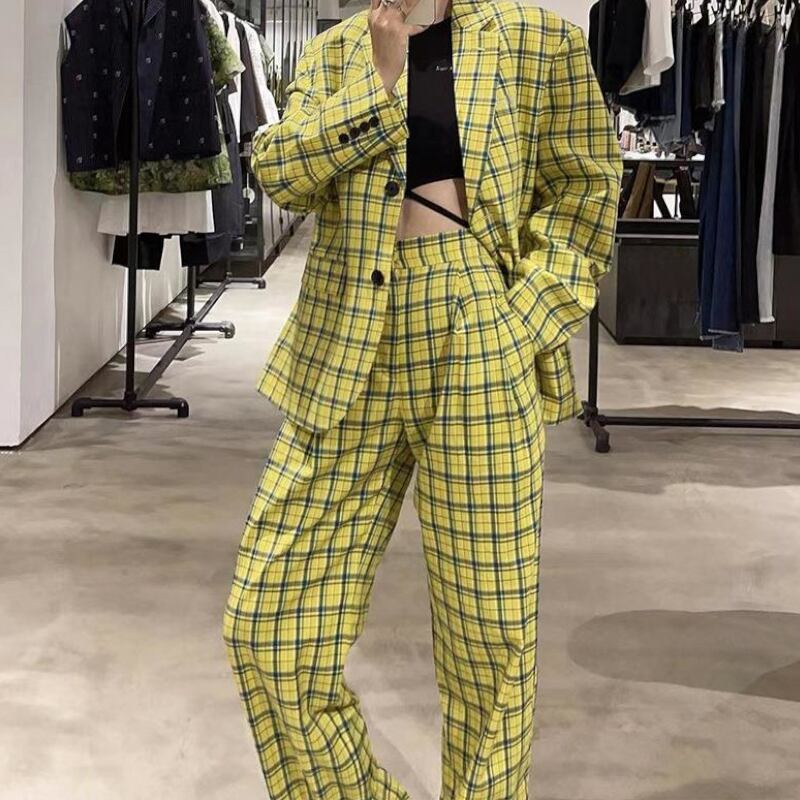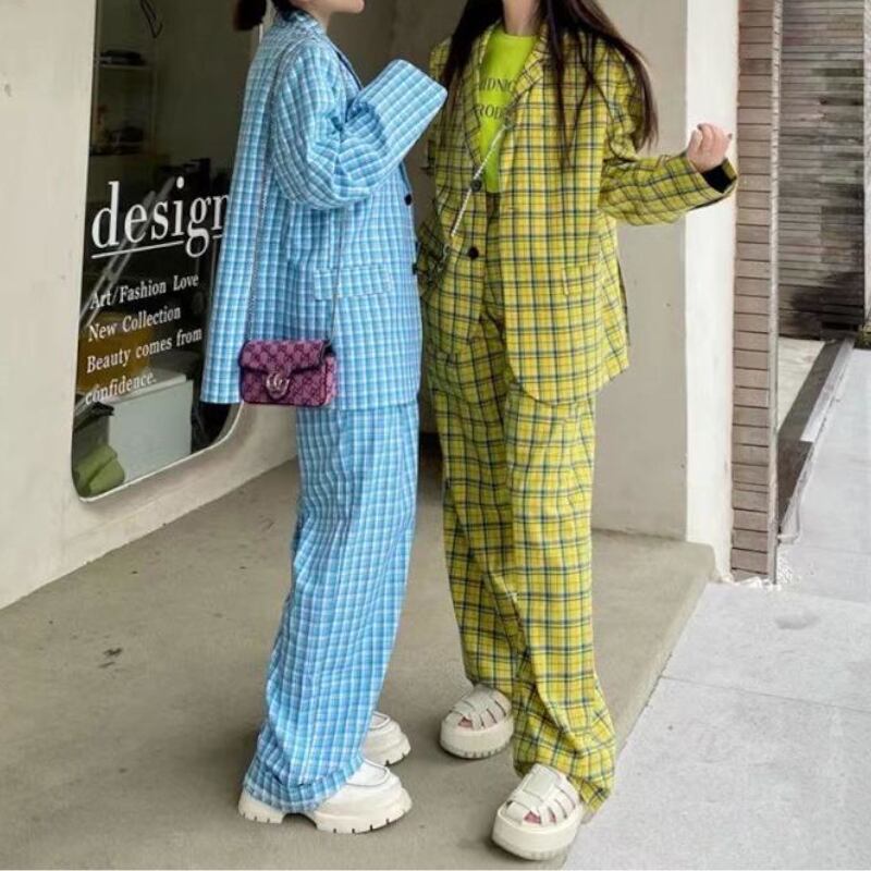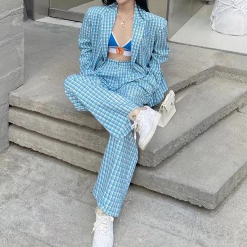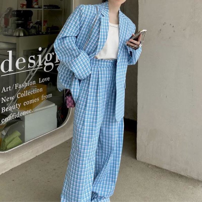 girly retro plaid shoulder pad outline suit jacket and wide leg pants set up【2color】0571