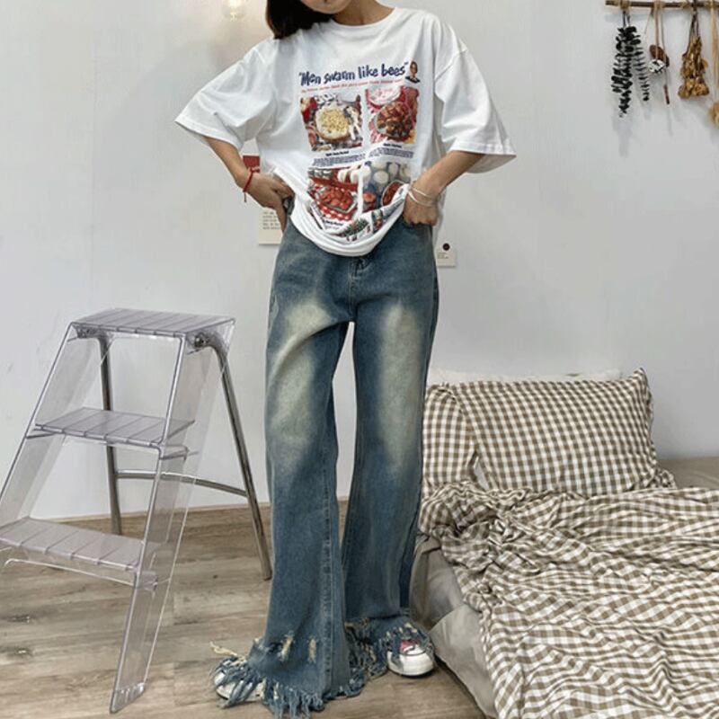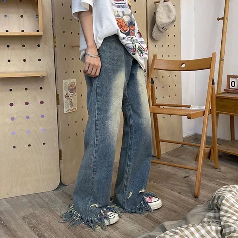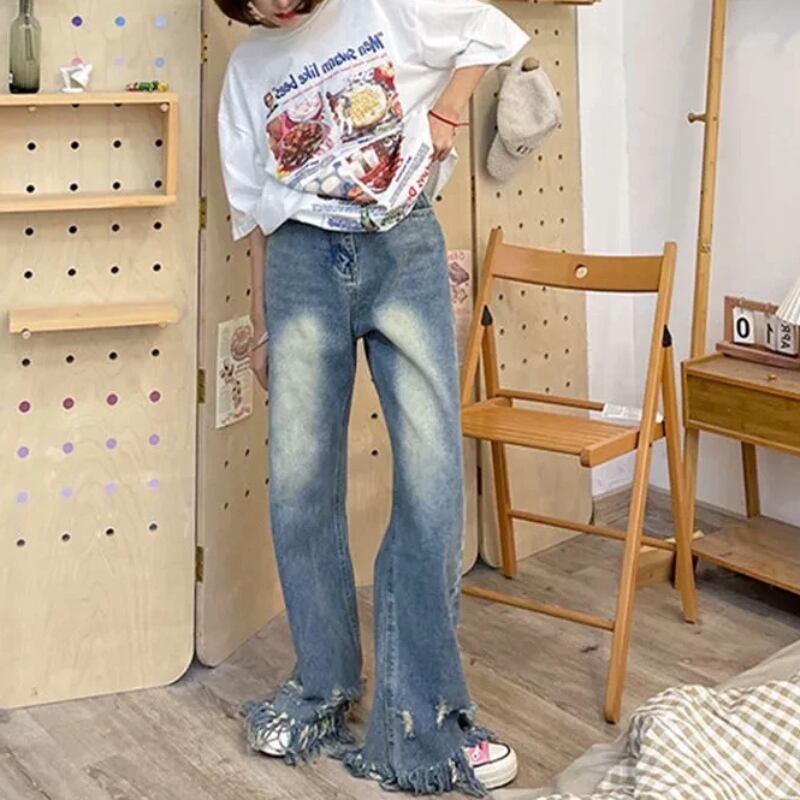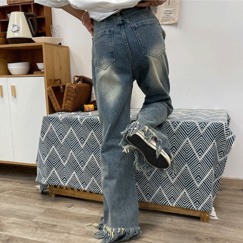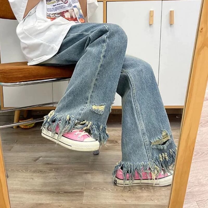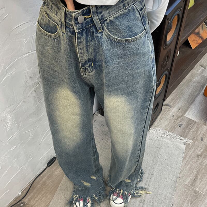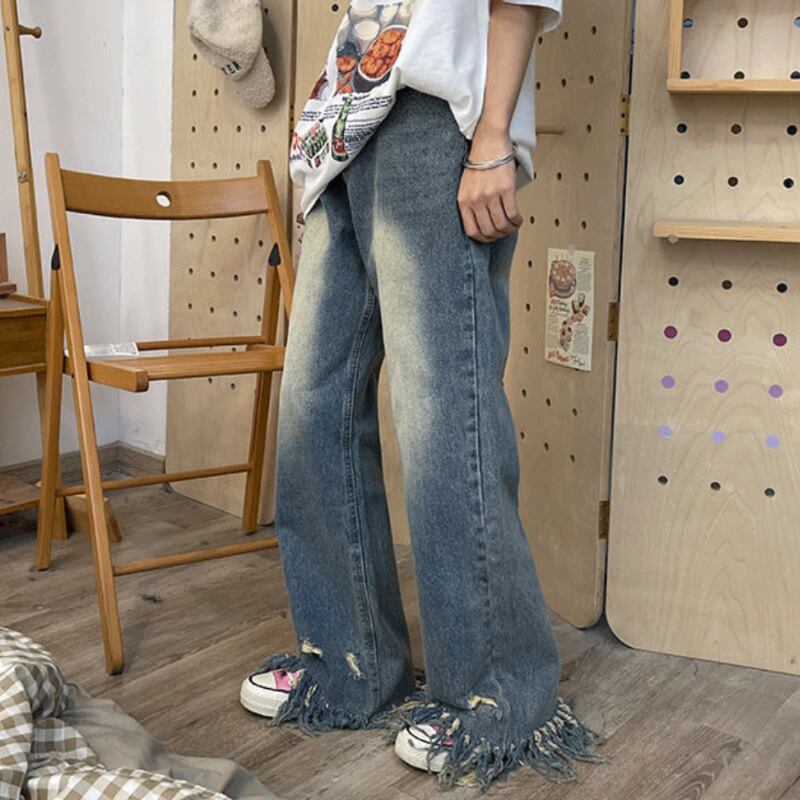 裾がフリンジのようにカットオフされたおしゃれなデニムワイドパンツ✨