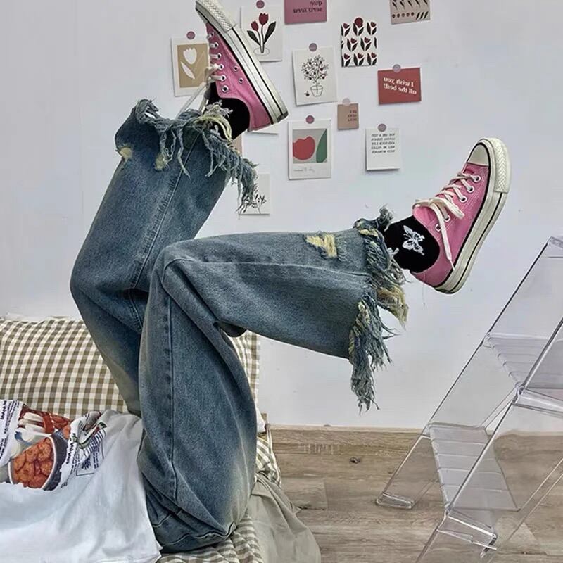 American retro girly fringe denim wide leg pants plus size clothing 0496