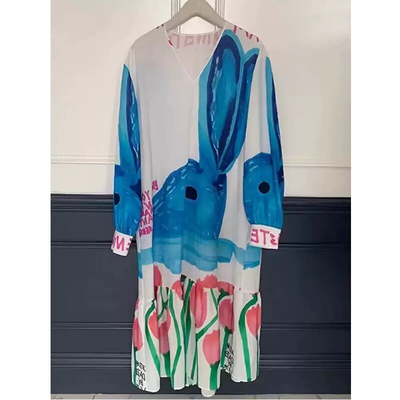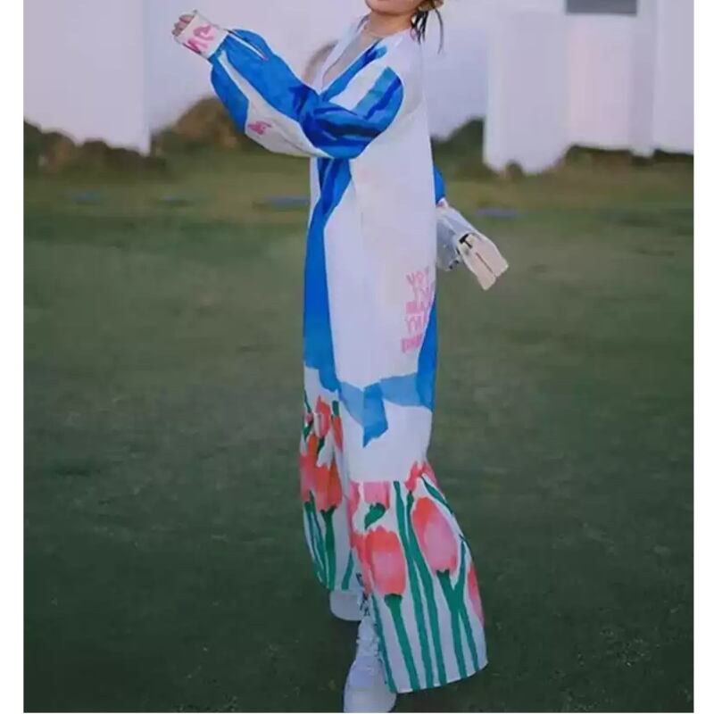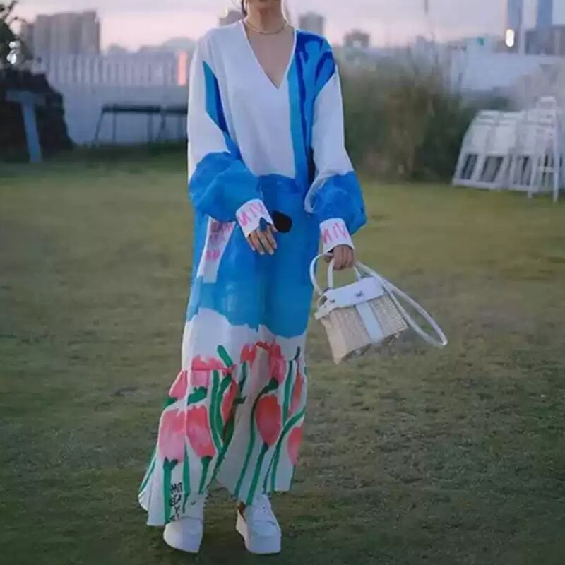 美しいピンクチューリップの絵が描かれたワンピース✨