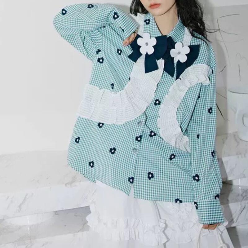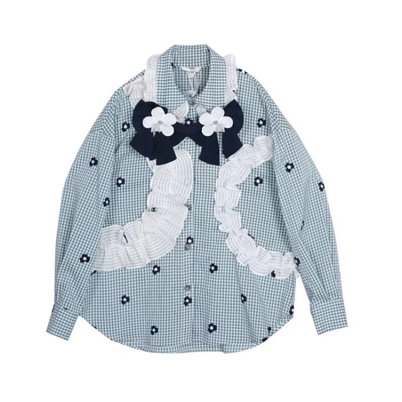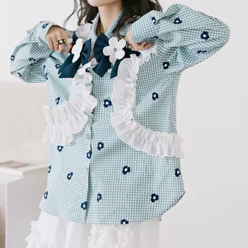 レトロガーリーな花とリボン、フリルの可愛い組み合わせのブラウス✨