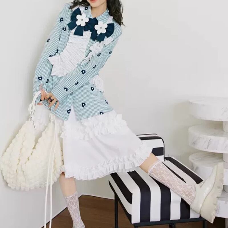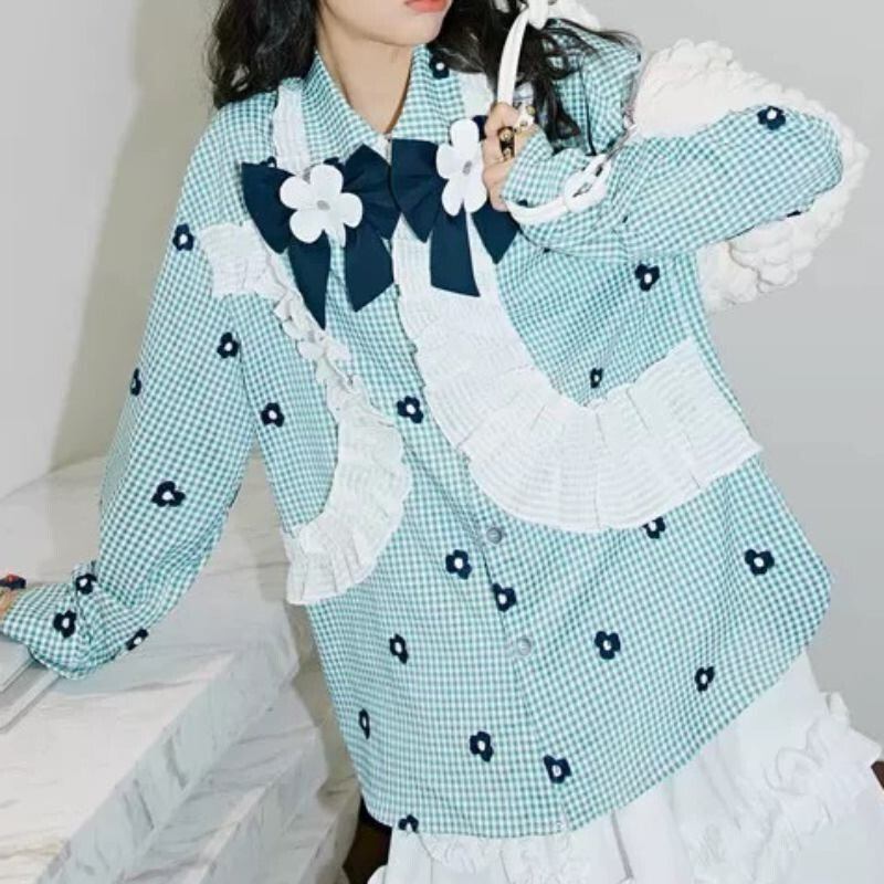 retro girly flower ribbon ruffled baby collar shirt 0714