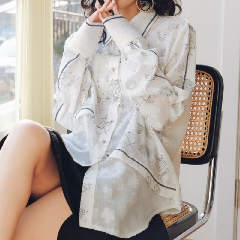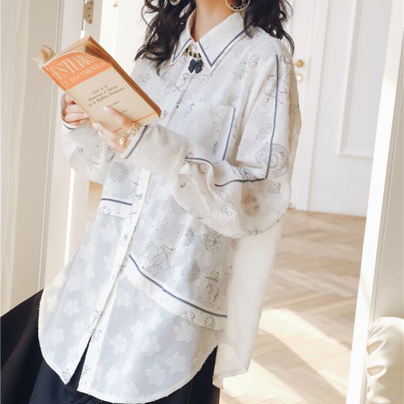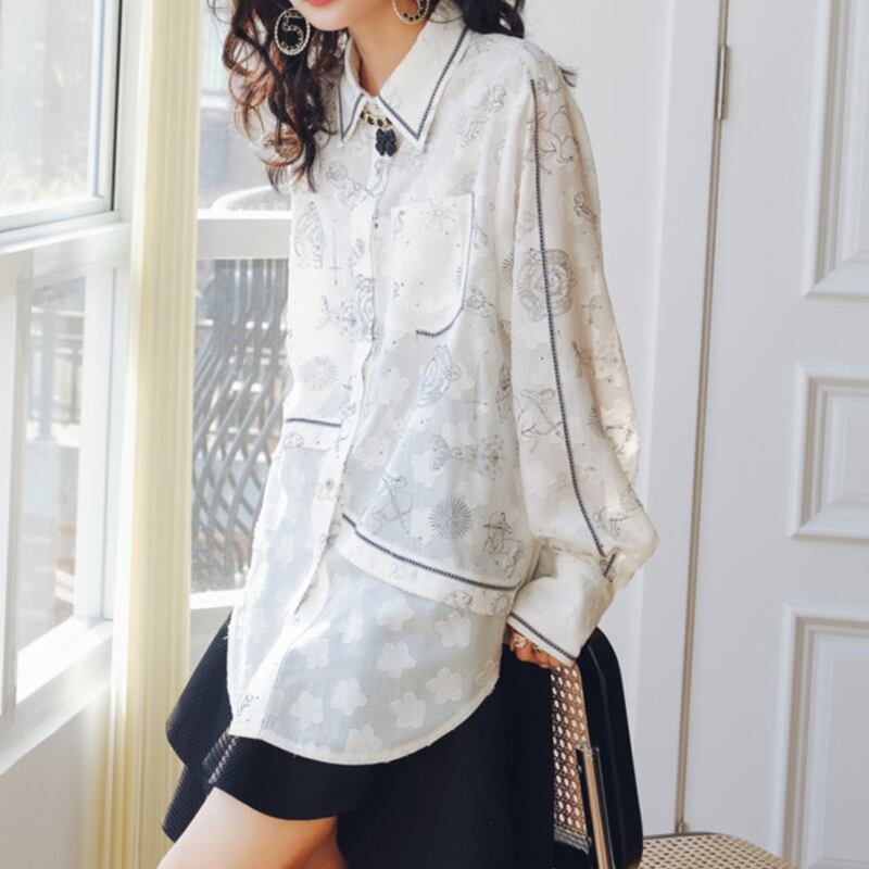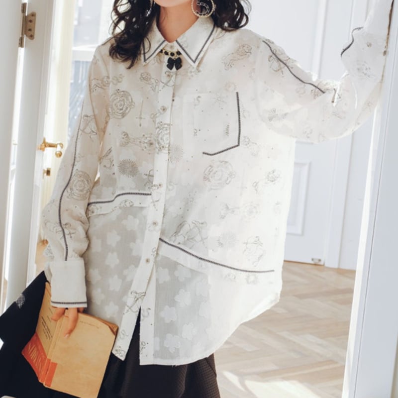 キュートな花柄と惹きこまれるような美しい星座の柄が素敵な白ブラウス✨