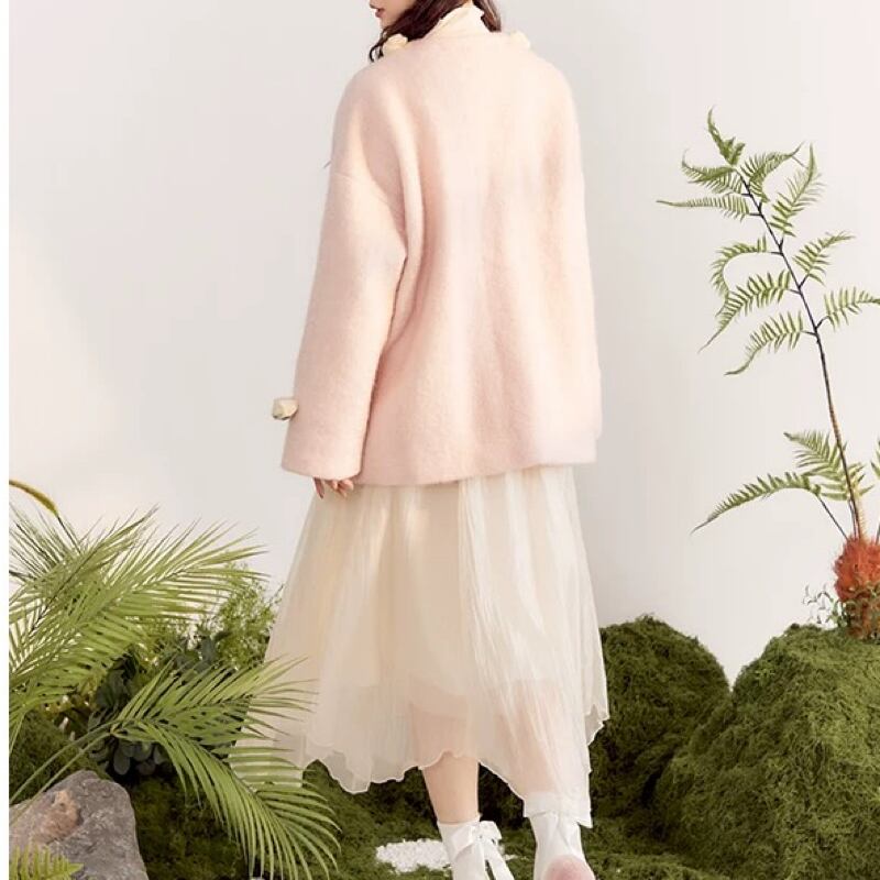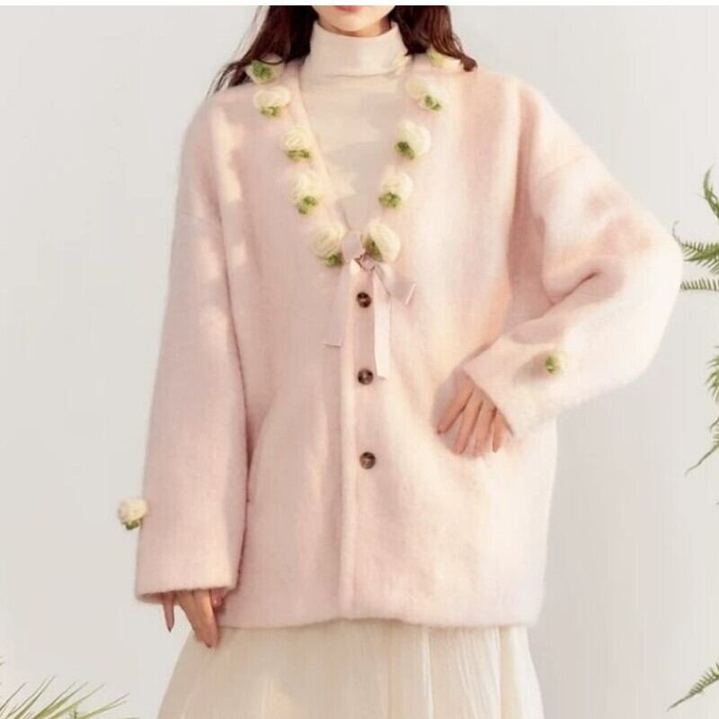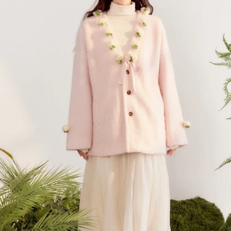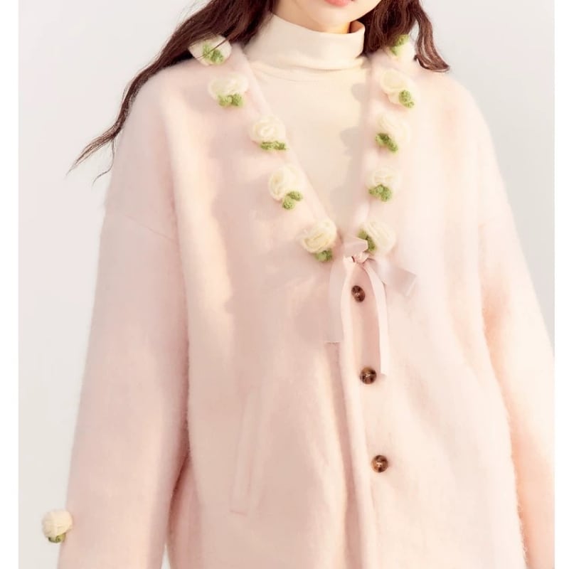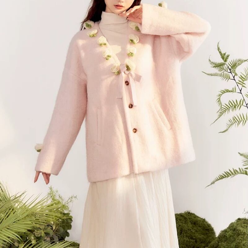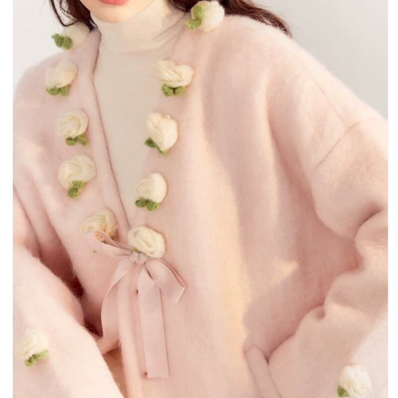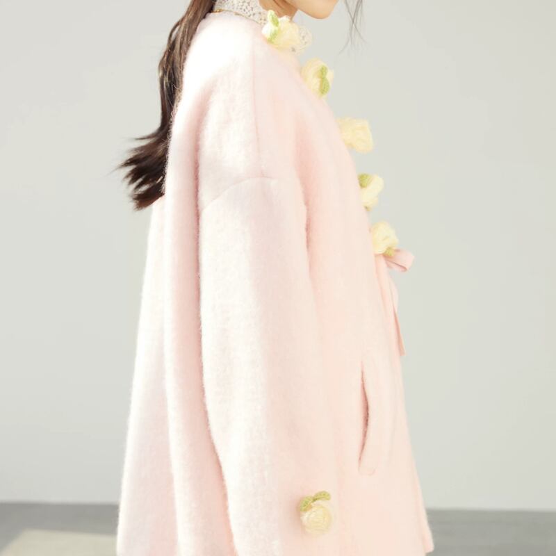 可憐でエレガントな花がついた秋冬コート✨上品なピンクカラーも素敵♪