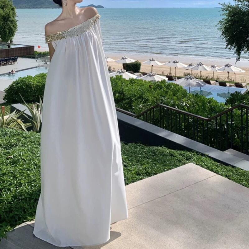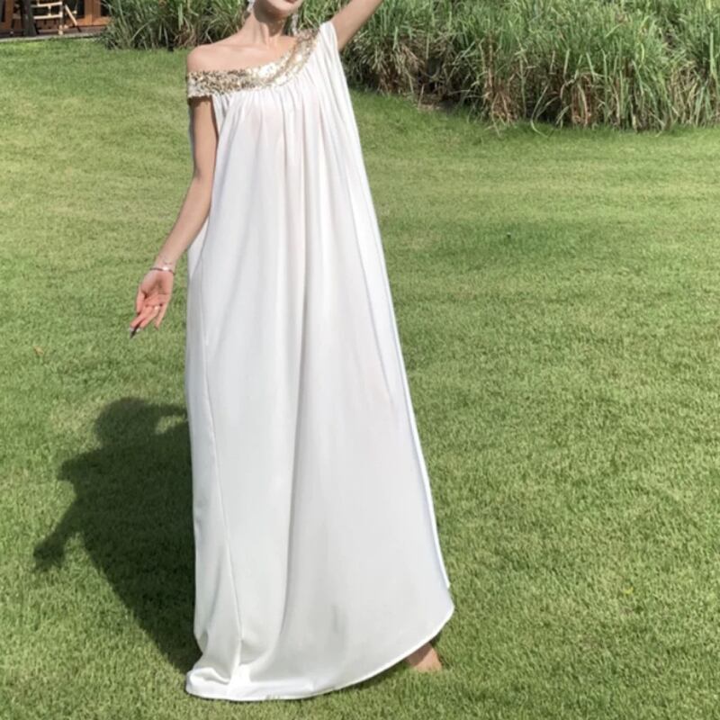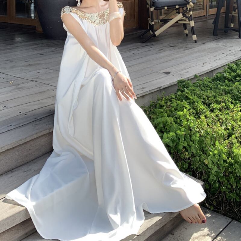 女神のようなふんわりロングホワイトドレス✨