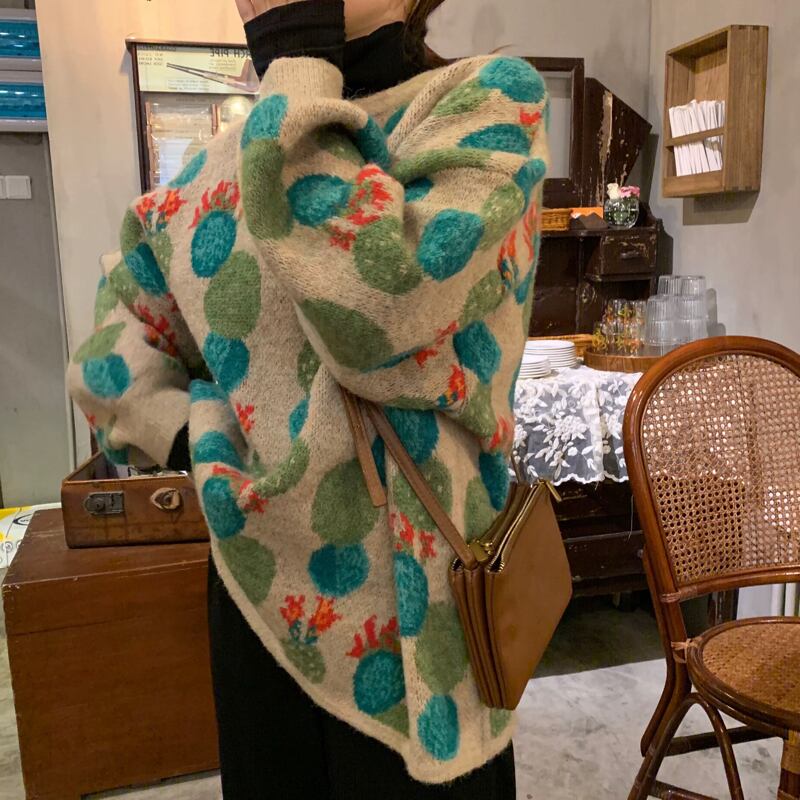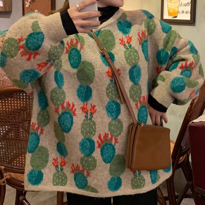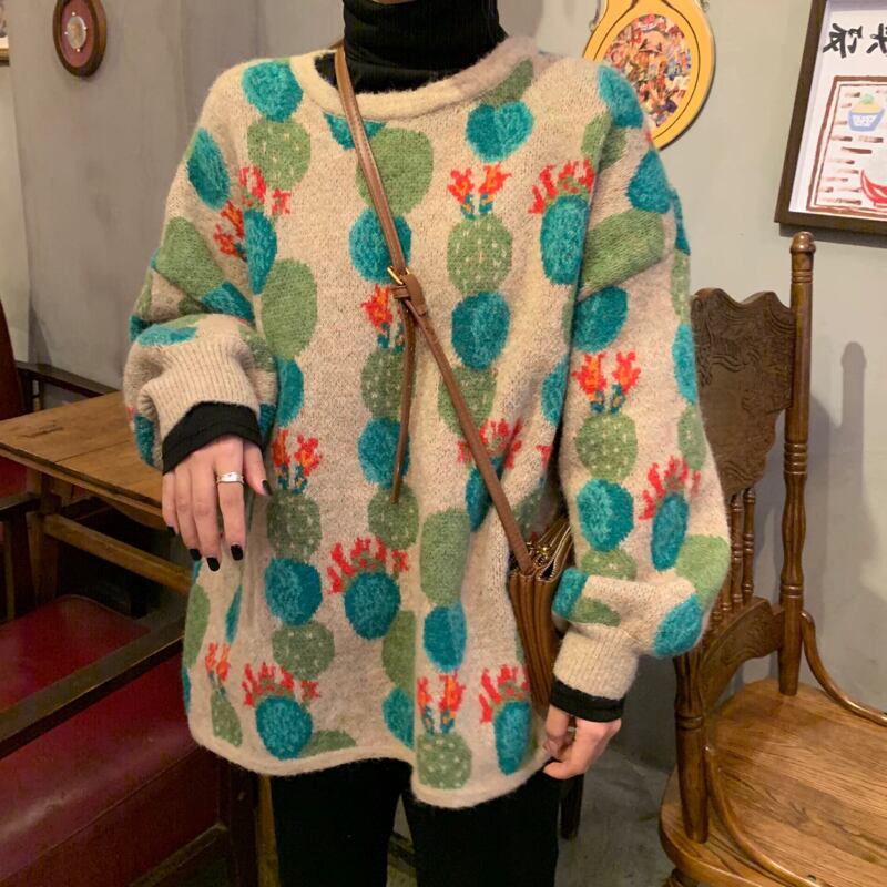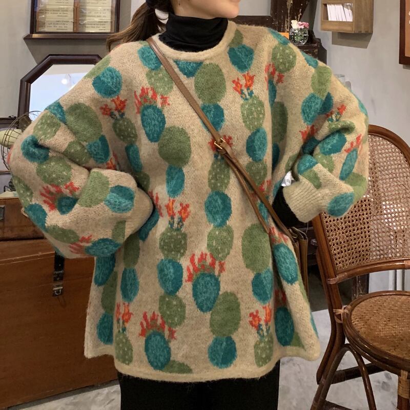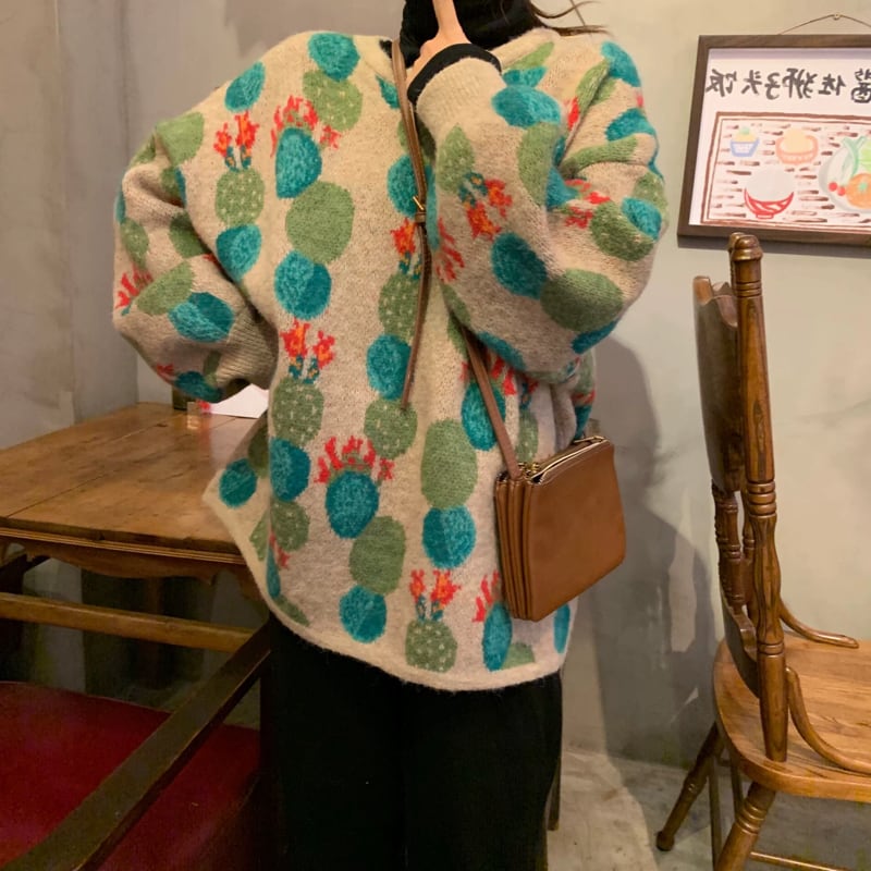 可愛いサボテンの花が散りばめられた個性的なデザインのニットトップス✨