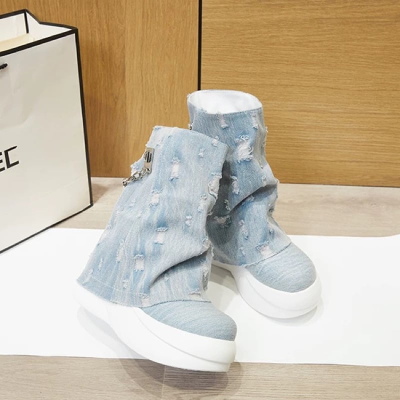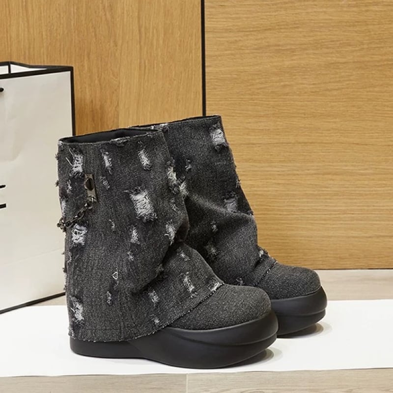 ダメージデニムデザインのおしゃれな秋冬ブーツ✨