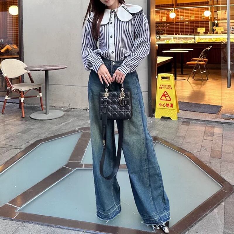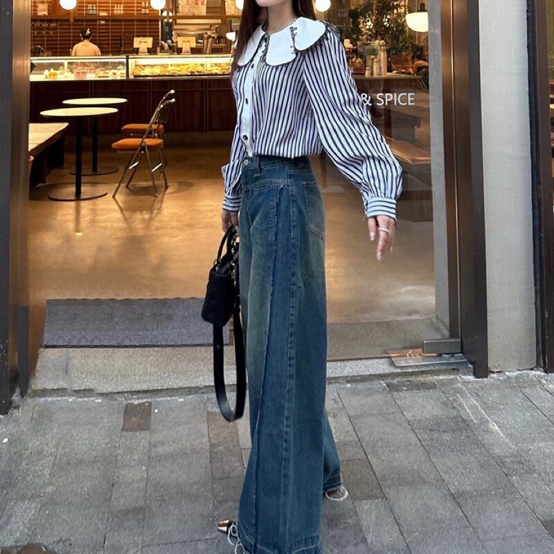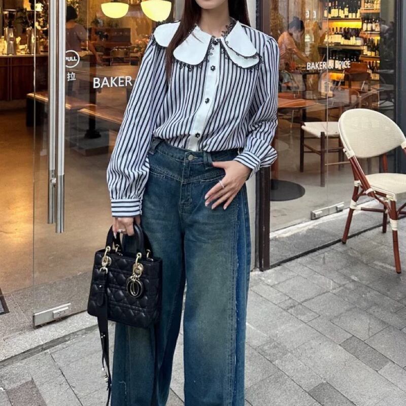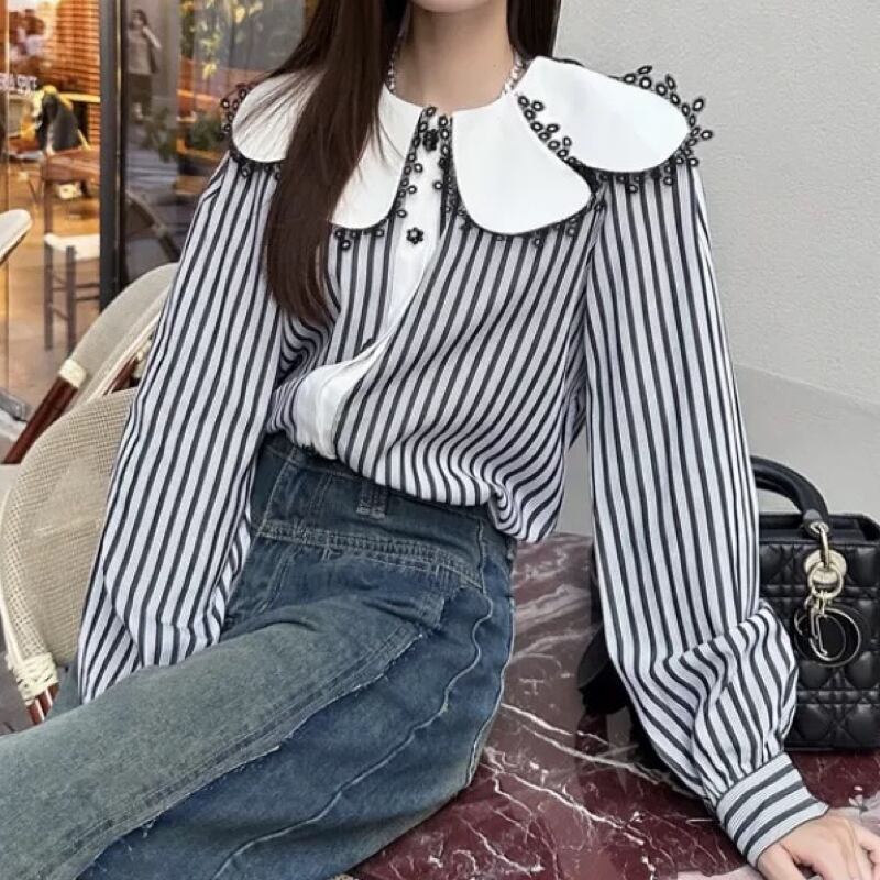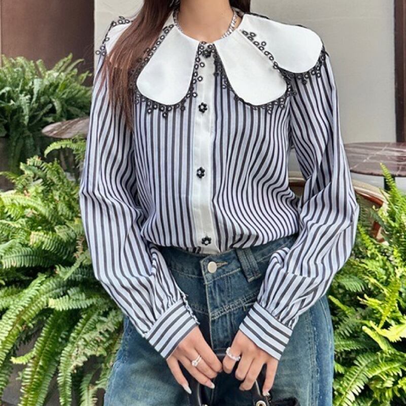 個性的な襟のデザインと小さな花ボタンが素敵なストライプブラウス✨