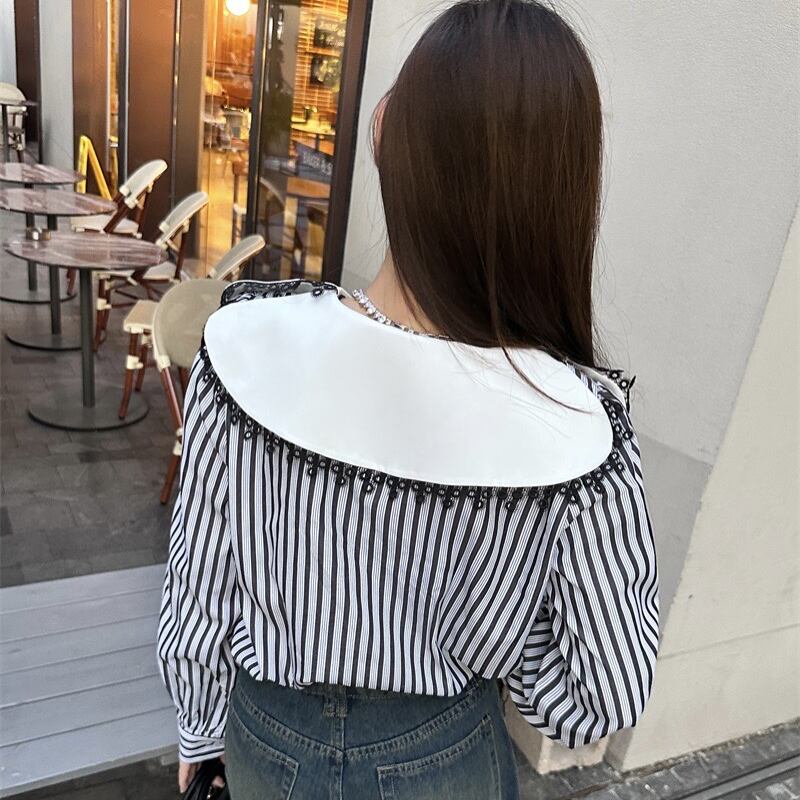 girly retro unique collar design stitching lace striped shirt 0871