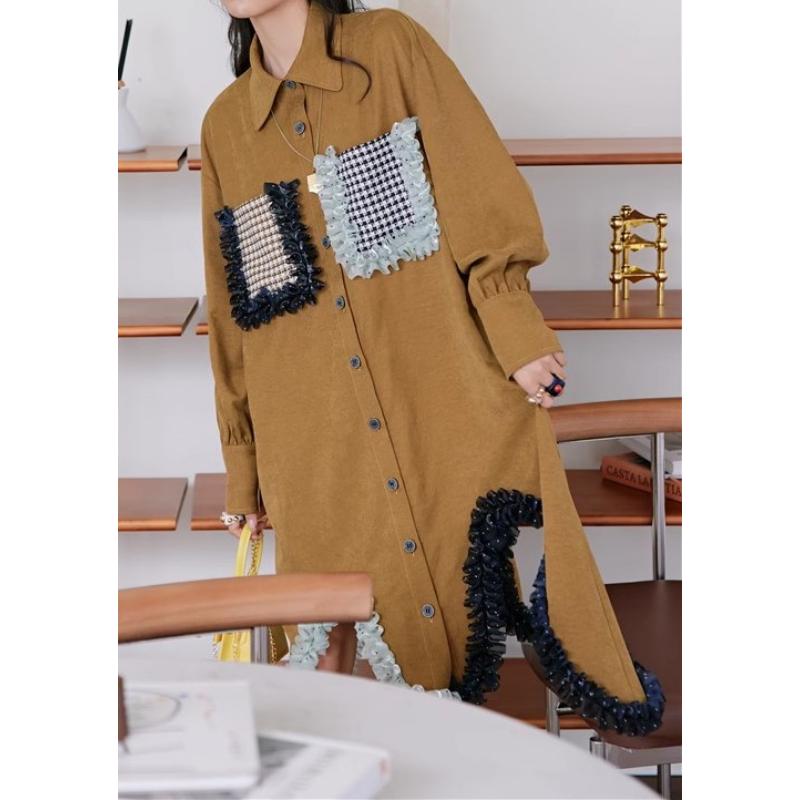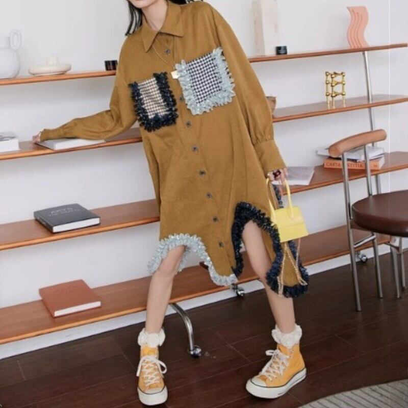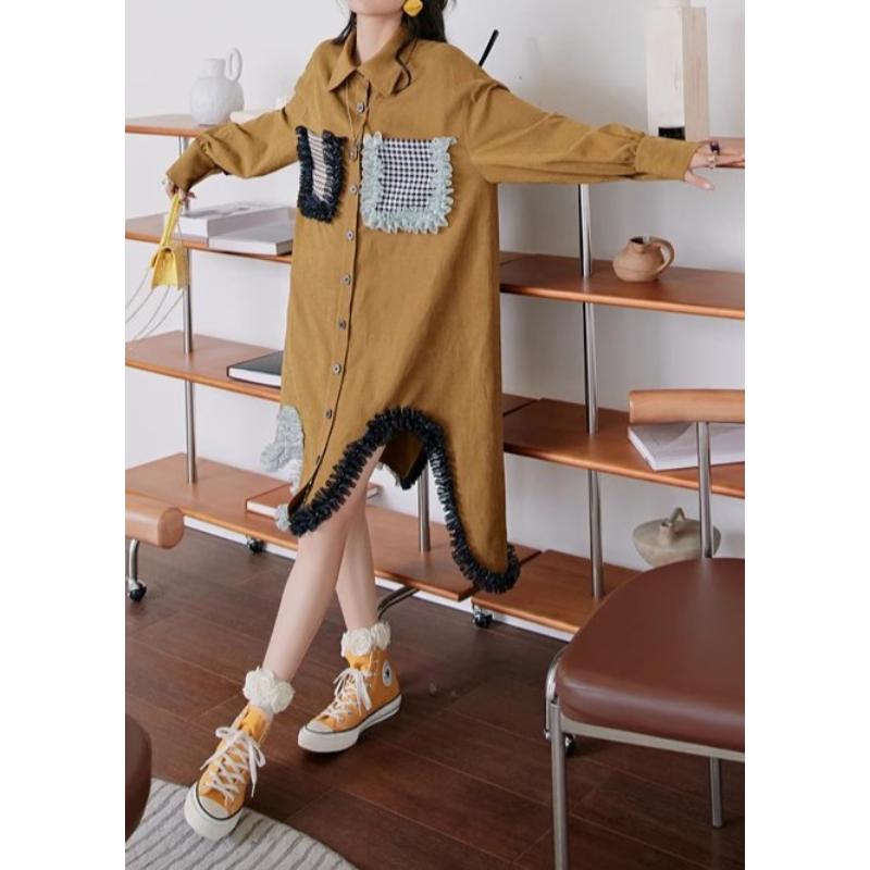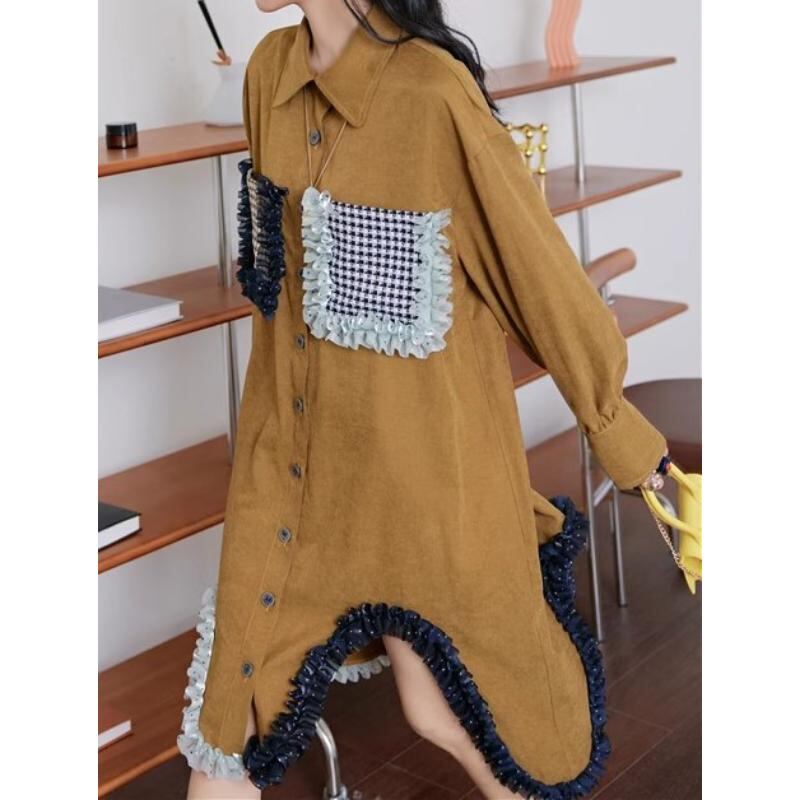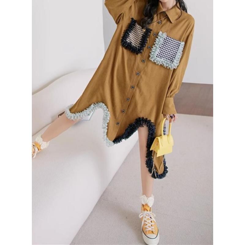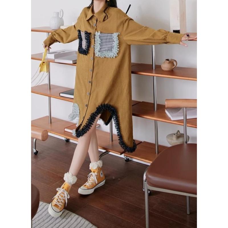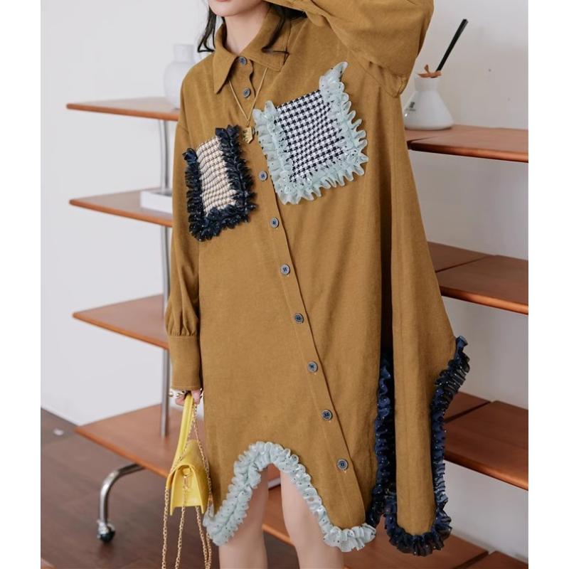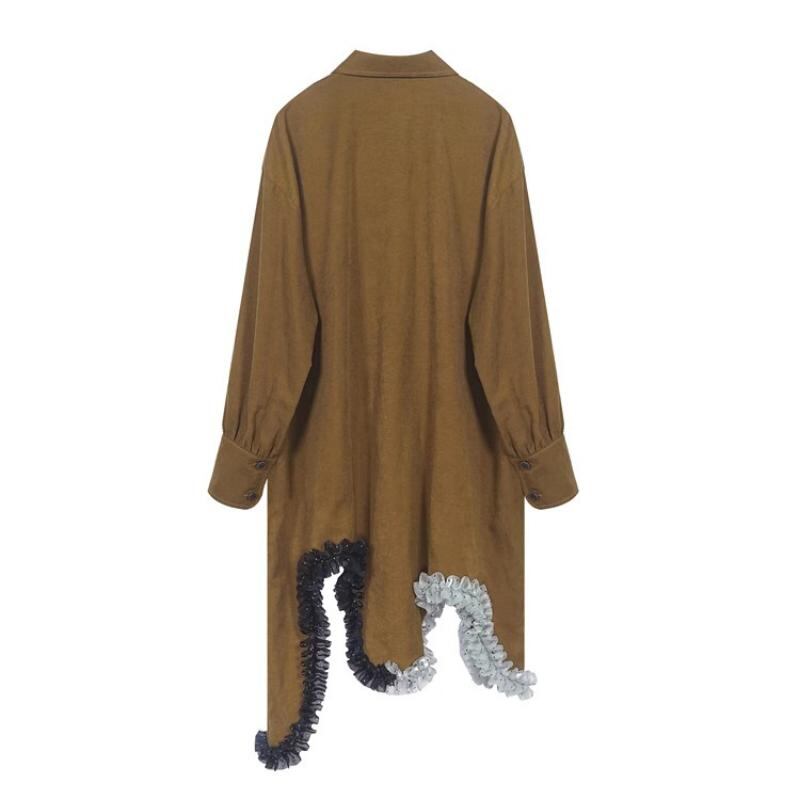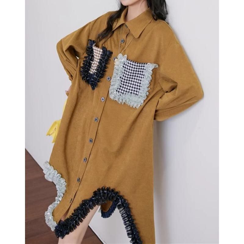 裾がメッシュフリルのついた波線になっている個性的デザインのシャツワンピ✨