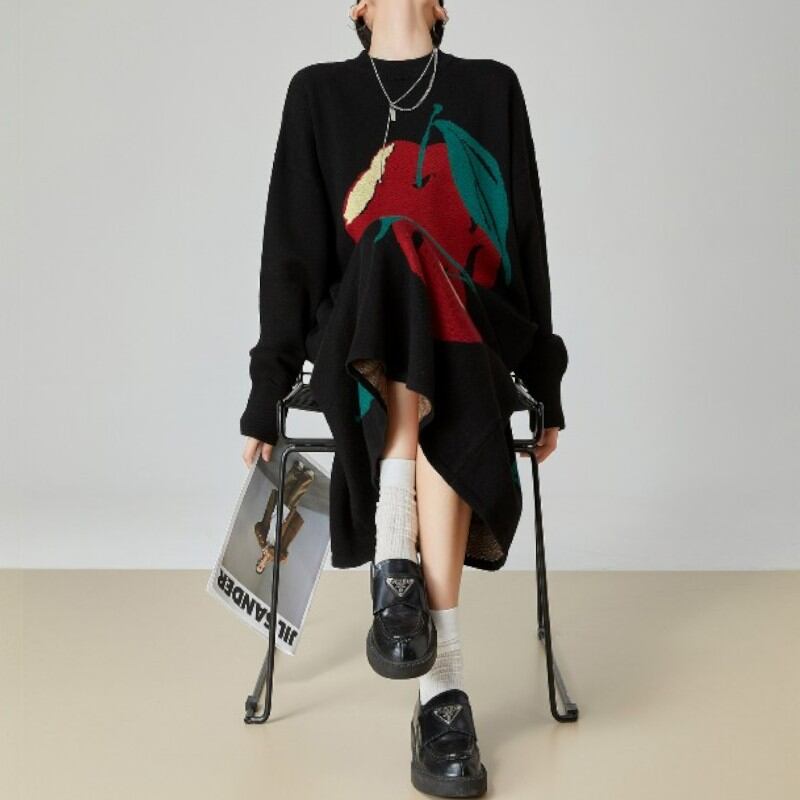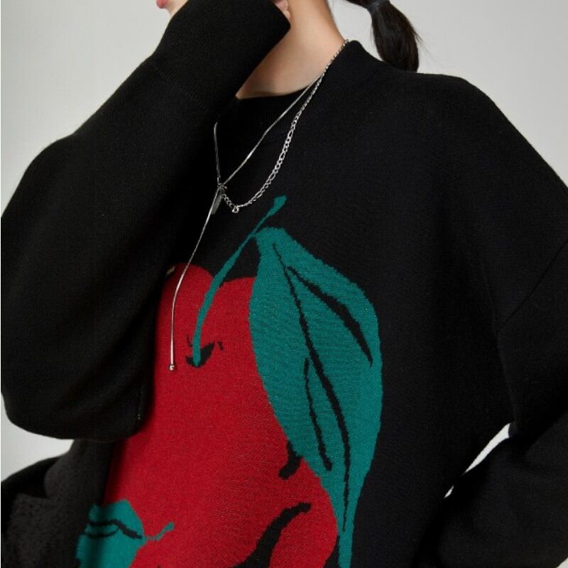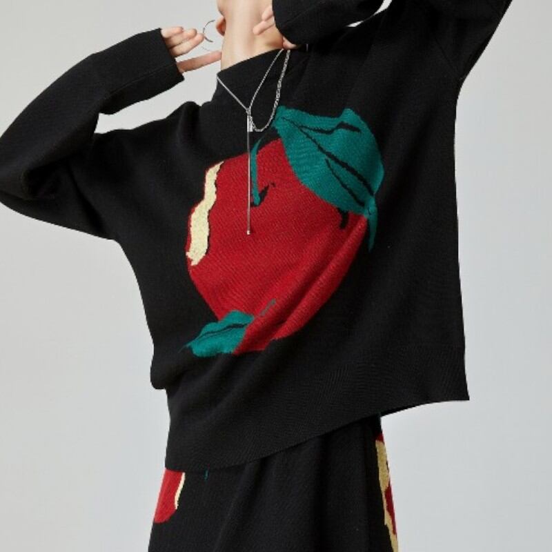 大きな口を開けてほおばりたくなるようなリンゴが描かれたニットトップス✨
