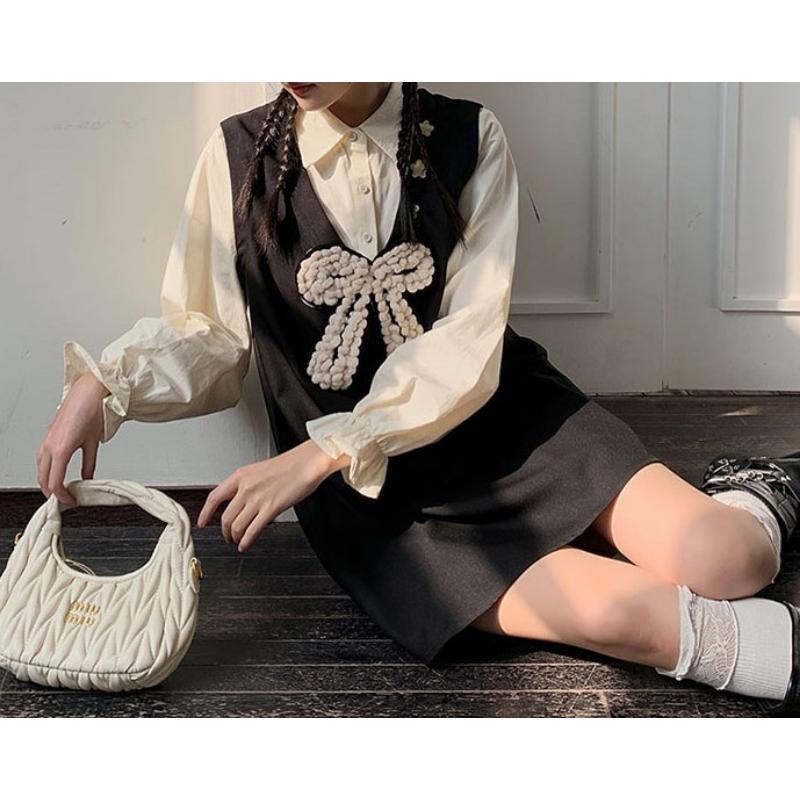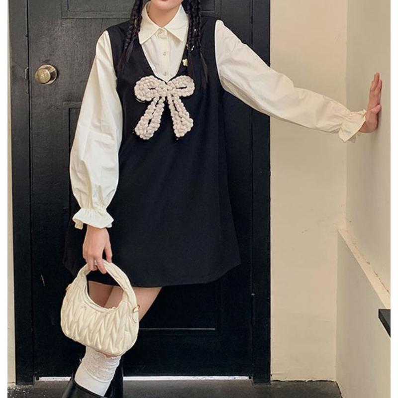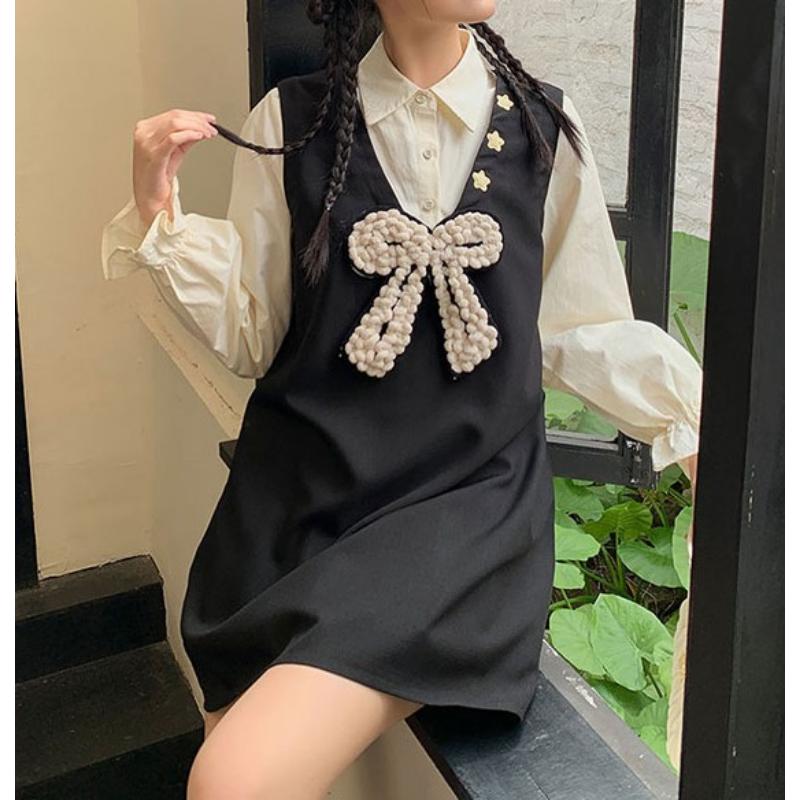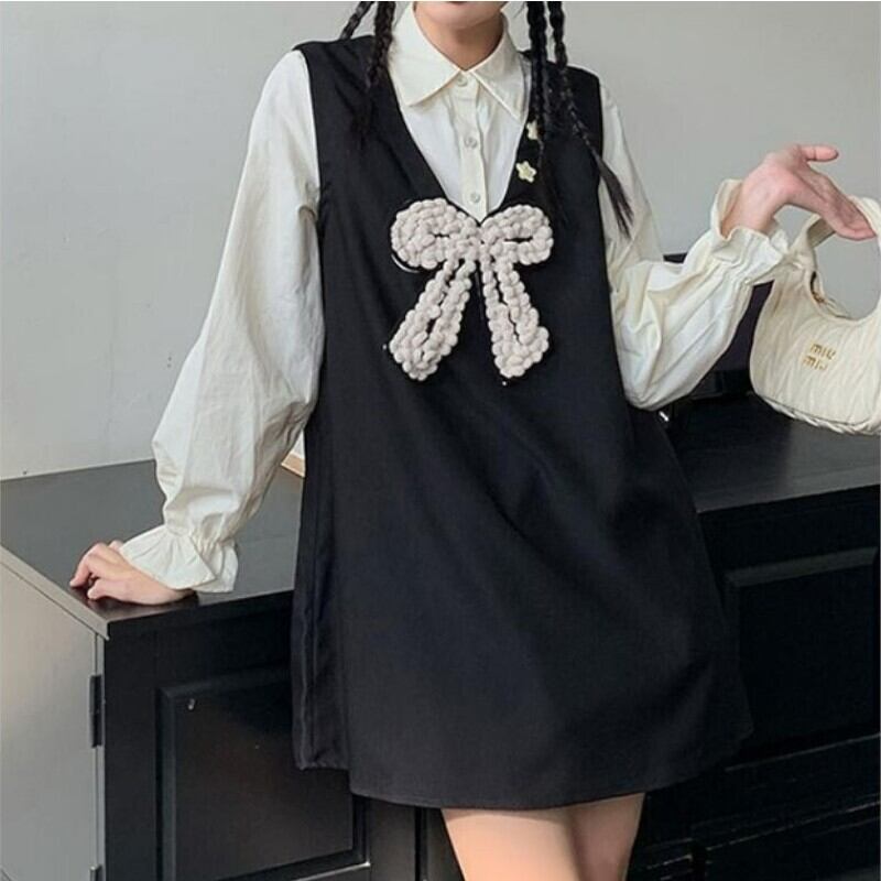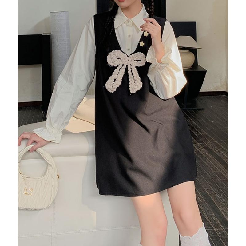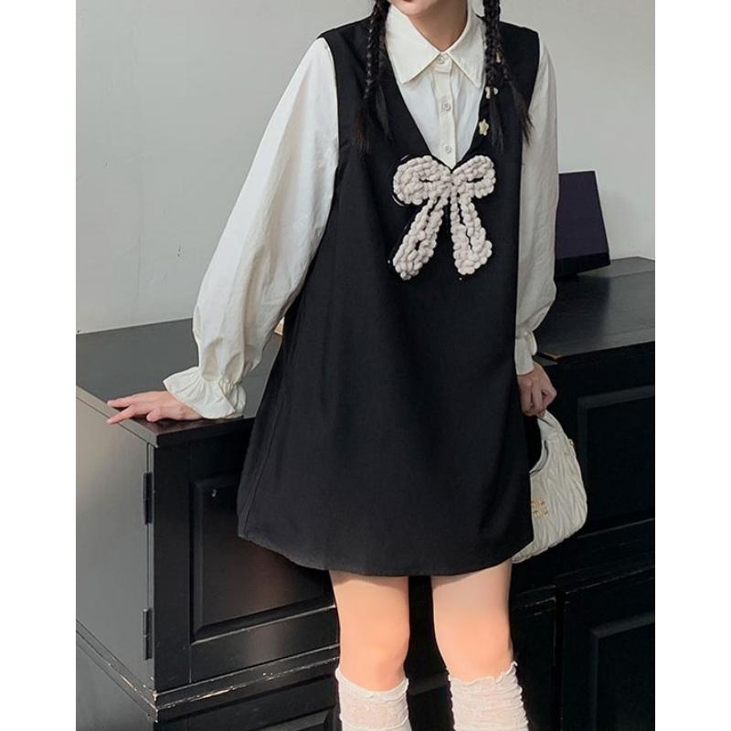 girly cute princess style ribbon fake two-piece shirt dress 0786