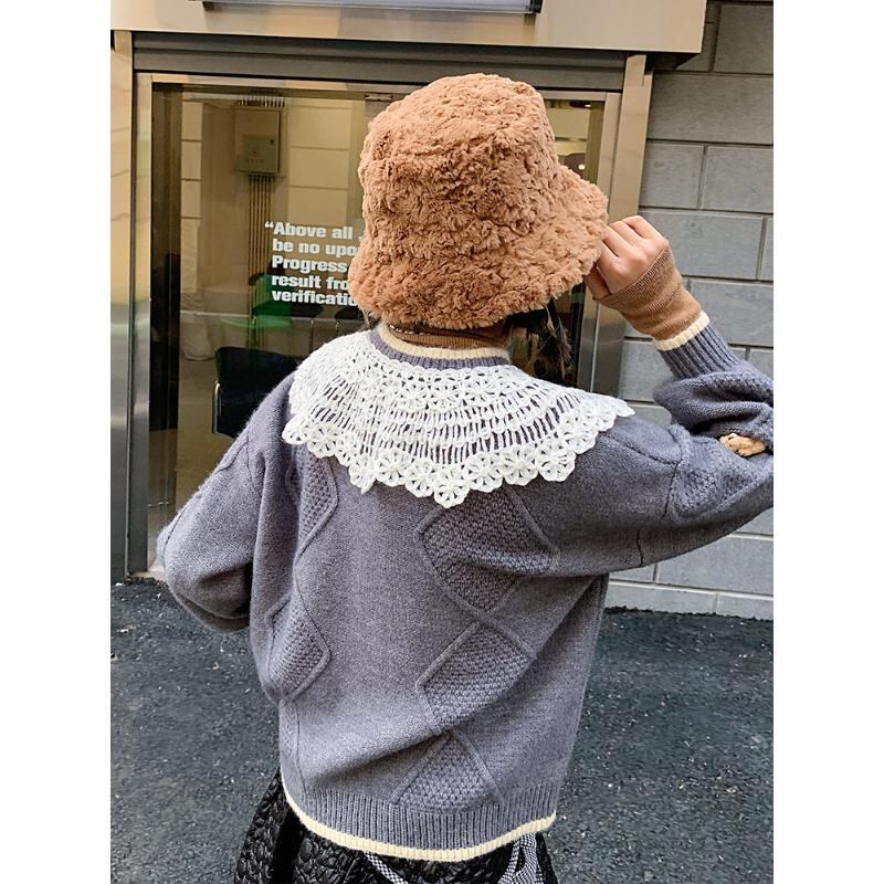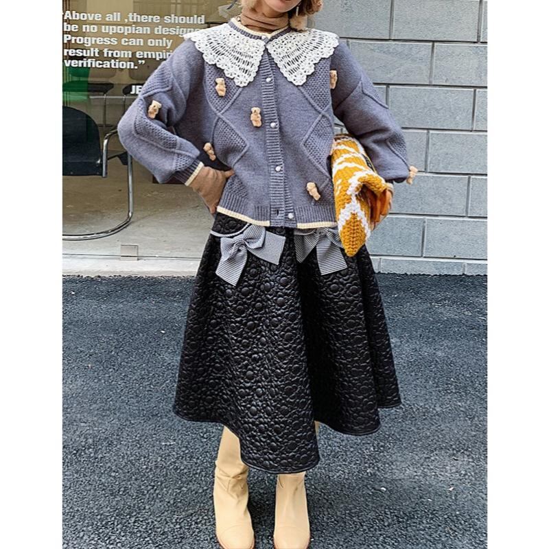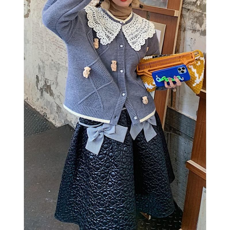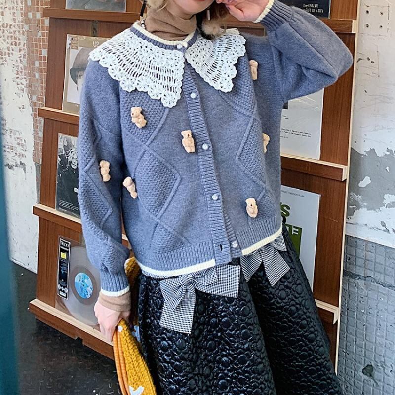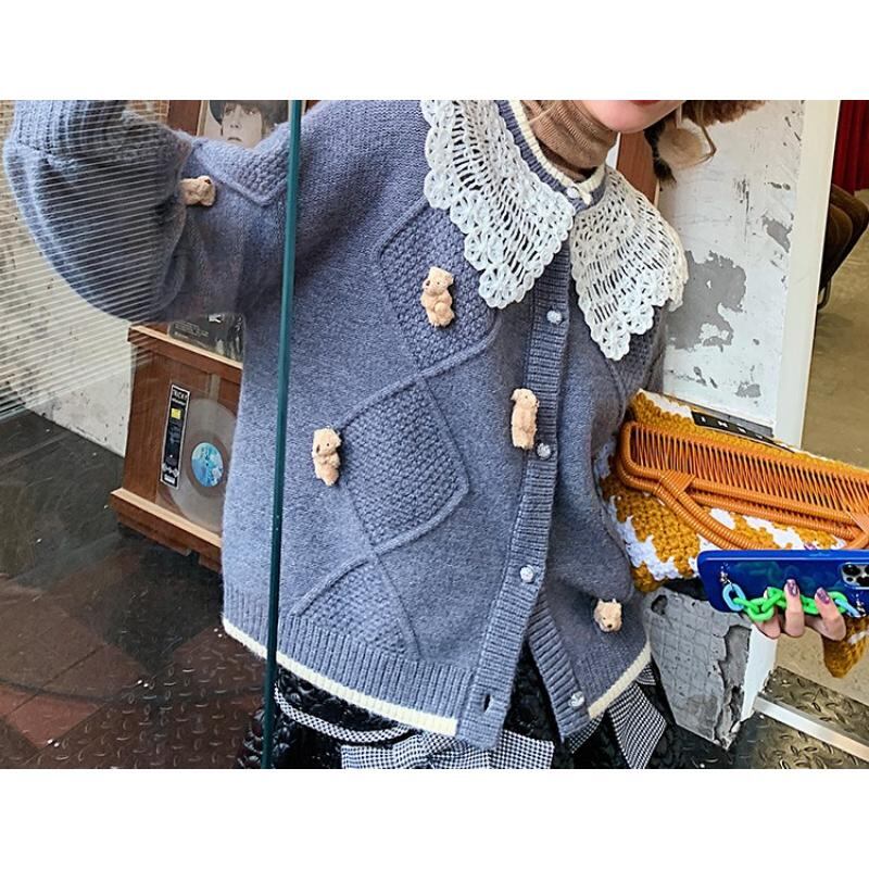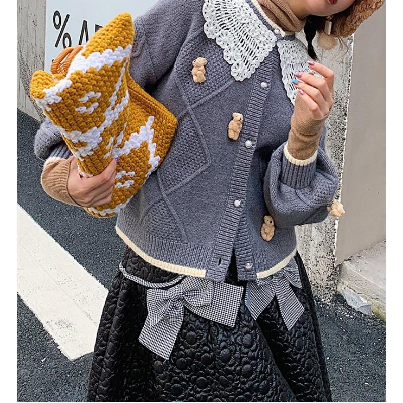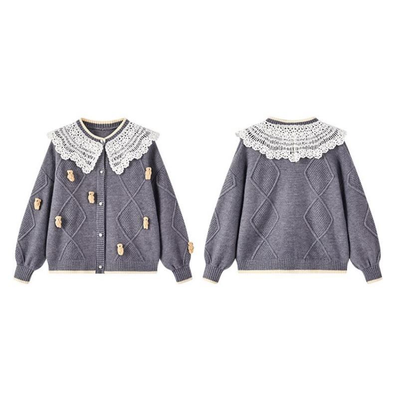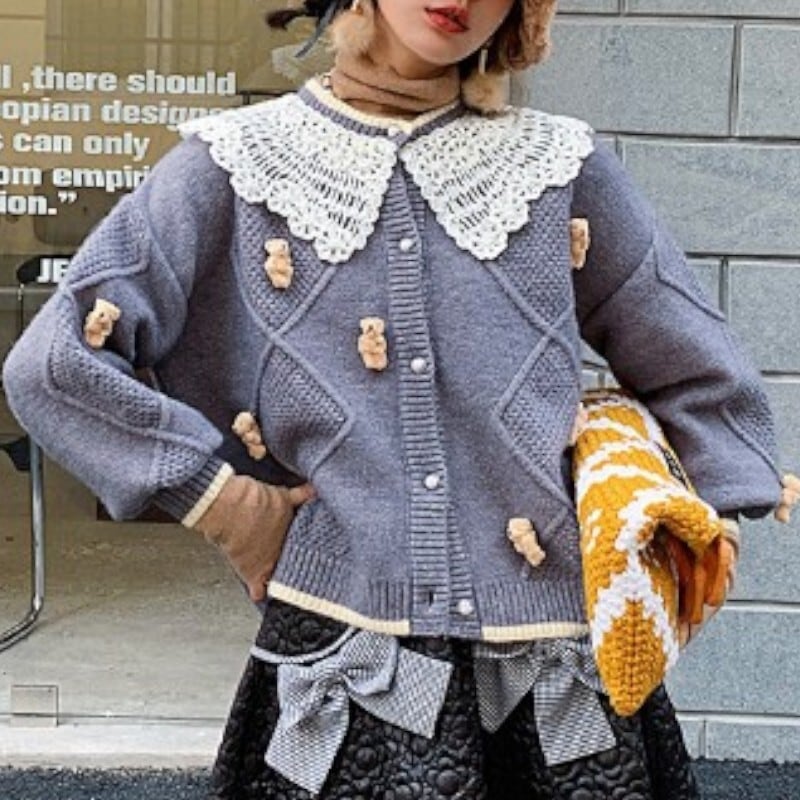 ラブリーな熊がついていて、ガーリーなレースカラーのニットカーディガン✨
