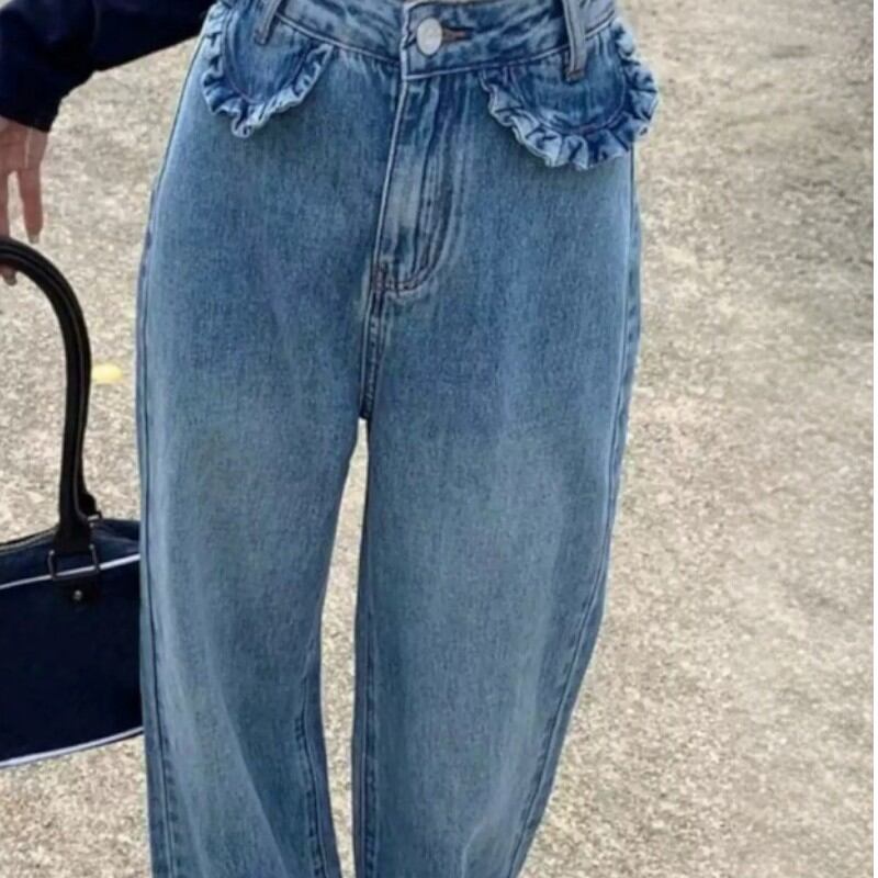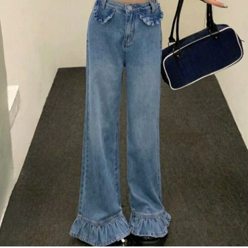 フェイクポケットと裾にフリルがついたキュートなデニムパンツ✨