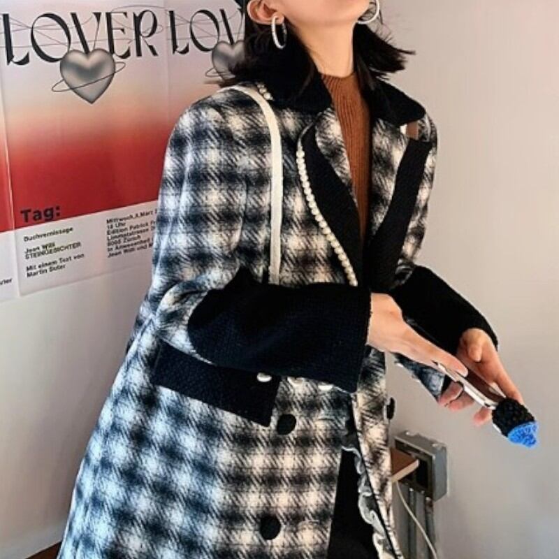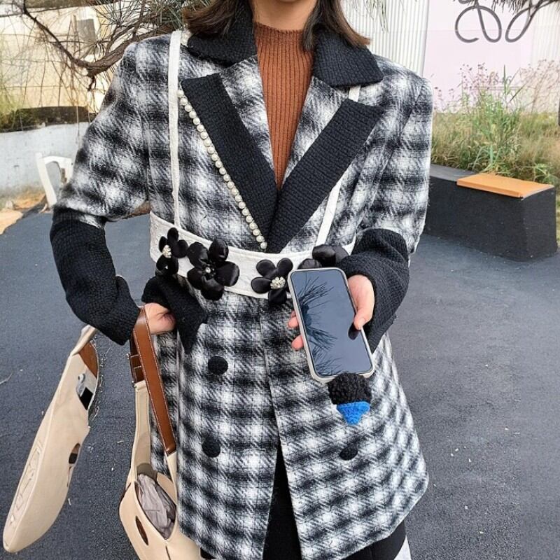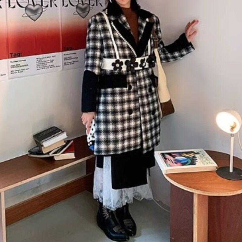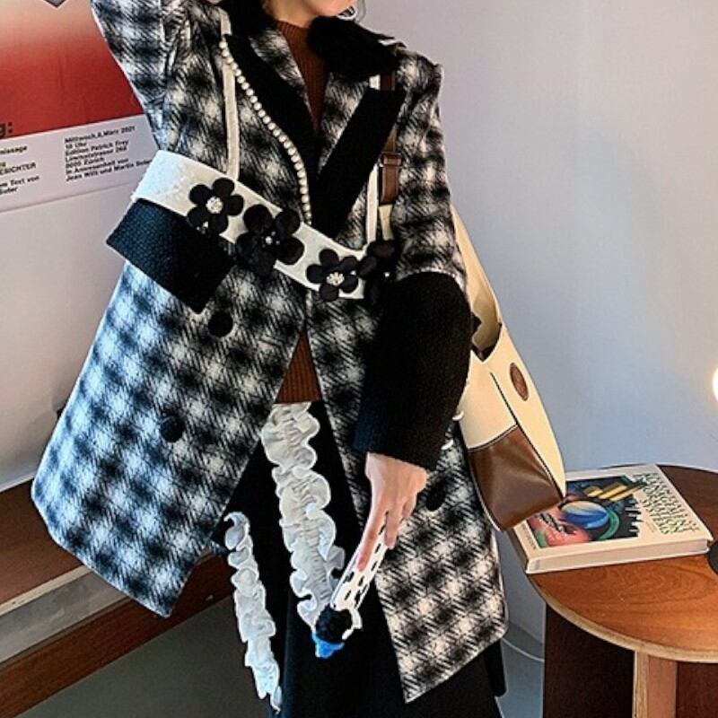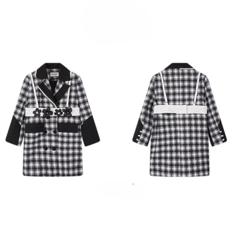 レトロなチェック柄とシルエットのコートにキュートな花がついたおしゃれなコート✨