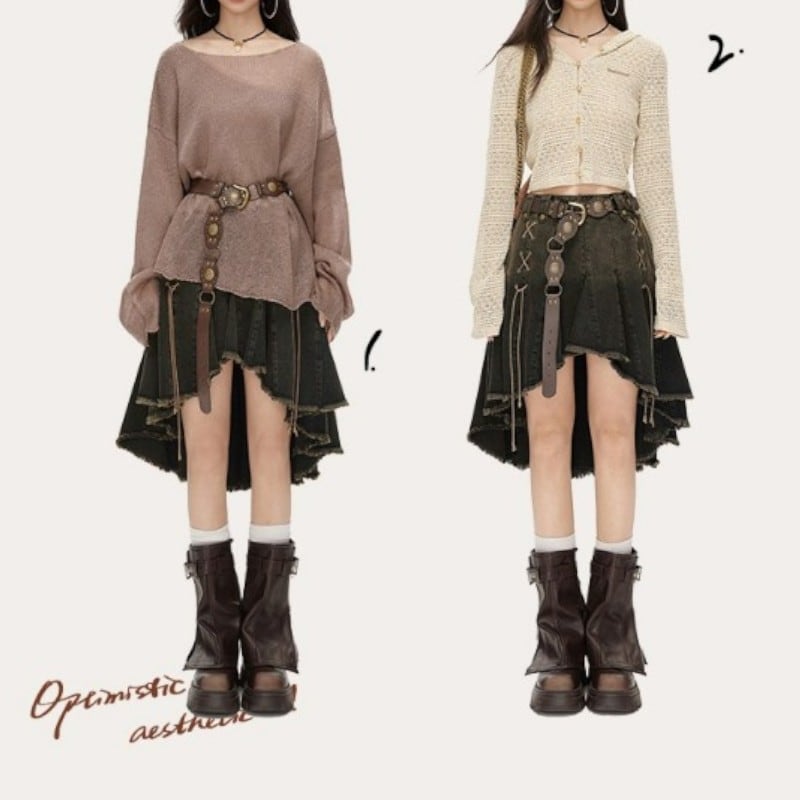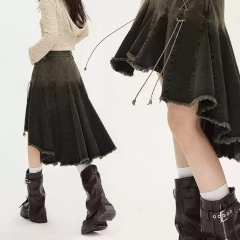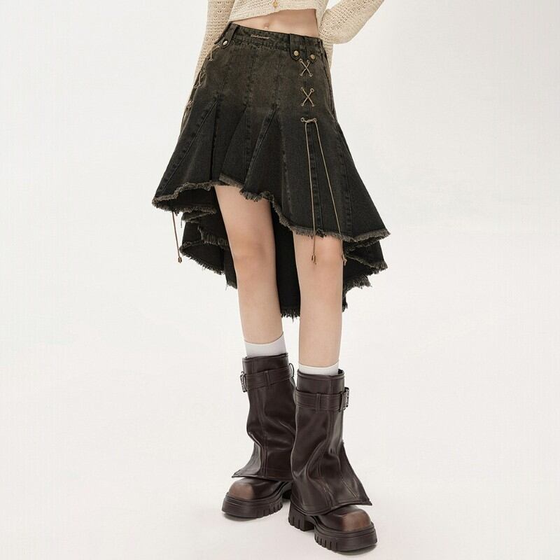 大きいサイズのアシンメトリーなヘムラインが目を惹くデニムスカート。