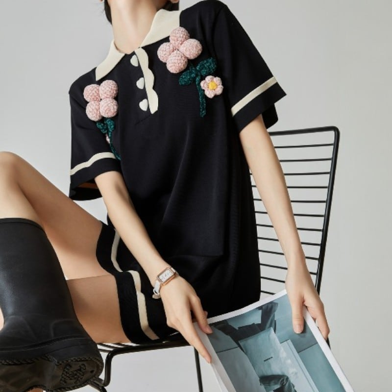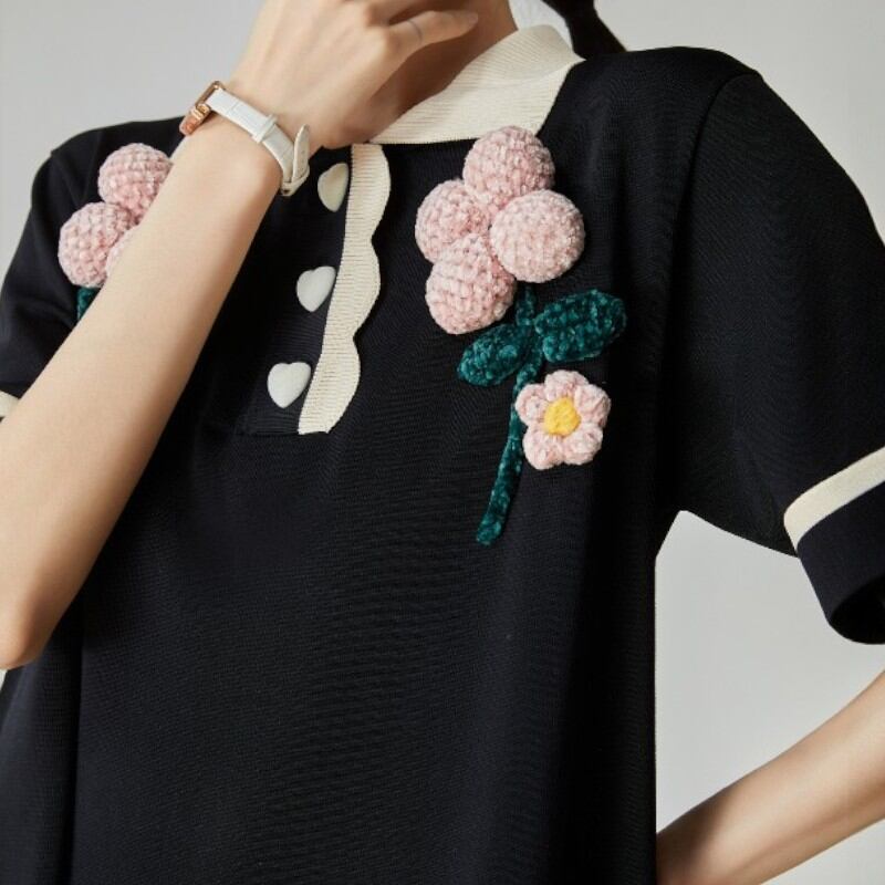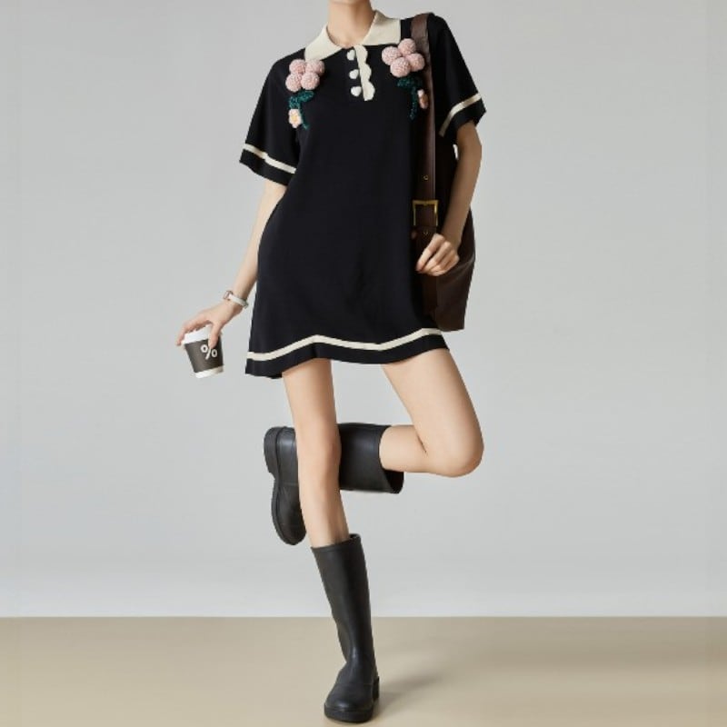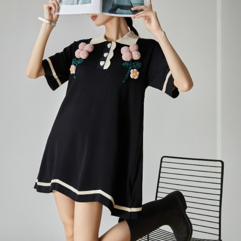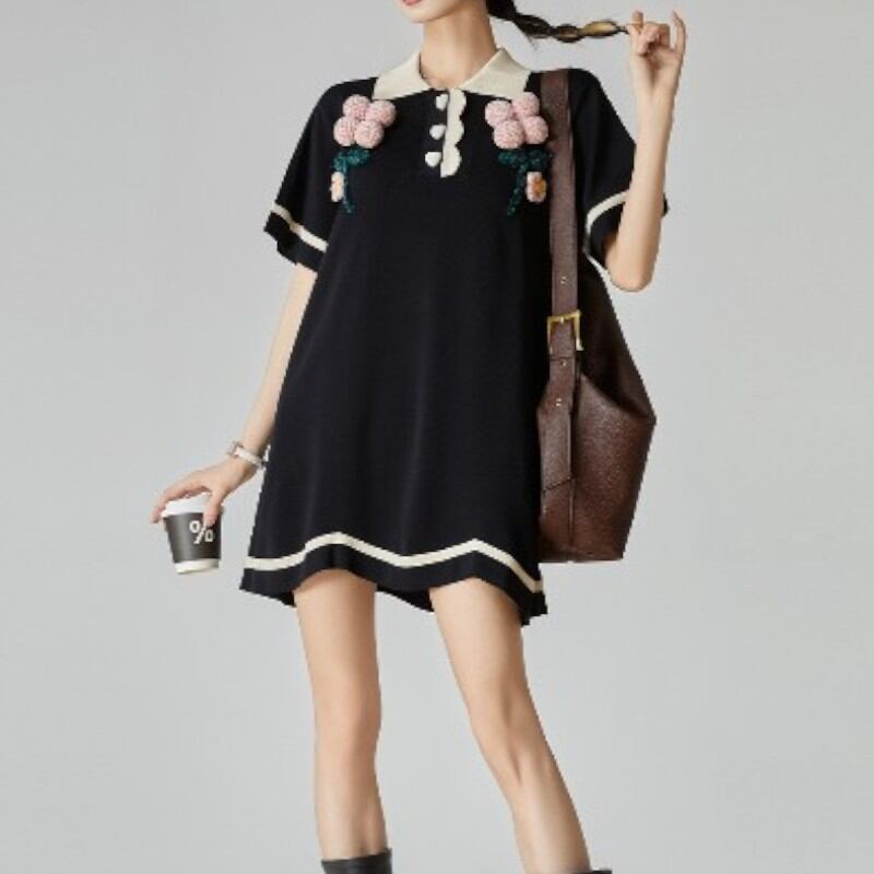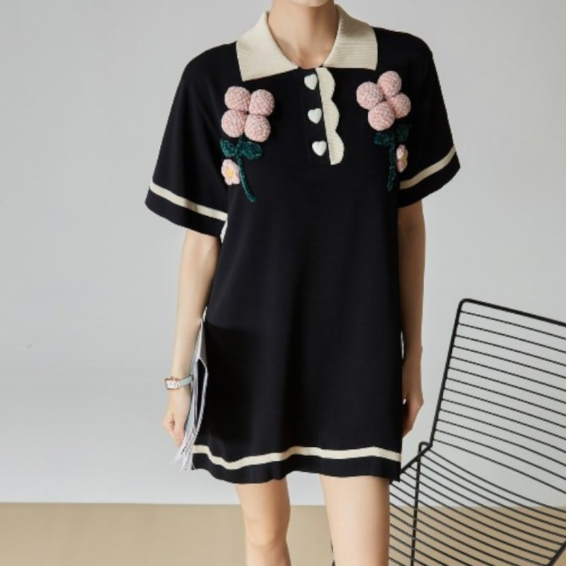 可愛らしいピンクのお花のモチーフがポイントのポロシャツワンピース✨